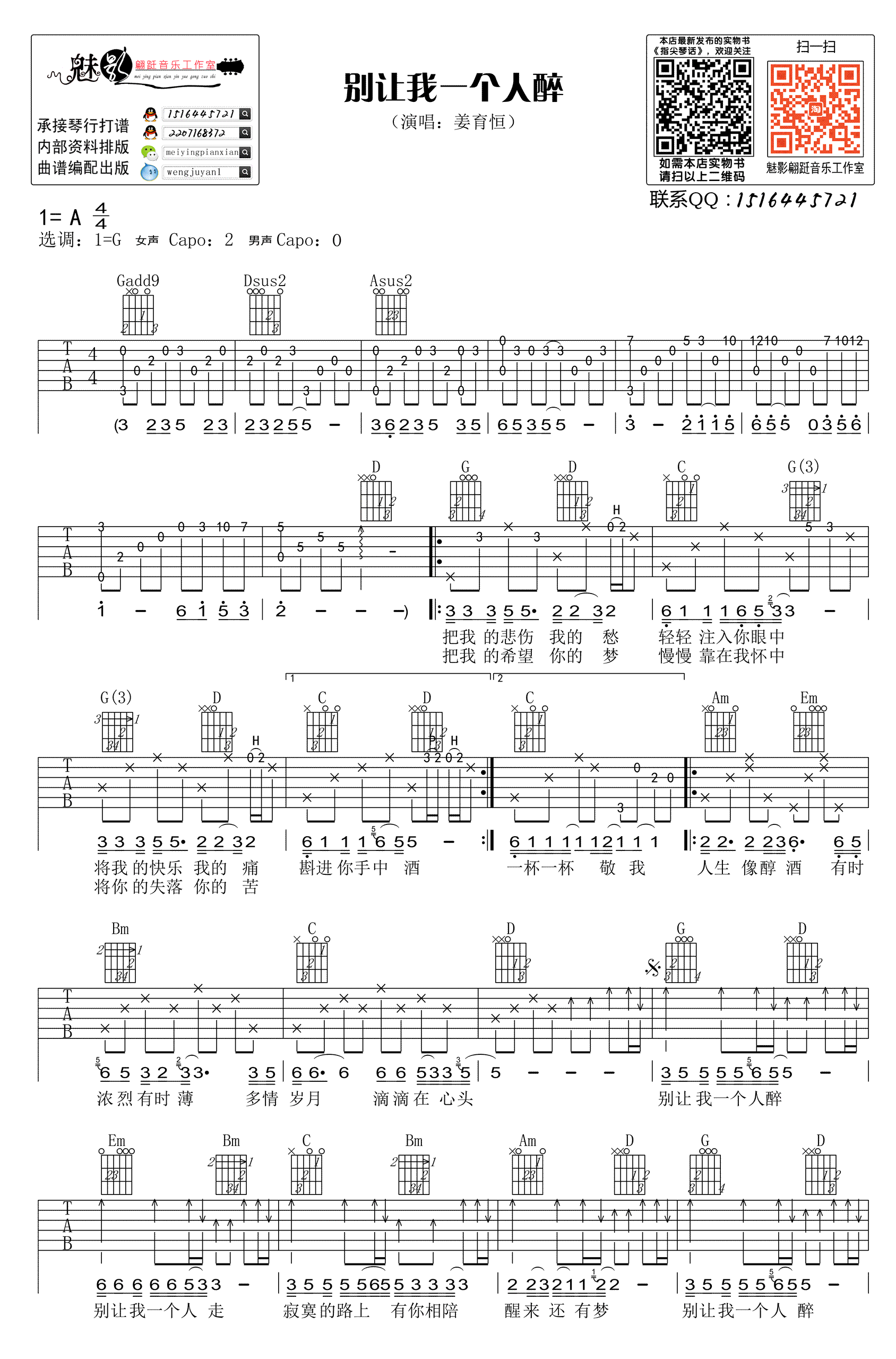 别让我一个人醉吉他谱,姜育恒演唱的一首经典老歌,原调A,选用G调指法,女生变调夹夹第二品,男生不夹,别让我一个人醉六线谱,高清图片弹唱谱,魅影翩跹编配出品,吉他吧网站上传分享。 不同于酒入愁肠的短暂迷醉,而是浸耳渗心的永远情酣。人生像醇酒,有时浓烈有时薄,多情岁月,滴滴在心头,这是姜育恒在1993年发行的同名专辑里的一首歌,让我们在心灵深处产生一次又一次的共鸣。