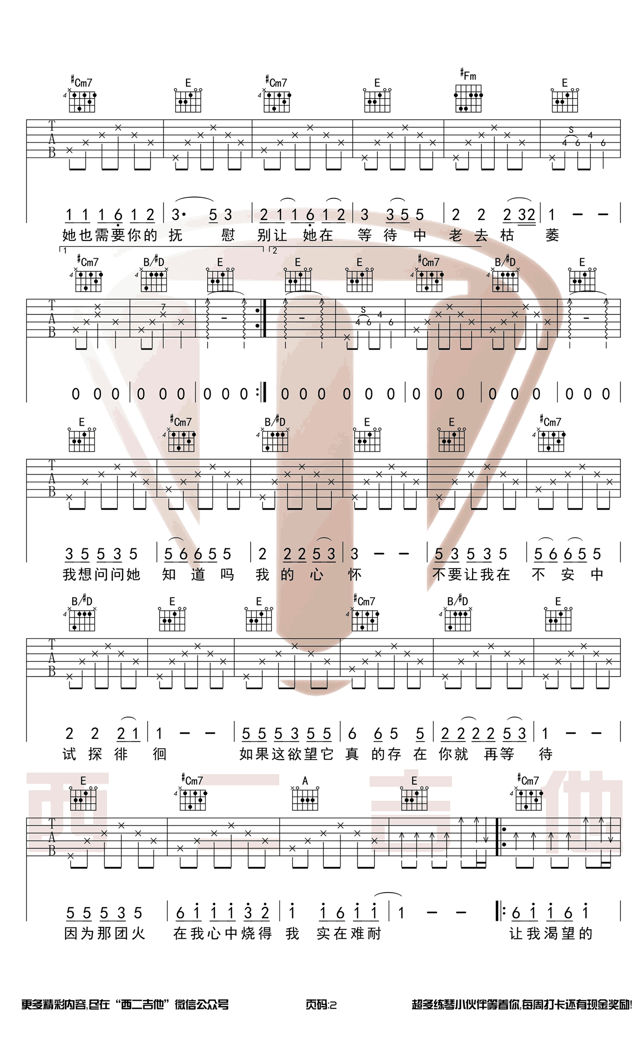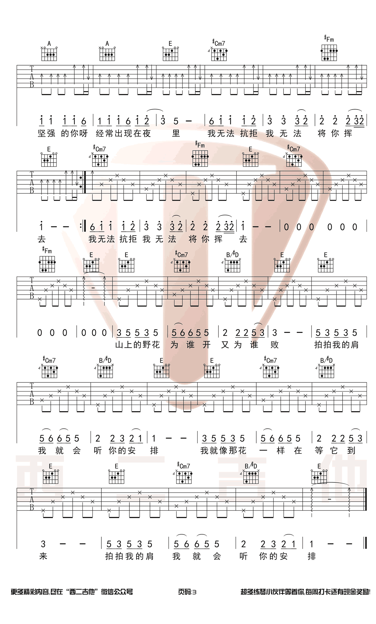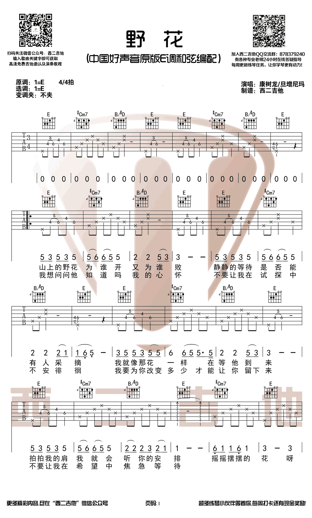 野花吉他谱,《中国好声音》康树龙/旦增尼玛演唱,柔美搭悲情超好听,野花吉他弹唱谱,E调和弦原版编配,不需要变调夹,三张图片六线谱,西二吉他出品。 田震的一首经典老歌,《2018中国好声音》第六期,李健组选手康树龙和旦增尼玛合唱了这首歌曲,一个深沉沧桑,一个柔美空灵,两个不同的风格赋予这首经典不一样的味道。