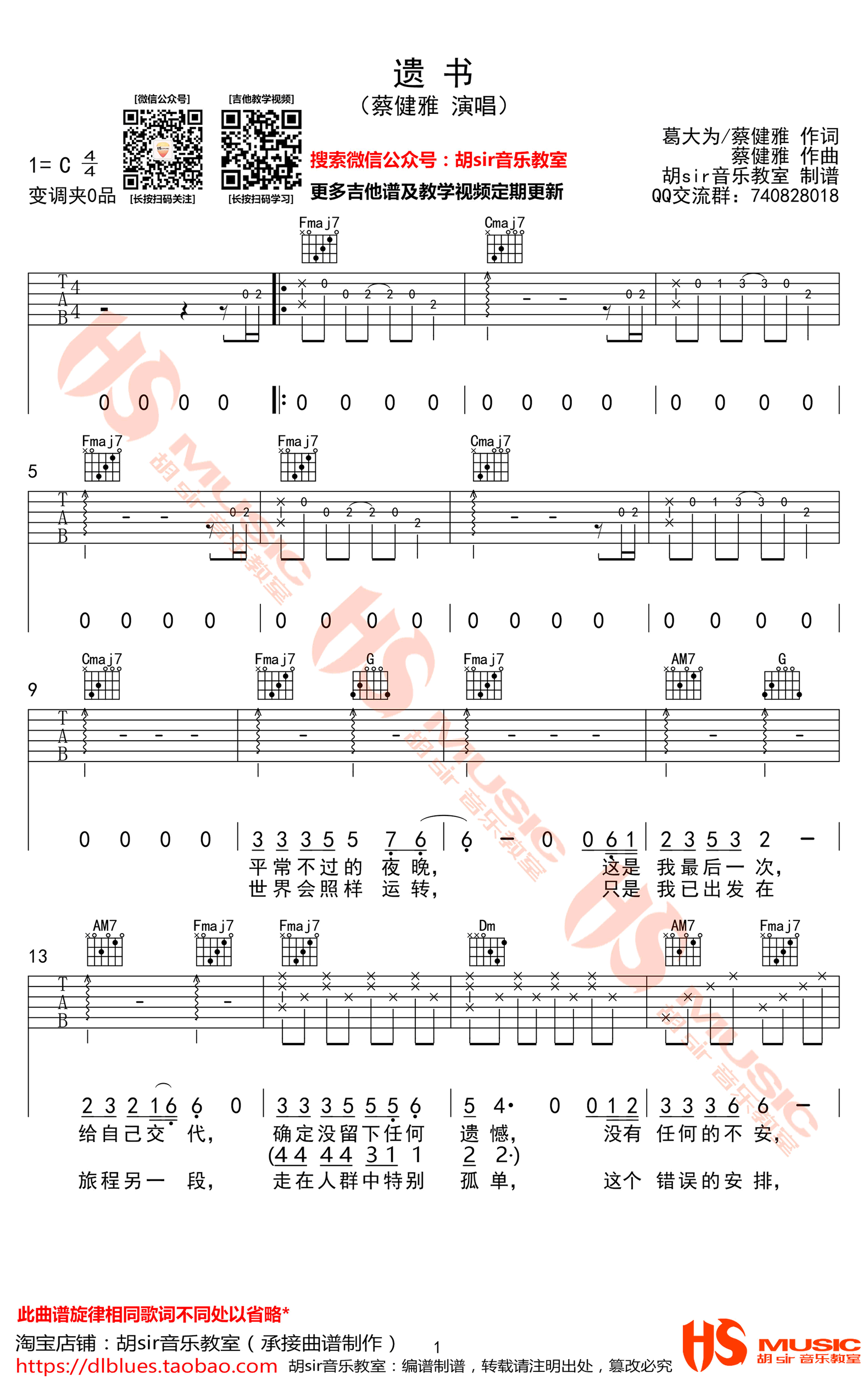遗书吉他谱,蔡健雅词曲演唱,新专辑《我要给世界最悠长的湿吻》的首波冠军单曲。遗书六线谱,C调弹唱谱,完整版共四张高清图片谱。感谢胡sir音乐教室出品,吉他吧网站上传分享。 一首深刻自省的歌曲,以第一人称出发直视我们的内心,歌声里那些对生命的发问,唱给那些在黑暗中挣扎的朋友们,让每个听见的人去思考,这一生,是不是没有遗憾了?