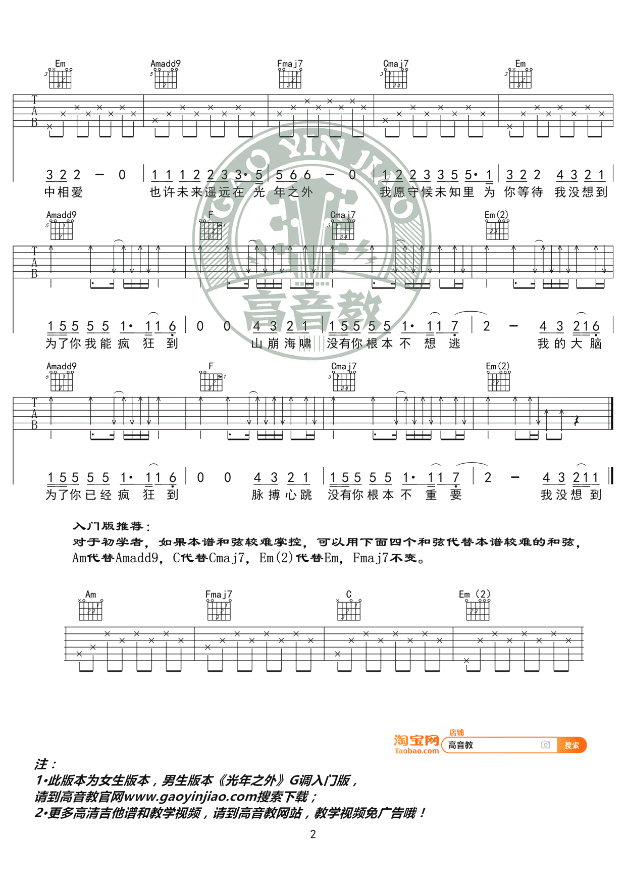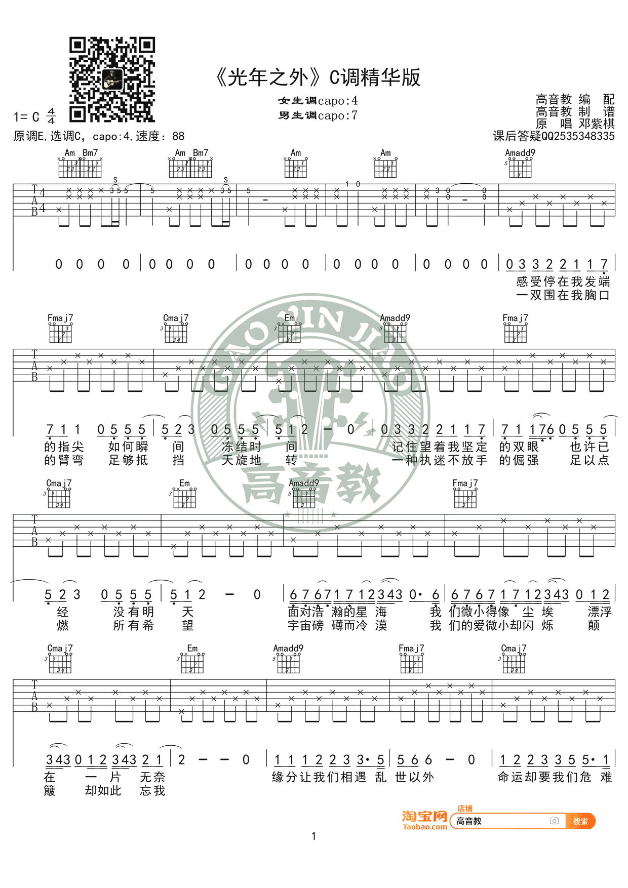 光年之外吉他谱,邓紫棋演唱,电影《太空旅客》主题曲,原调E,选调C,capo夹四品。光年之外六线谱,此版本为女生版编配,高清弹唱图片谱,高音教出品,吉他吧网站上传分享。 邓紫棋极具辨识度的歌声,天生自带的电音声卡,穿透力和感染力极强,来感受一下已经疯狂的心跳, 激情已经在澎湃了!