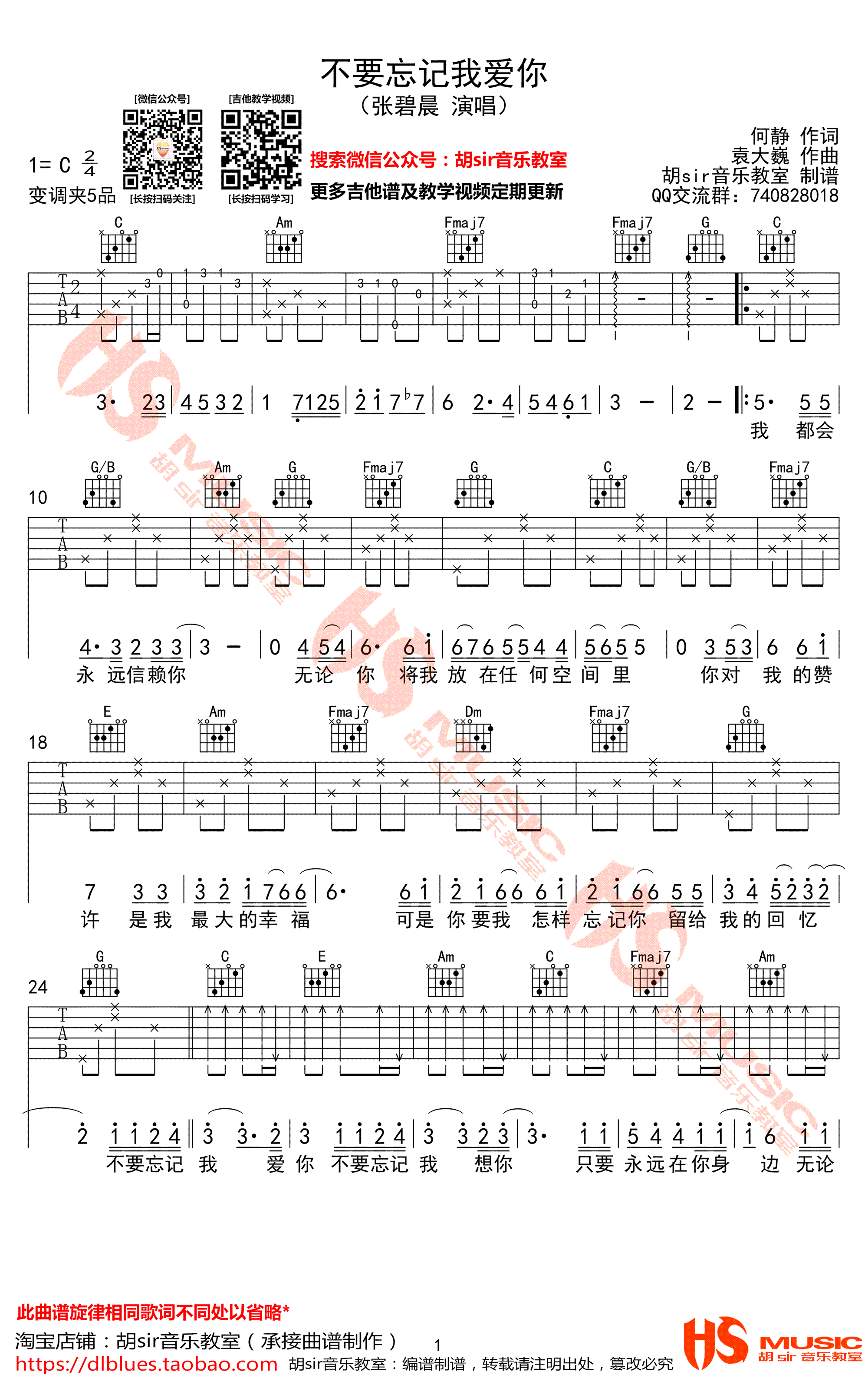 不要忘记我爱你吉他谱,张碧晨献唱电视剧《神犬小七》主题曲,不要忘记我爱你六线谱,C调指法编配,变调夹夹五品,高清弹唱图片谱。感谢胡sir音乐教室出品,吉他吧网站上传。 一首治愈系的歌曲,深情婉转的歌声,传递着狗狗对主人的无限依恋和纯纯的爱,带给我们无尽的温暖和感怀。