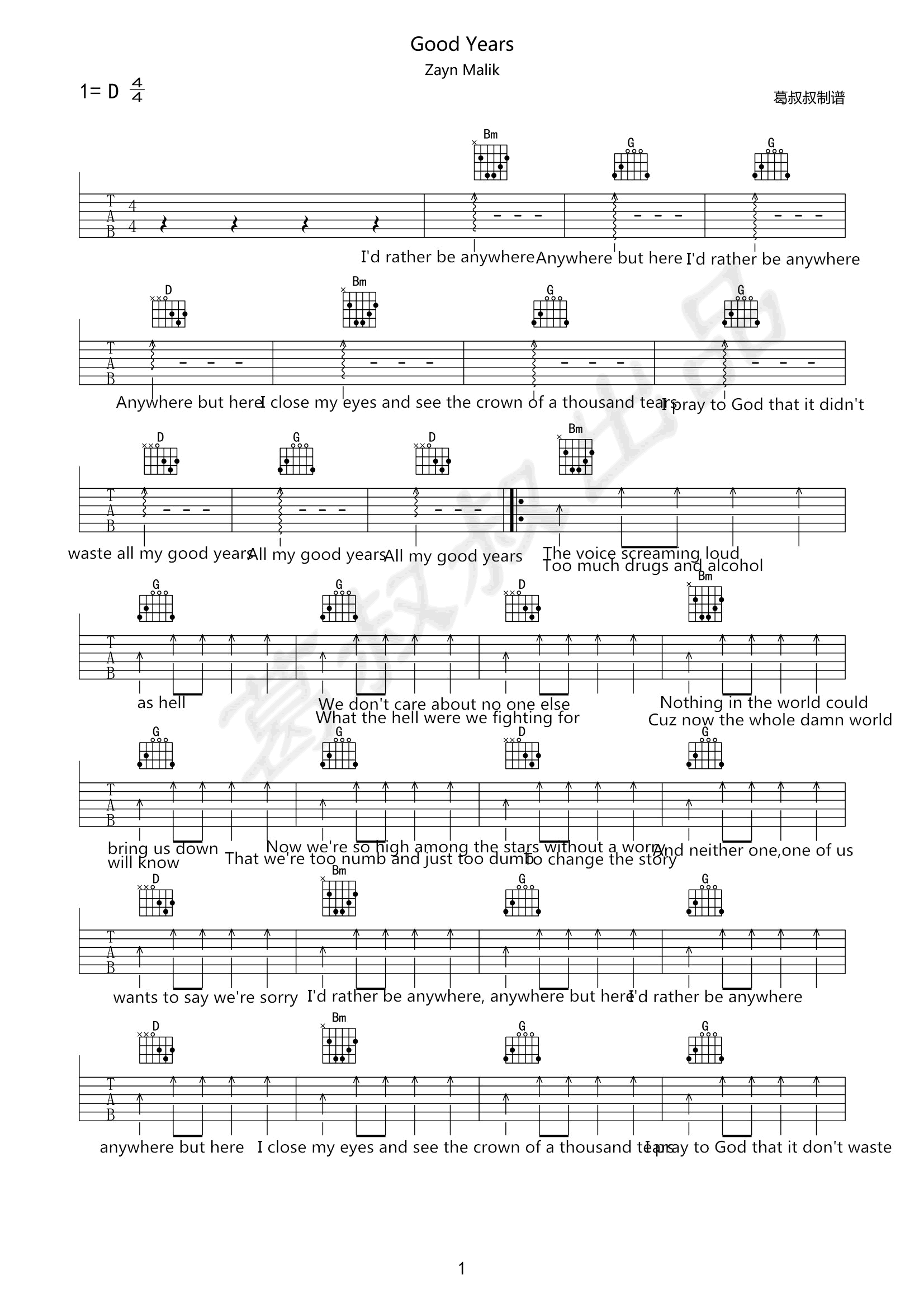 Good Years吉他谱,Zayn Malik演唱的全新单曲,Good Years六线谱,高清弹唱图片谱,感谢葛叔叔编配,吉他吧网站上传。