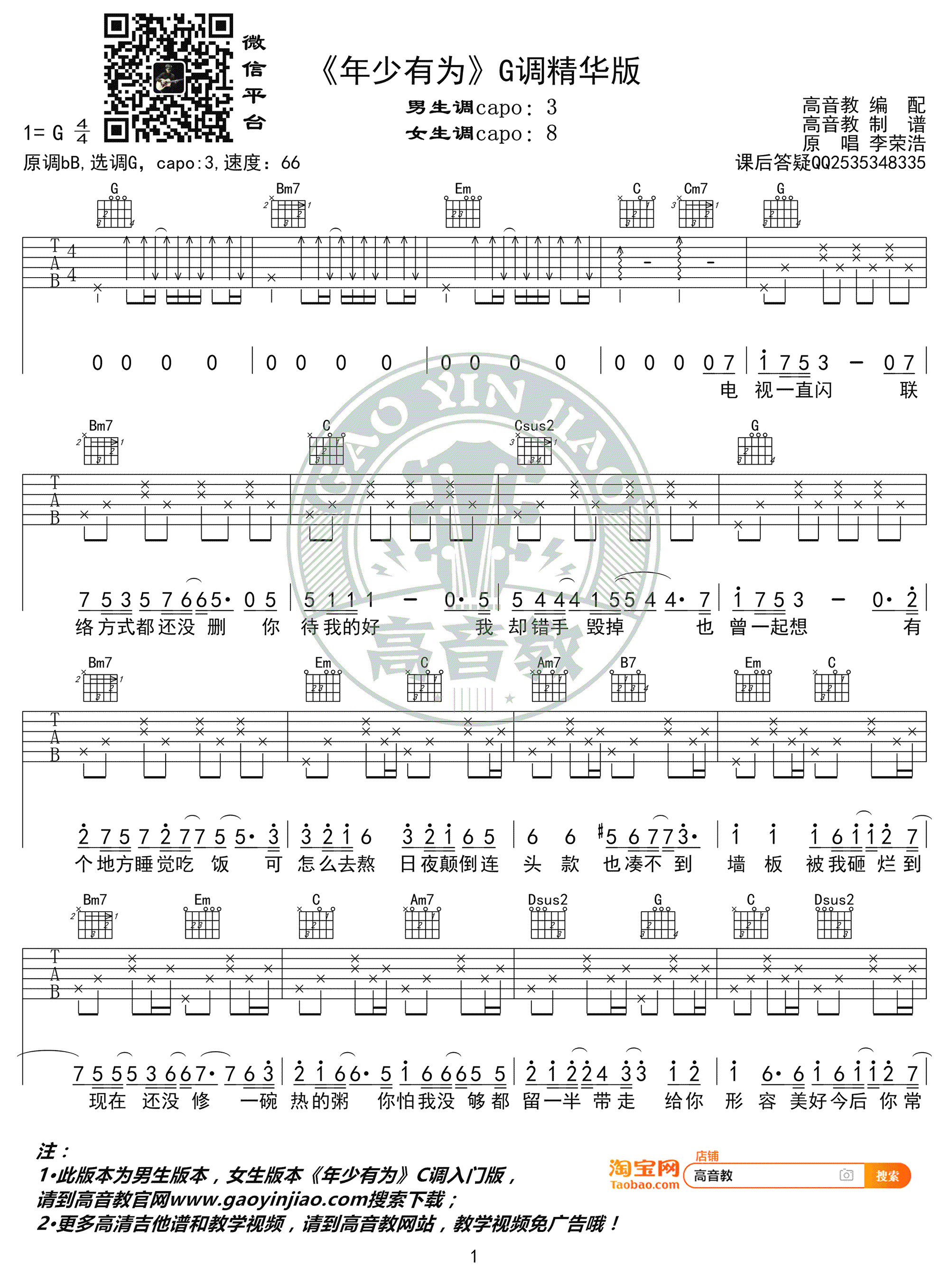 年少有为吉他谱,李荣浩演唱,原调降B,选用G调指法,CAPO夹三品,女生可夹八品。年少有为六线谱,高音教出品,吉他吧网站分享。 生活中没有假如和后悔,想到就做,做就要做到极致。也许你年少有顾虑!但你是否也该多给自己一些爱的勇气,人生啊,总不能没有努力过就向生活妥协。