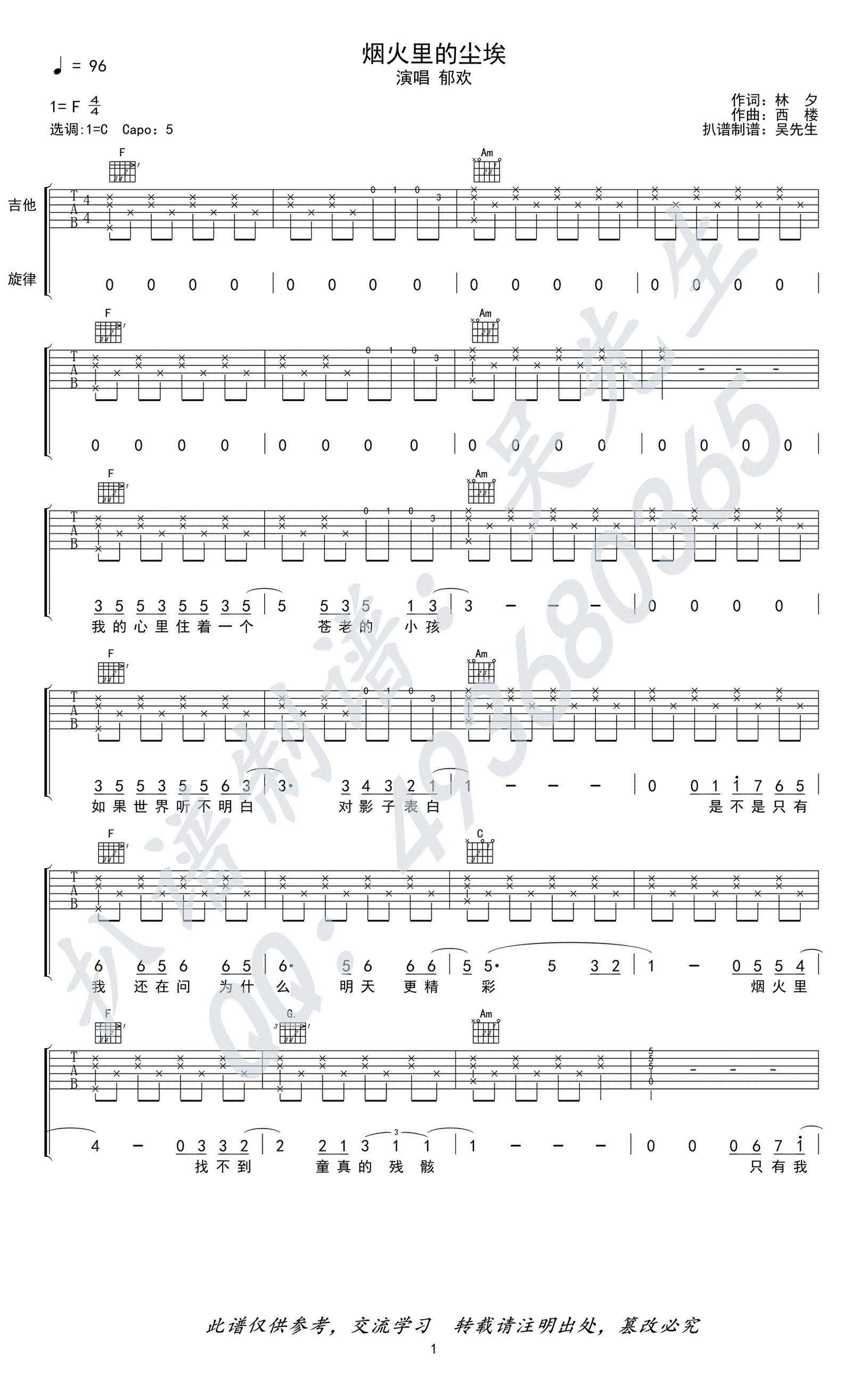 烟火里的尘埃吉他谱,郁欢演唱女生版,原调F,选调C,CAPO夹五品。华晨宇的一首代表作品,烟火里的尘埃六线谱,高清弹唱图片谱,感谢吴先生编配出品,吉他吧上传分享。 最好听的女生翻唱,也是抖音很火的版本。你是白日里的焰火,我是烟火里的尘埃,只为绚烂里的平凡。