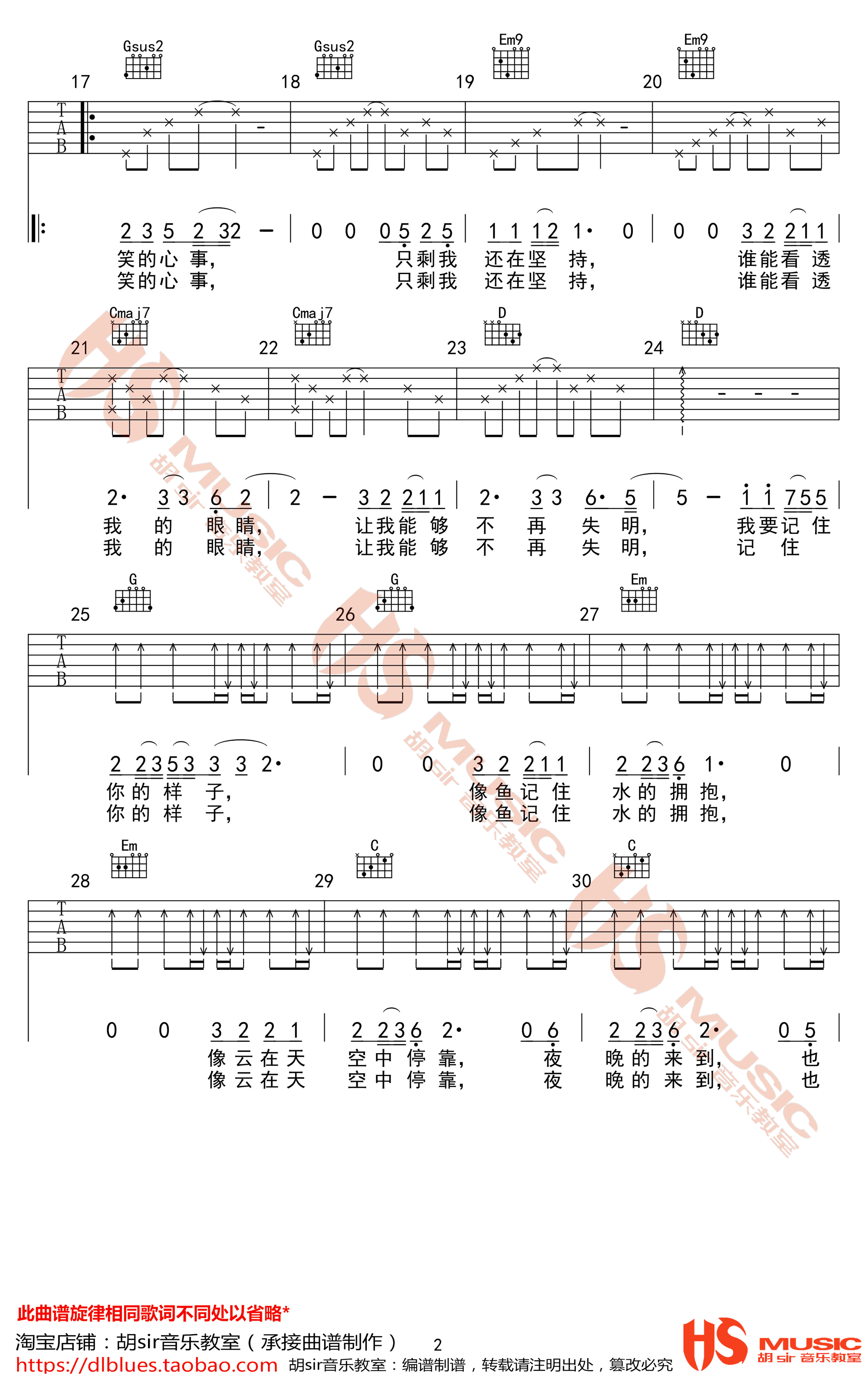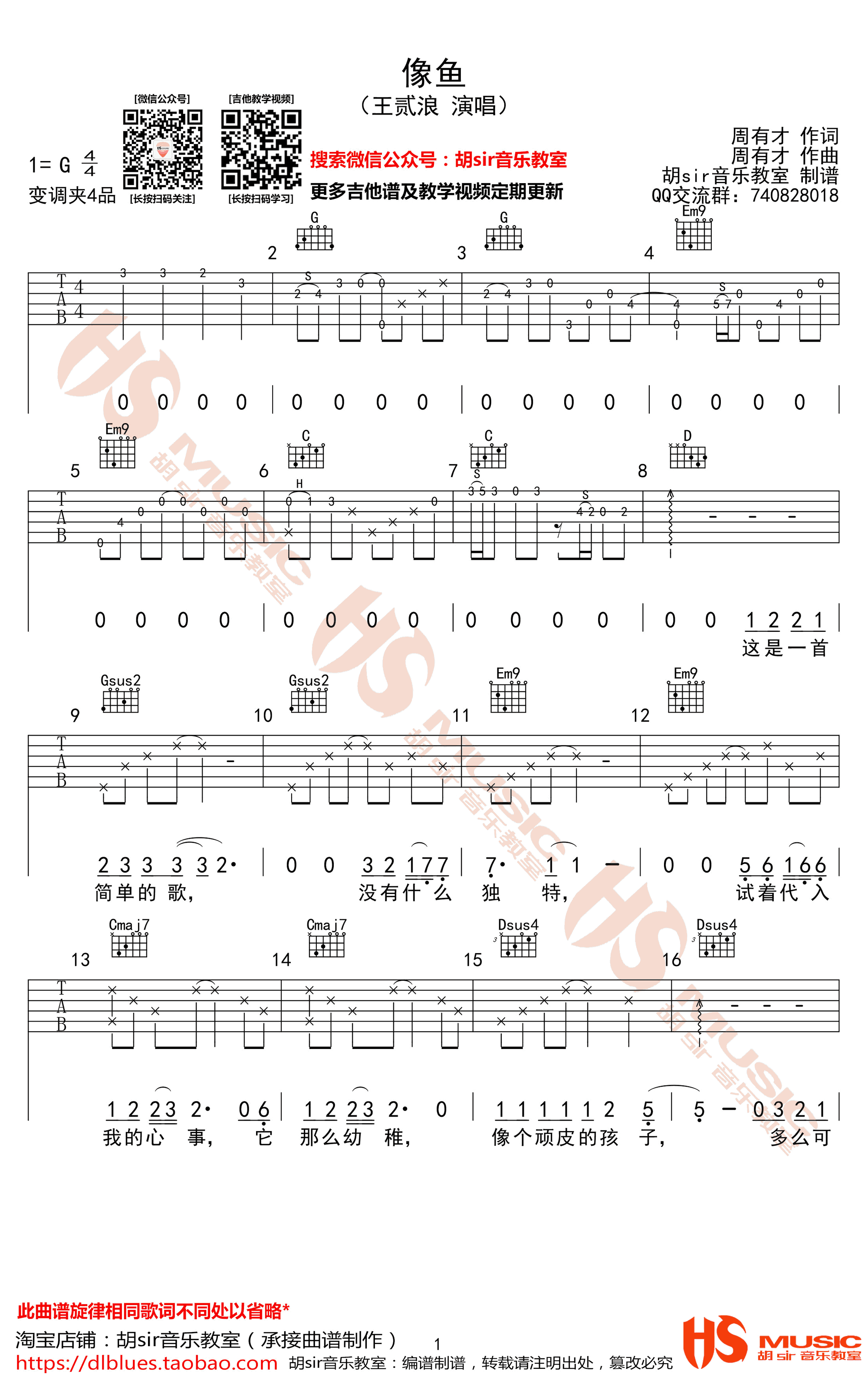 像鱼吉他谱,王贰浪演唱,G调指法,变调夹夹四品。像鱼六线谱,高清弹唱图片谱。胡sir音乐教室编配出品,吉他吧网站推荐分享。 简单的吉他伴奏,无法抗拒的魅力歌声,唱出对感情不舍却又抓不住的心情。,让我们一起经历体会这份淡淡浅浅的悲伤和挣扎吧。