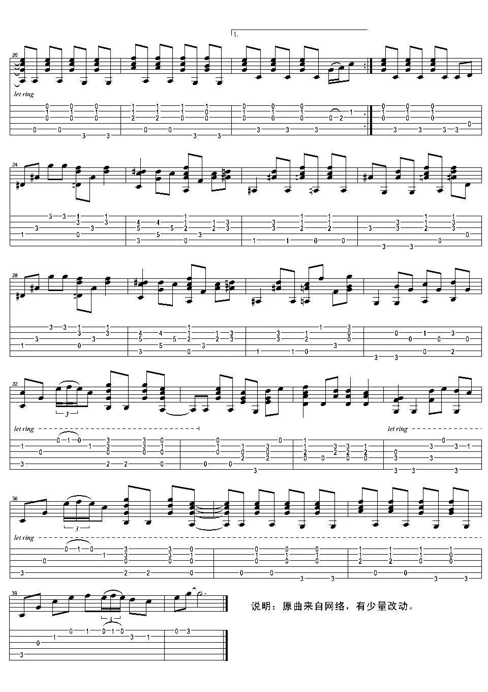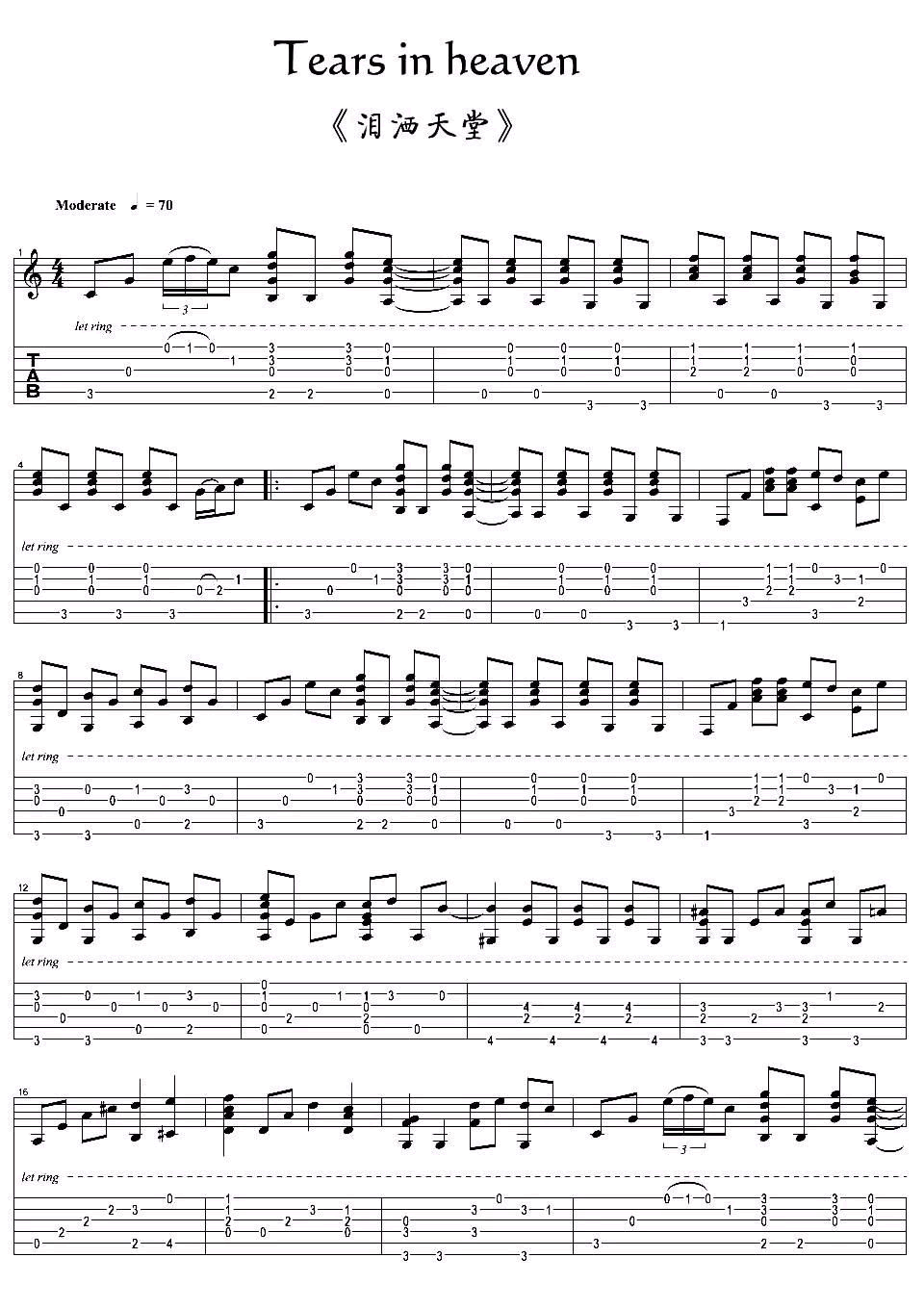 Tears in Heaven指弹谱,泪洒天堂吉他独奏谱,两张图片谱,原曲来自网络,有少量改动,吉他吧网站上传分享。 这是艾里克·克莱普顿的经典代表作品,透着一种被悲伤滤过的安慰情殇,在悲哀奠定的大基调下,却诉说得恰是轻柔。