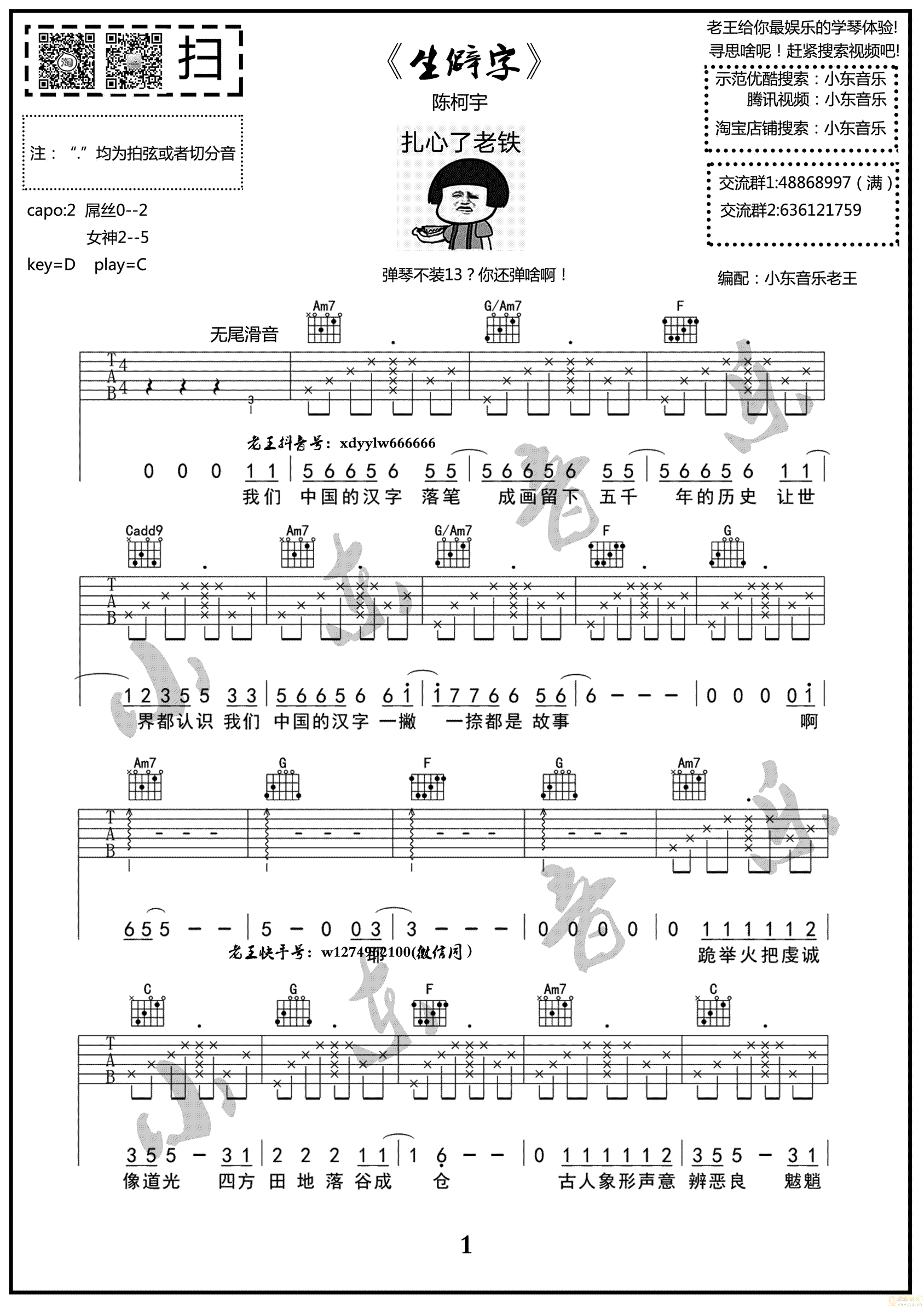陈柯宇《生僻字》吉他谱,原调D,选用C调指法编配,capo夹二品。一首抖音热门歌曲,生僻字吉他六线谱,完整版共四张图片谱例。感谢老王编配,吉他吧网站上传分享。 网络一首大火的歌曲,大半歌词竟然不认识,感觉语文白学了。我们中国的汉字,落笔成画留下五千年的历史,一撇一捺都是故事。曲调朗朗上口,歌词全程高能,如果你还不会唱的话,那快来学吧,在歌曲中感受中华文字文化的魅力......