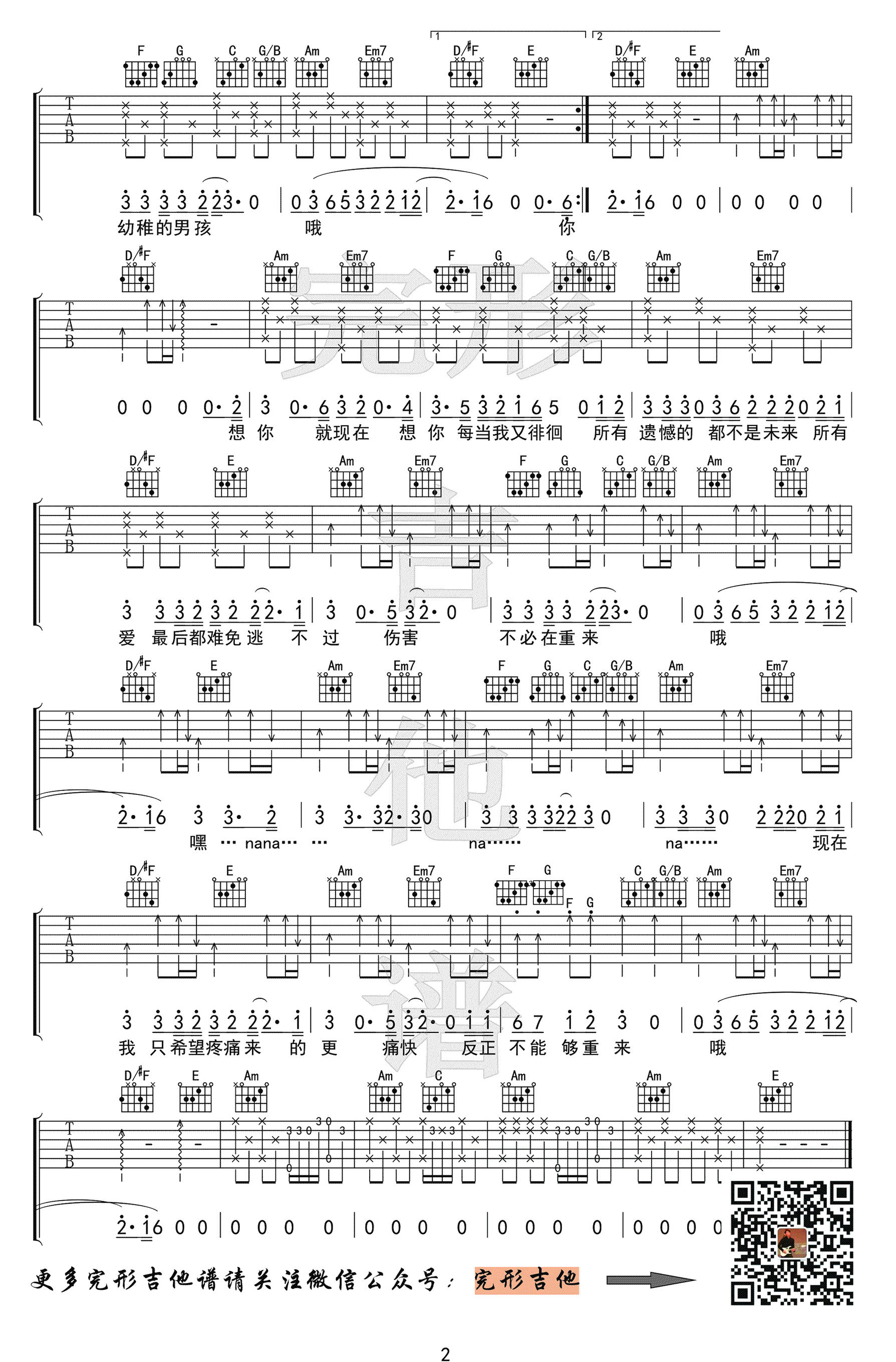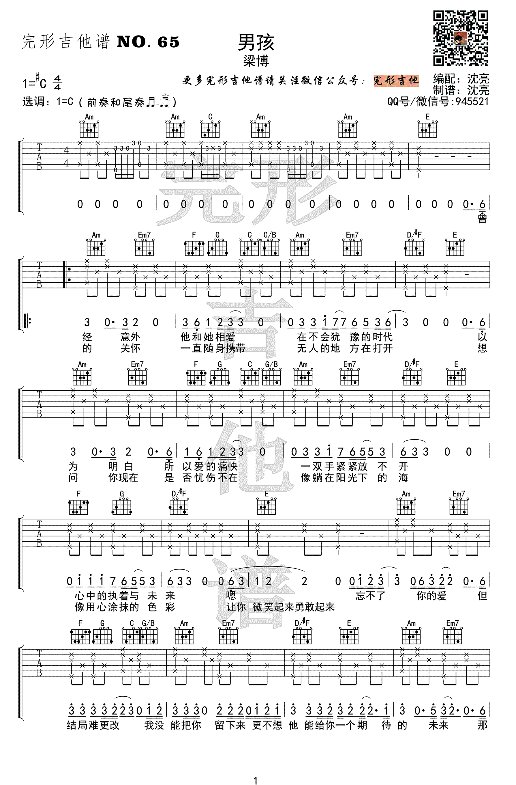 男孩吉他谱,梁博演唱的一首原创歌曲,唱出了男孩内心的成长体验。男孩六线谱,选调C,高清图片谱,随谱附上配套吉他弹唱示范视频。感谢完形吉他出品,沈亮老师编配演奏说明:全篇基本是以一套和弦推进,个别地方稍加变化。作曲的初衷应如此,这也是我们原创时的一种借鉴。和弦方面,值得注意的是:D/#F和弦过渡到E和弦,在A小调里这是一种惯用手法,需记住。前奏和尾奏的16分音符注意是swing节奏,仔细品味原版中的跳跃感觉。