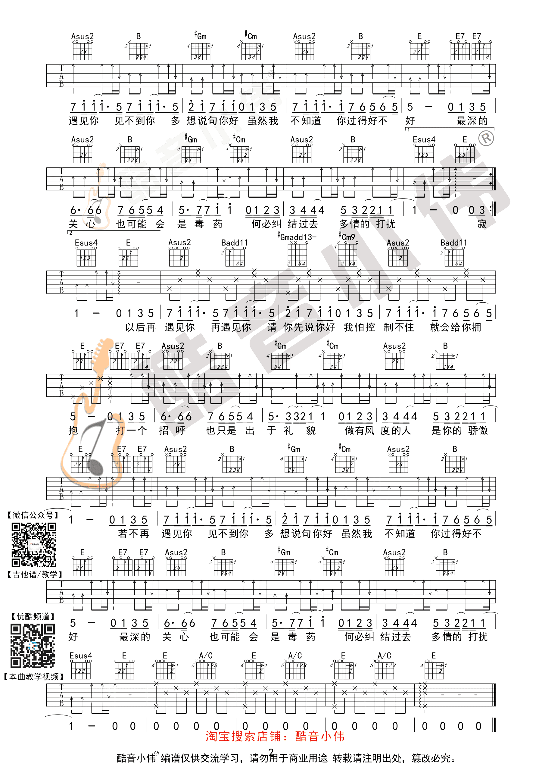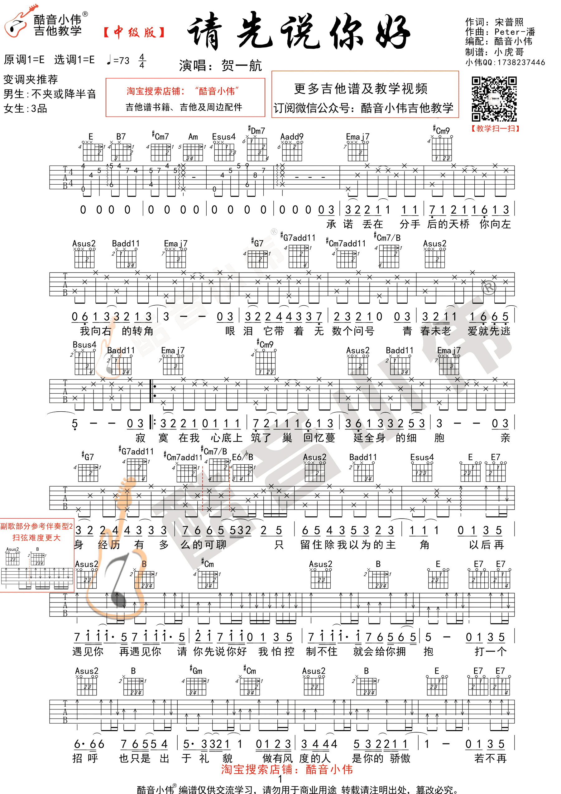 请先说你好吉他谱,贺一航演唱,中级版编配,原调E,变调夹推荐,男生不夹或降半音,女生夹三品。请先说你好六线谱,高清图片谱,感谢酷音小伟出品,吉他吧网站上传分享。随谱附上吉他弹唱演示和教学视频,琴友们参照曲谱跟随老师示范教学练习。