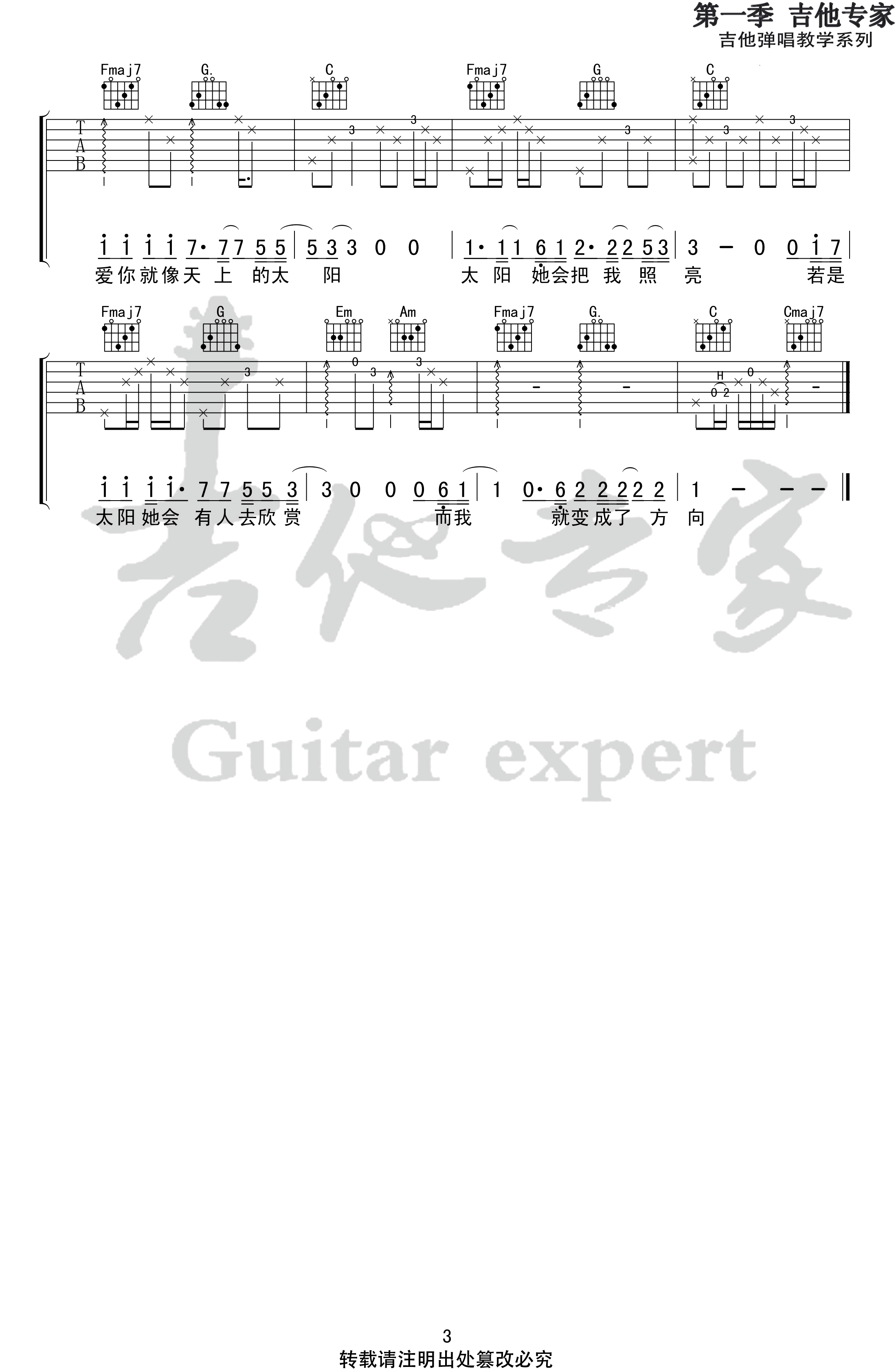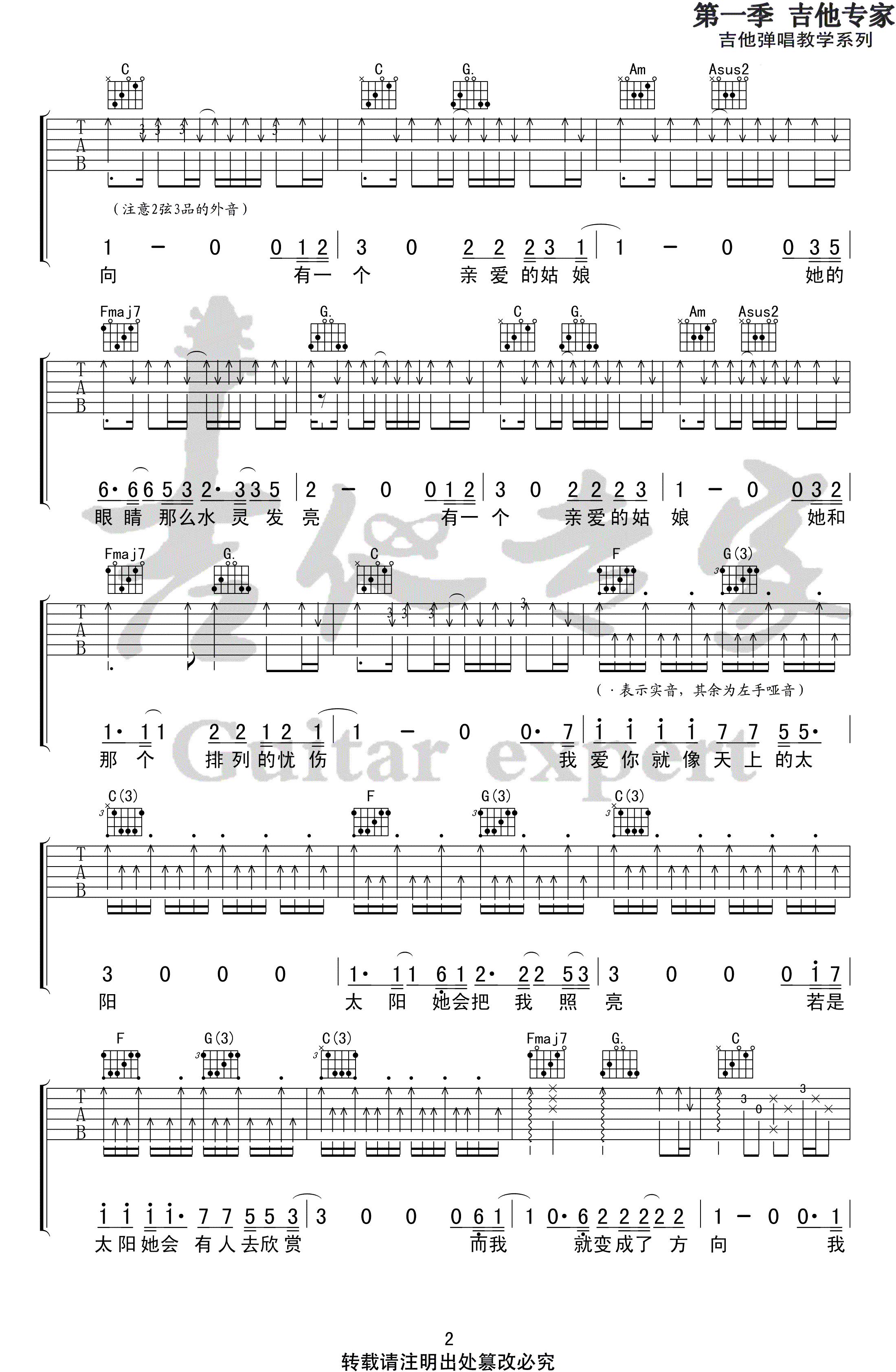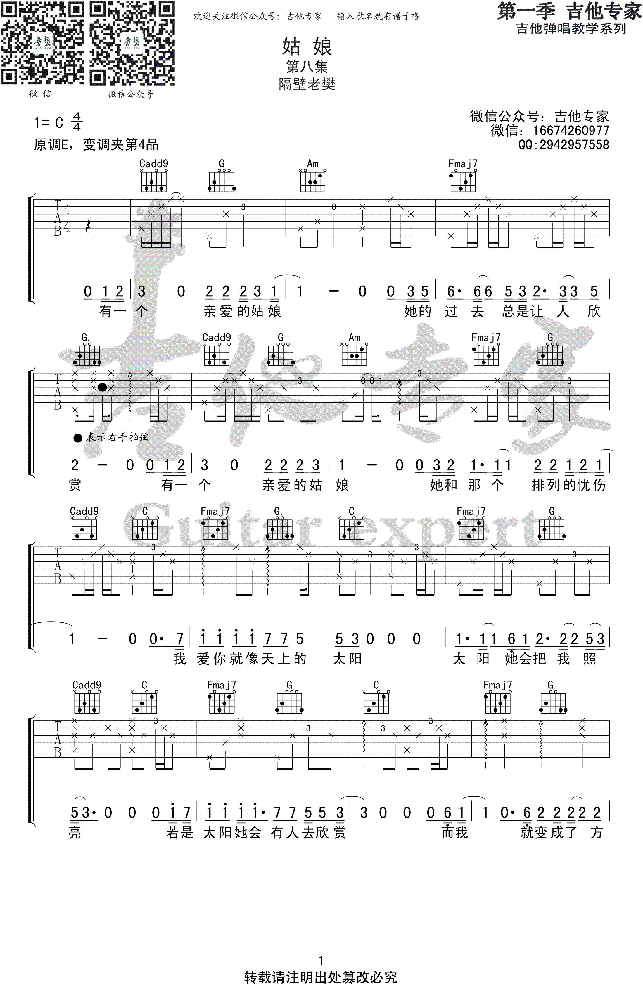 隔壁老樊《姑娘》吉他谱,原调E,变调夹夹四品,选用C调指法编配。翻唱王北车的代表作品,姑娘六线谱,三张图片高清弹唱谱。感谢吉他专家出品,曲谱是按照老樊的版本编配的,基本上没有改什么,其实大家弹唱的时候不一定非得按原版来,可以根据自己的弹琴习惯即兴改编。 总归还是会有人用最质朴的方式喜欢你,不是套路,也不是撩你,是那种“好喜欢你啊,想对你越来越好” 。