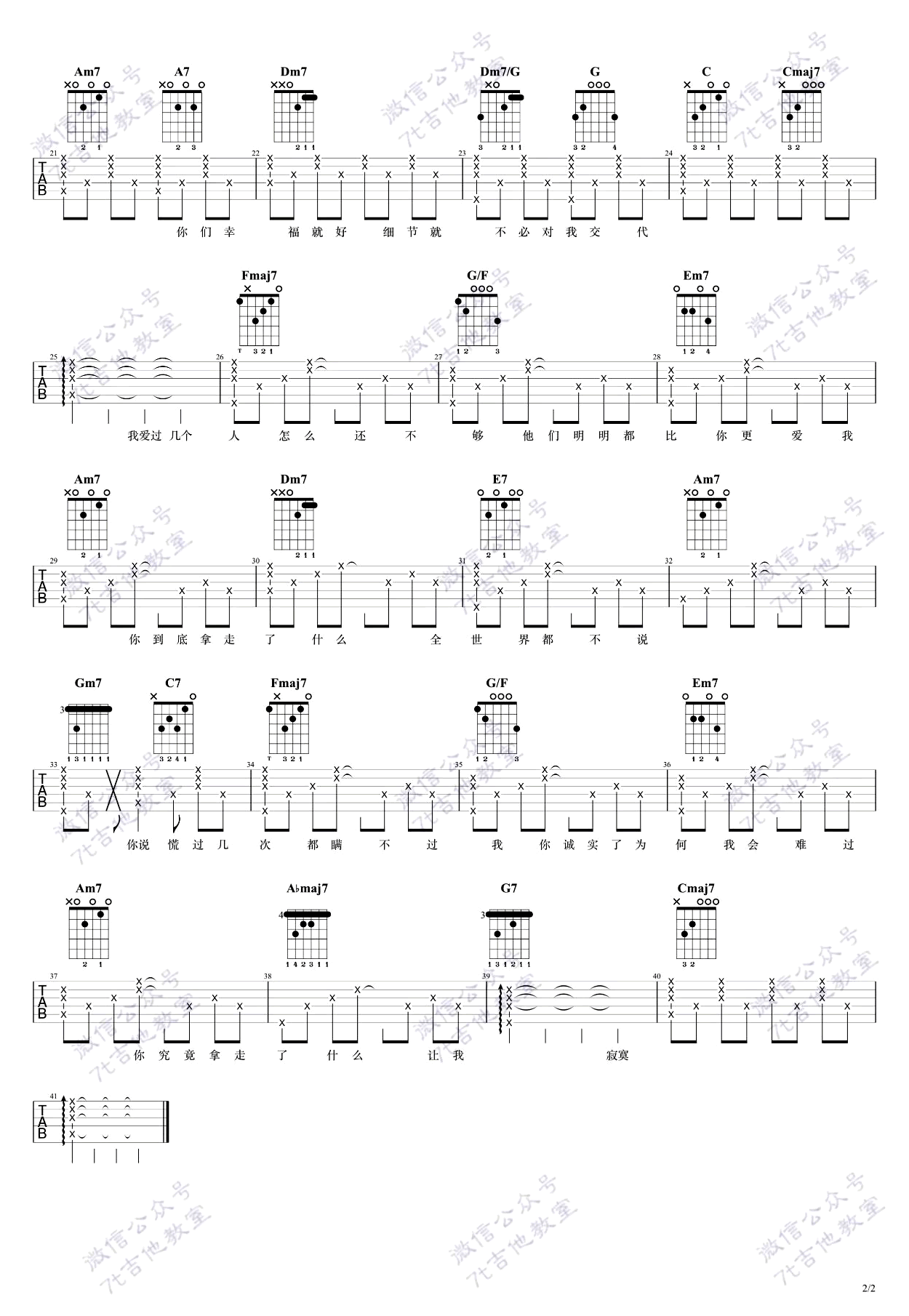 A-Lin《拿走了什么》吉他谱,C调指法编配,7T吉他教室出品,吉他吧网站上传。这首歌的原调是C大调,视频里也是用了C大调的指法来编配,女生可以直接按原调弹唱,如果感觉太高了不妨尝试降半音调弦哦;男生可以根据自己的音域夹变调夹~ 这是和李荣浩再度合作的情歌,动人的旋律,淡淡的感伤,面对逝去恋情的矛盾追忆,有释怀也有解脱,道出爱情里的万般无奈曲折。