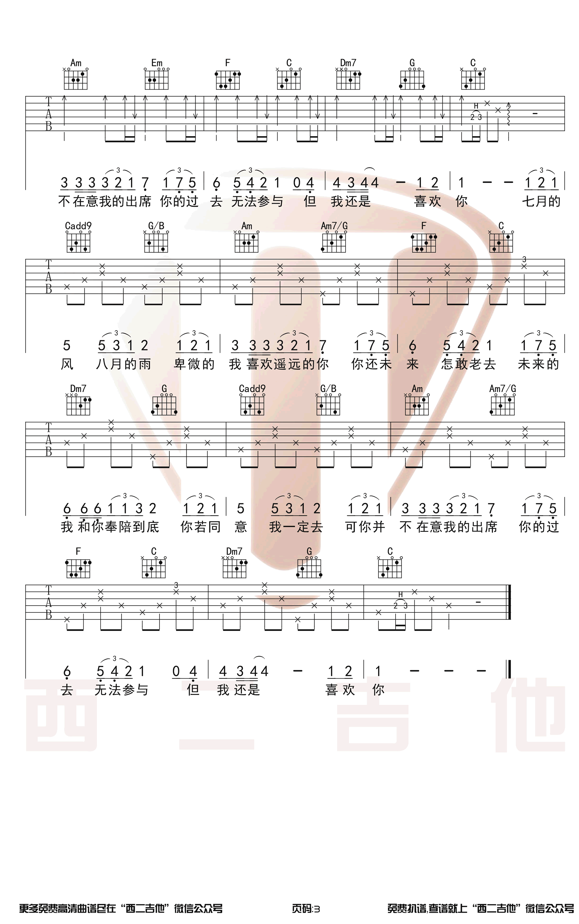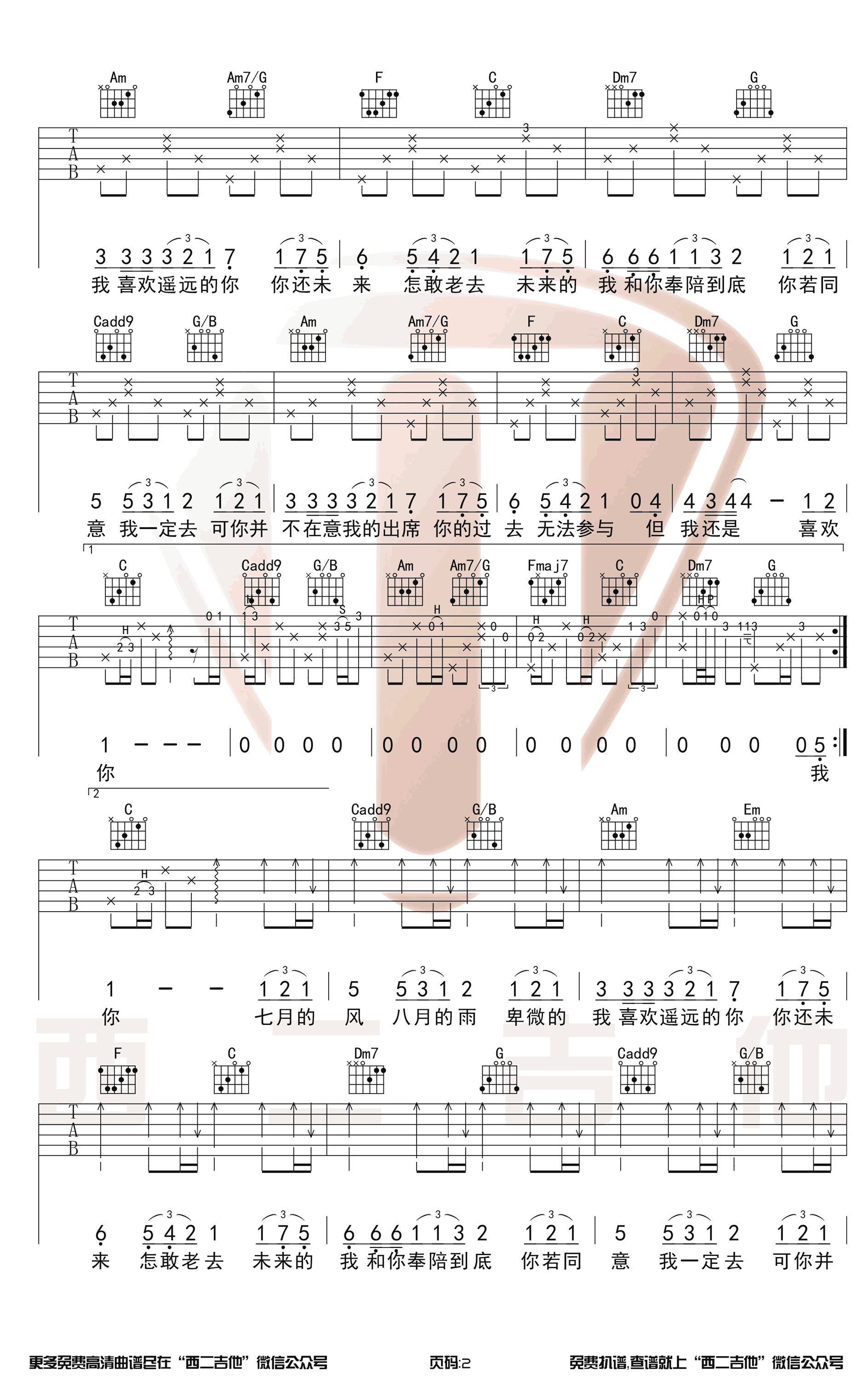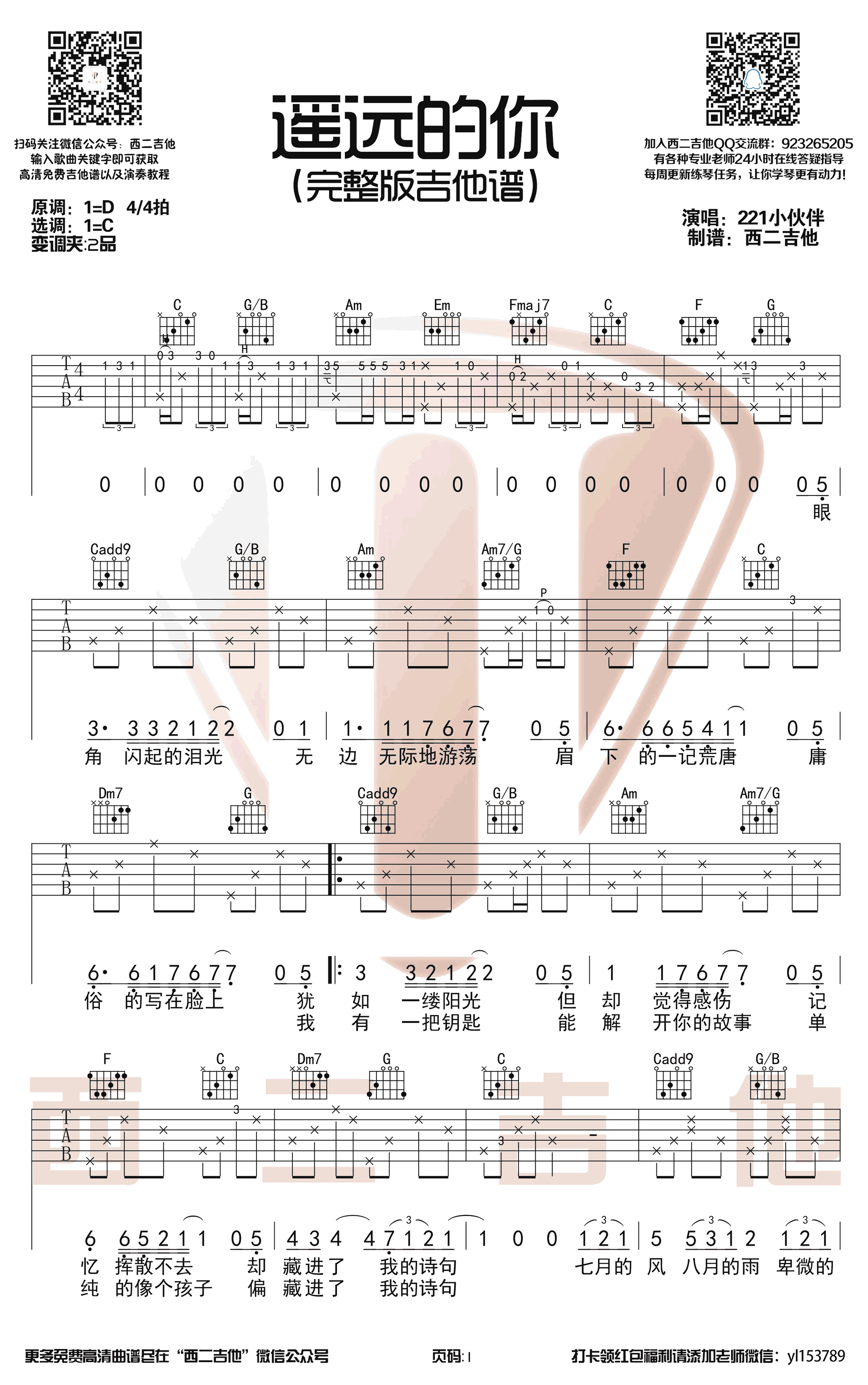 遥远的你吉他谱,221小伙伴演唱的一首网络热门民谣歌曲,遥远的你六线谱,带前奏间奏完整版,原调D选调C,变调夹夹第二品。感谢西二吉他出品,同时编配了一份适合新手演唱的简单版吉他谱,根据大家的水平自由选择。整体难度不大,祝大家练琴顺利!吉他吧网站上传。 抖音爆红的一首青春之歌,给了无数人心灵一个碰撞,每当听到这首歌,人们的心里总会想起好多红尘往事,歌曲不仅要献给自己的暗恋,更要献给我们的青春。