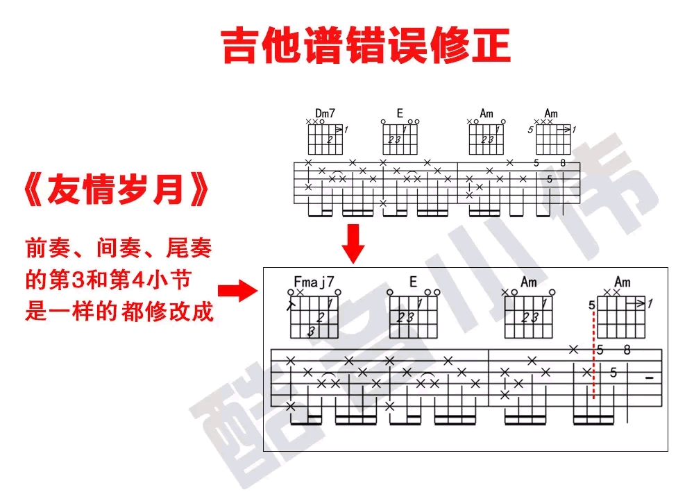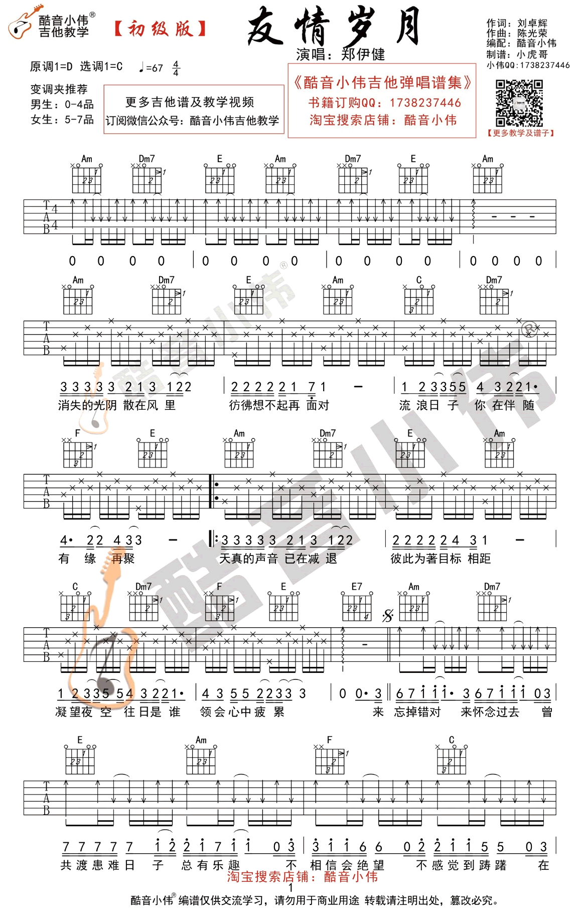 友情岁月吉他谱,郑伊健演唱的经典粤语歌曲,香港电影《古惑仔》主题曲,原调D,选调C,变调夹推荐,男生0-4品,女生5-7品。友情岁月六线谱,吉他弹唱+教学视频,酷音小伟初级版编配,吉他吧网站上传分享。曲谱前奏间奏尾奏有错误修正,琴友们可以参照图片谱和老师的示范讲解演示练习演奏。