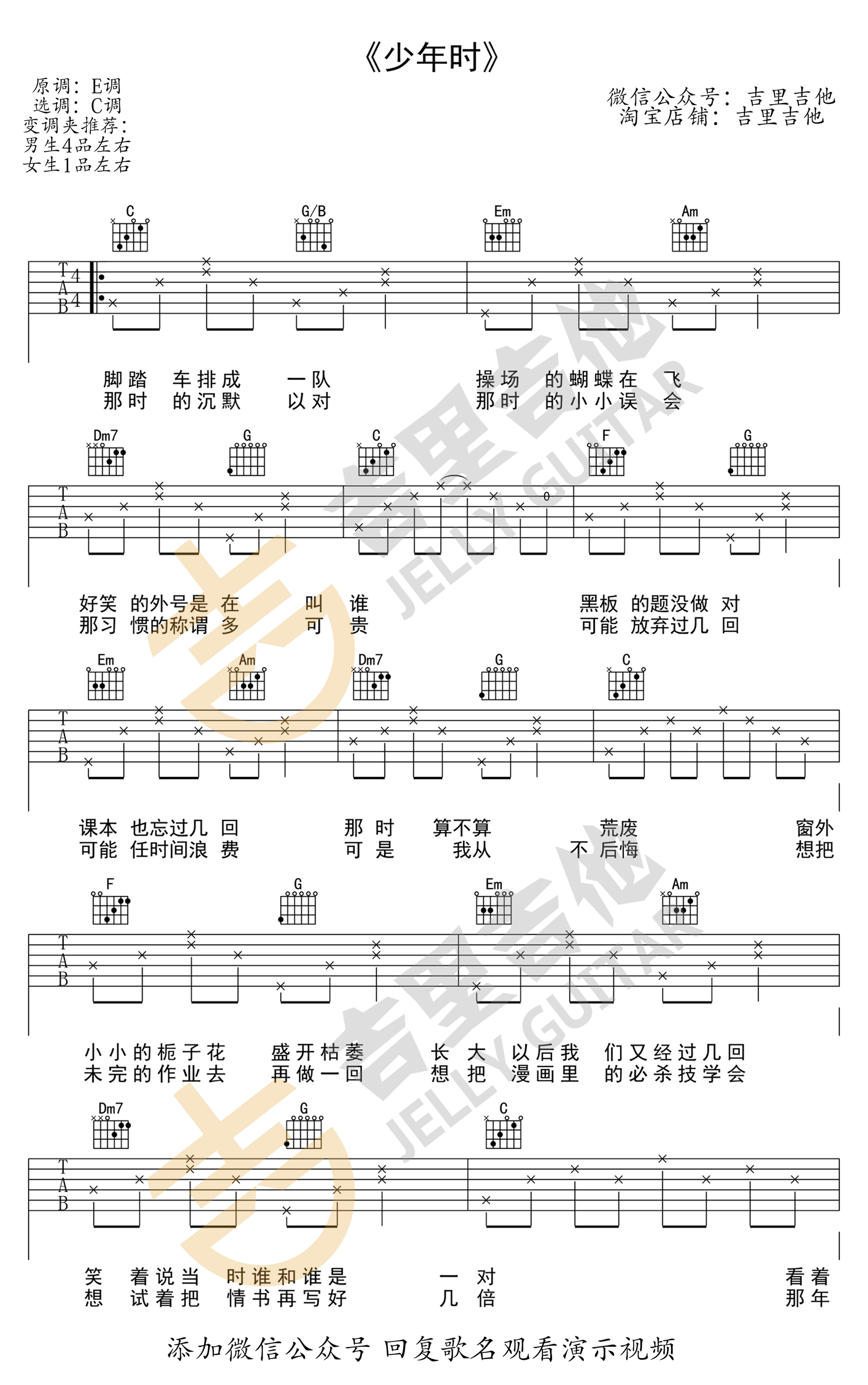 少年时吉他谱,候明昊演唱,电视剧《人不彪悍枉少年》片尾主题曲。少年时六线谱,原调E,选调C,变调夹推荐,男生4品女生1品,弹唱谱共两张高清图片谱例,感谢吉里吉他编配出品,吉他吧网站上传分享。 歌曲充满怀旧青春的质感,没有繁杂的编曲,只一把吉他简单的贯穿始终,情感丰沛的歌声唱出了我们最纯粹的青葱校园时光。