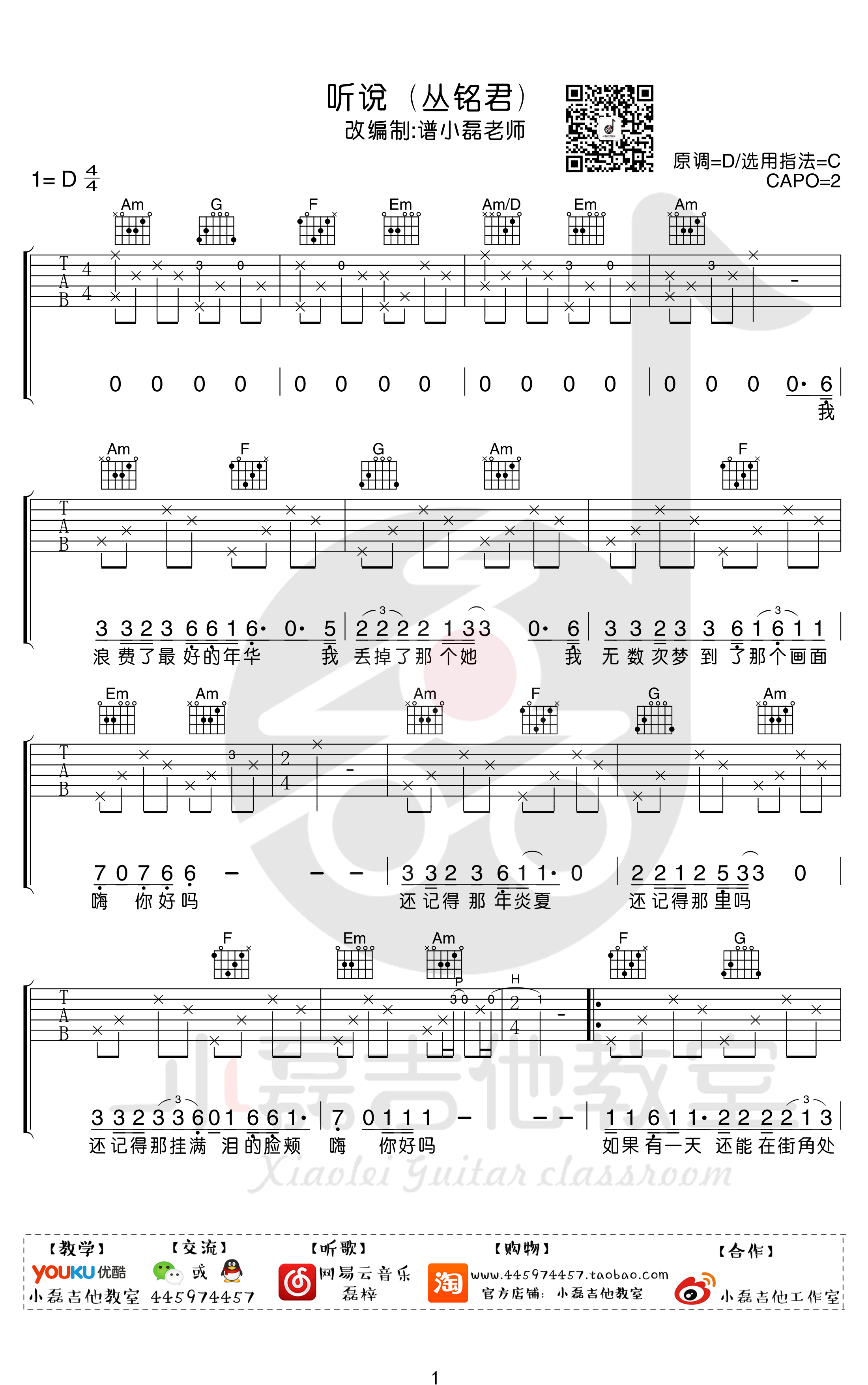 《听说》吉他谱,丛铭君演唱的一首抖音神曲,原调D,选用C调指法,Capo夹二品,听说六线谱,高清弹唱谱共四张图片谱例。感谢小磊吉他出品,曲谱编配演奏说明:歌曲编曲其实很简单且平淡!前奏和间奏尾奏其实都是双吉他编排,但是一个吉他完全可以弹奏清楚简单的旋律,所以我们在演奏部分完全的保留了原版的音乐因素!在弹唱部分,我们也尽可能保留原版中一些吉他的加花成分(原版中也是大量的吉他音色),大部分都是在没有唱的部分,所以对弹唱的干扰不是很大!