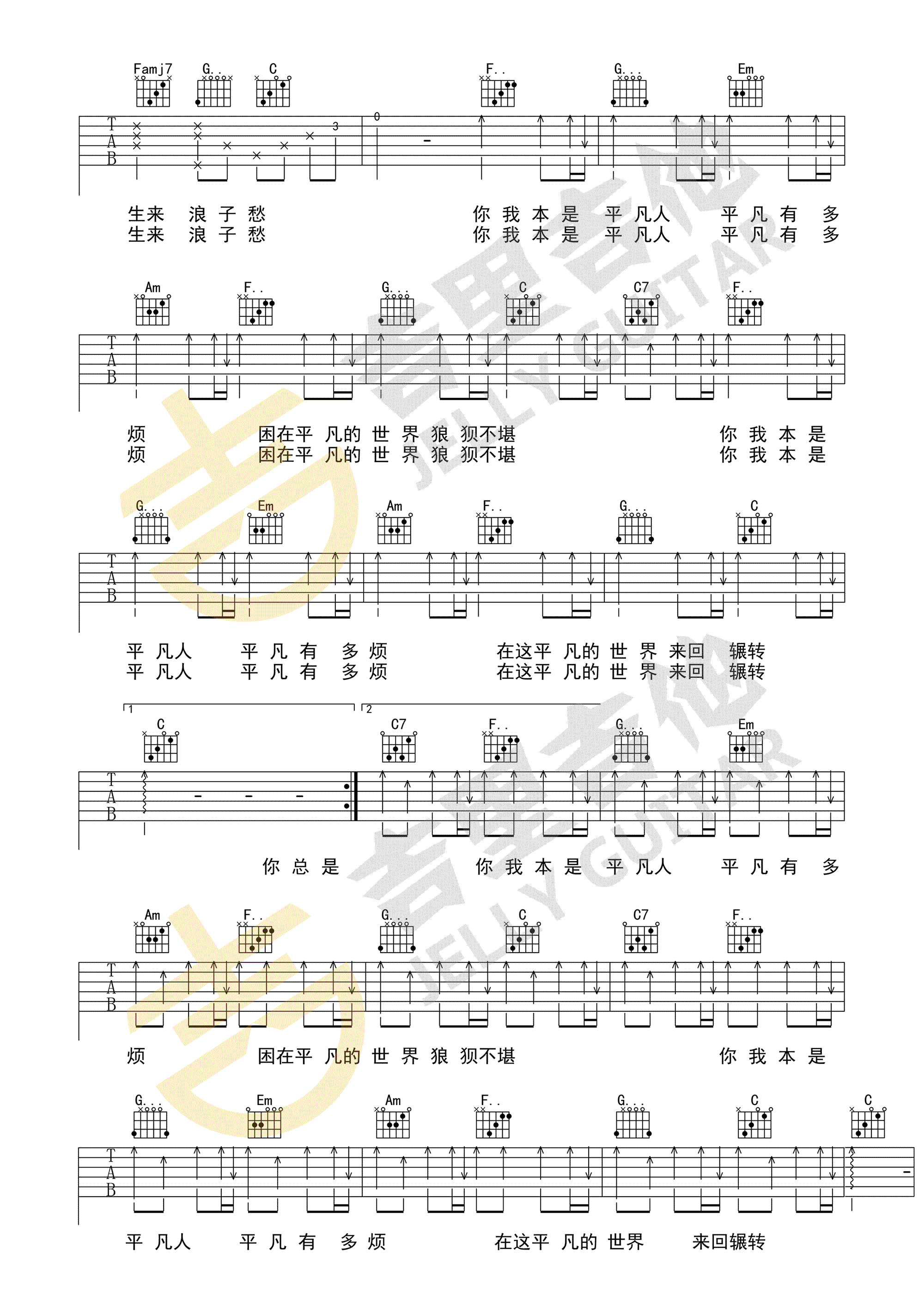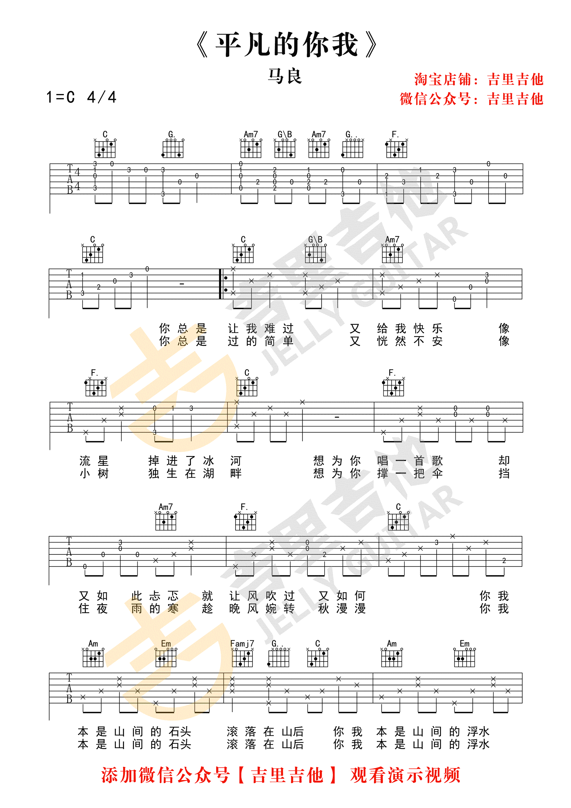 平凡的你我吉他谱,马良新专辑歌曲,致敬所有努力追逐梦想和生活人们。平凡的你我六线谱,C调简单版,高清弹唱图片谱。感谢吉里吉他编配出品,吉他吧网站上传。 平凡如你我,很多时候不得不向命运叩首,在柴米油盐中,理想和现实的落差时刻在提醒我们。但平凡没有错,也没有什么大不了,人生的诗,如果是悲情的感慨,那远方就应该是整装待发,继续上路了吧。