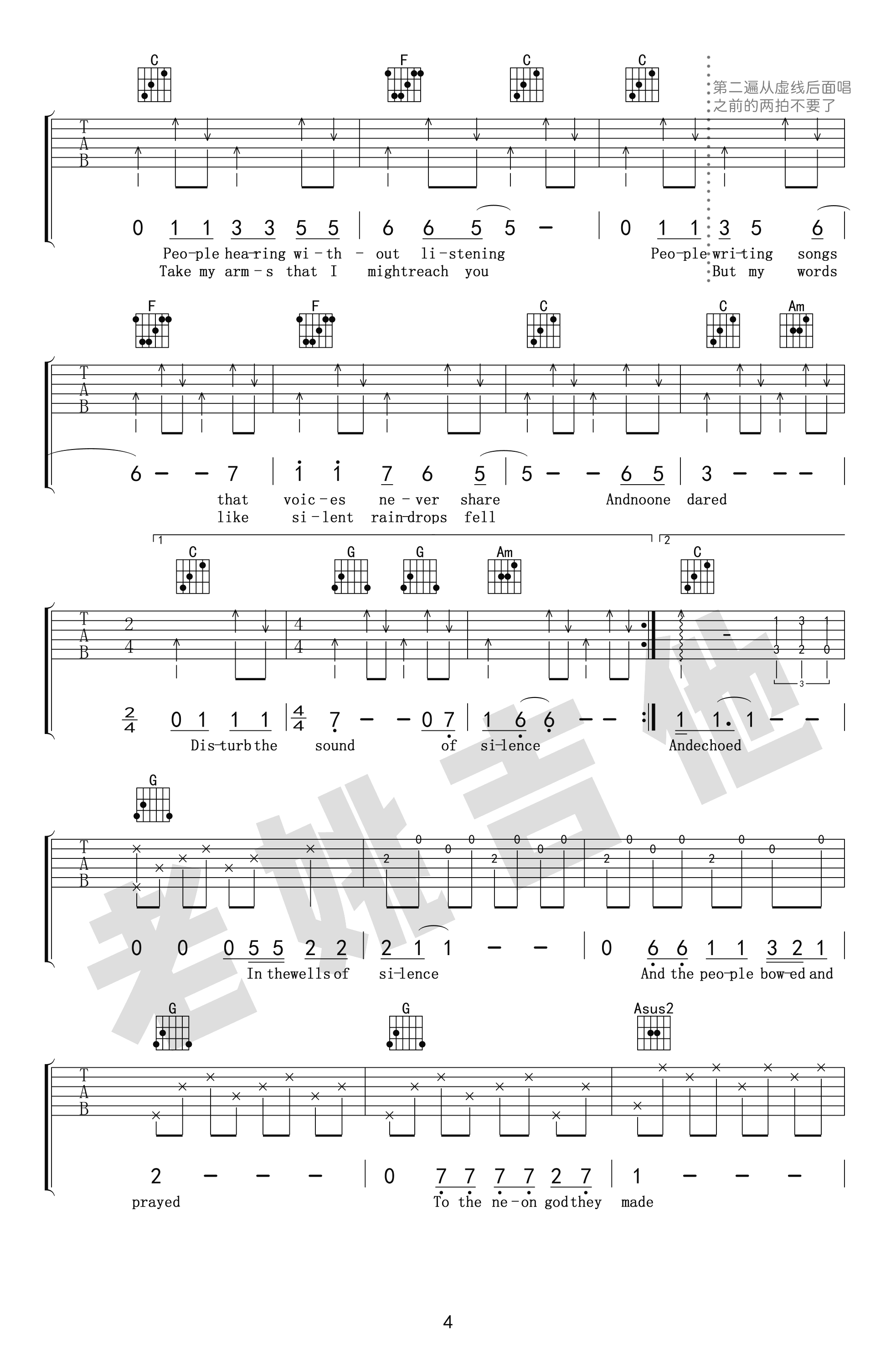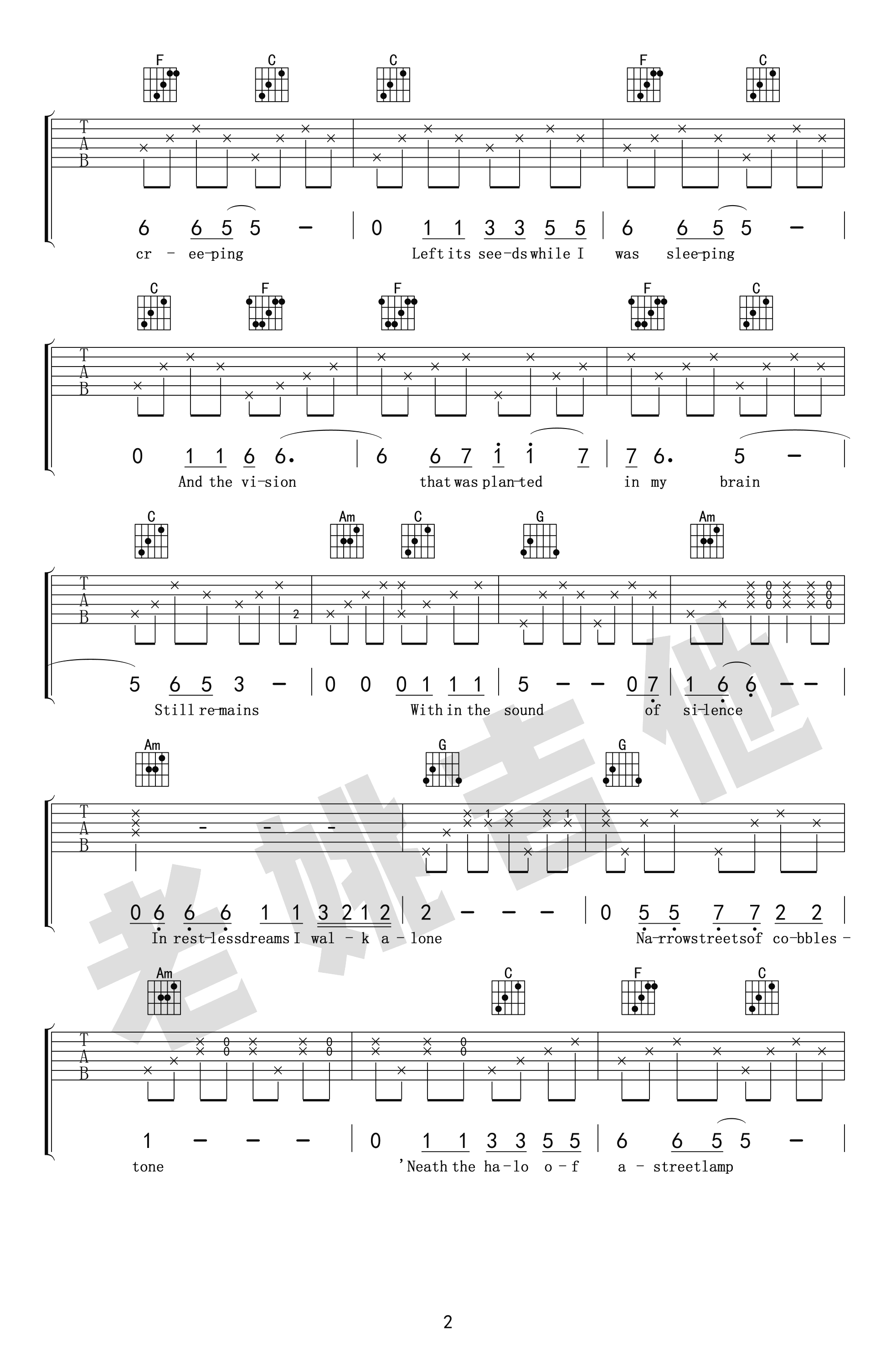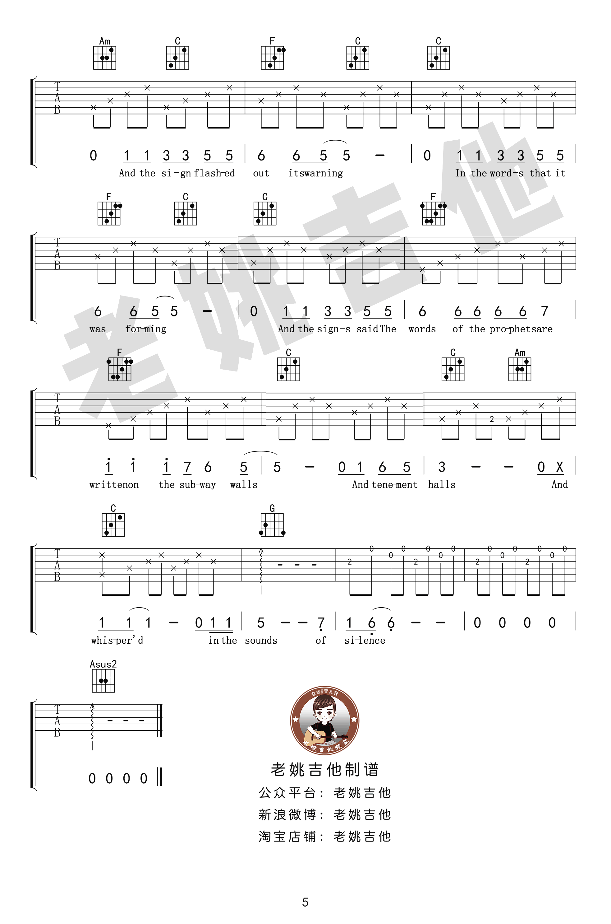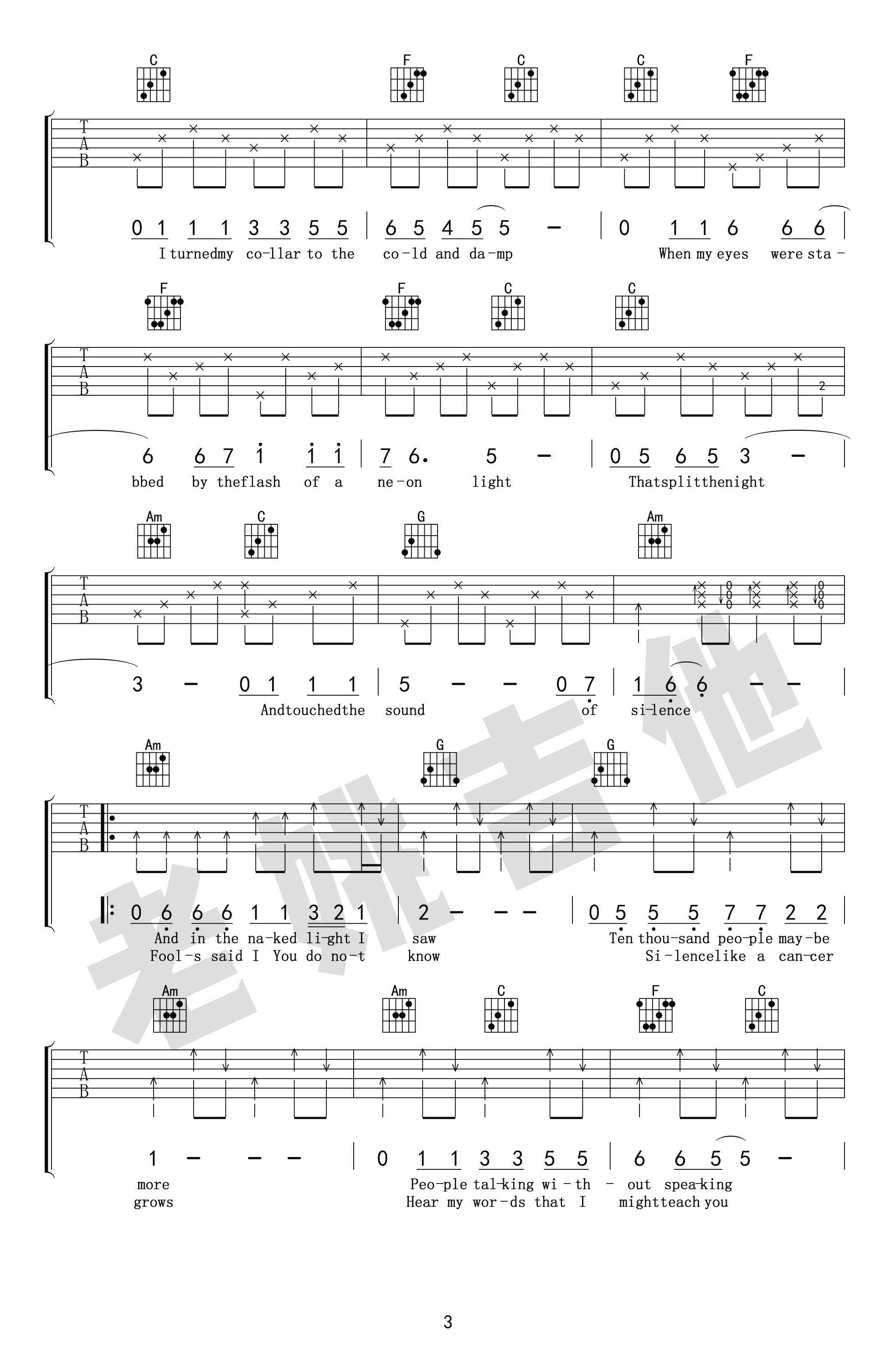 The Sound of Silence吉他谱,一首经典的英文歌曲,奥斯卡获奖电影《毕业生》主题曲,寂静之声吉他六线谱,带指弹前奏,美国著名的民谣组合保罗·西蒙与加芬克尔演唱,曲谱根据网上视频“一把破吉他 两个糟老头”版本改编,感谢老姚吉他出品,吉他吧网站推荐。随谱附上《The Sound of Silence》吉他教学视频,琴友们跟随老师的示范讲解学习,加油吧!