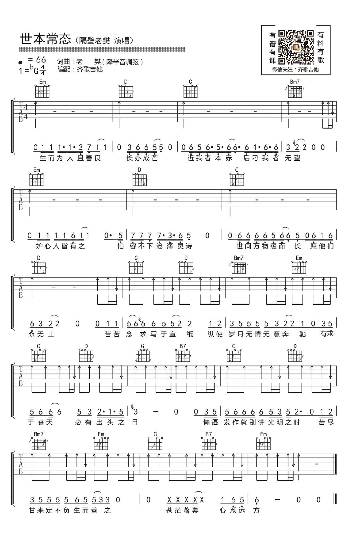 世本常态吉他谱,继《姬和不如》之后,隔壁老樊的新曲,世本常态六线谱,降G调降半音调弦,弹唱图片谱,齐歌吉他编配出品,吉他吧网站上传分享。 嗓音浑厚而略带沙哑歌声,将一词一句轻轻雕刻于听者的心头,褒奖有求于苍天而又努力之人,贬斥那些有着嫉妒之心却又懒癌发作之人,人生道理早已尽数藏于歌中。