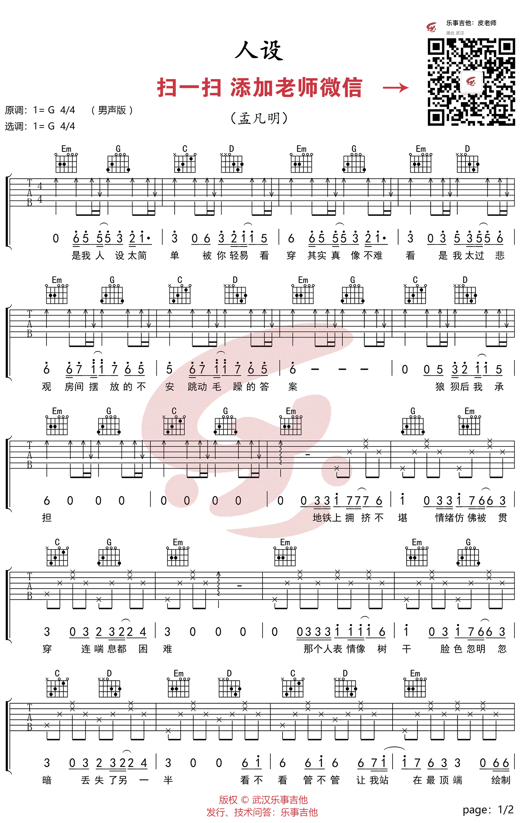 人设吉他谱,孟凡明演唱的一首偏英伦摇滚曲风的歌曲。人设六线谱,G调男生版弹唱谱,高清图片谱,乐事吉他编配出品,吉他吧网站上传。 歌曲表达不只是个体情绪,通过音乐把对事物的感知体验表达抒发,形成独有的思考体系。合理的审视自己,确是场盛大的洗礼。不轻易定义的人设,就像感情里的忽明忽暗。