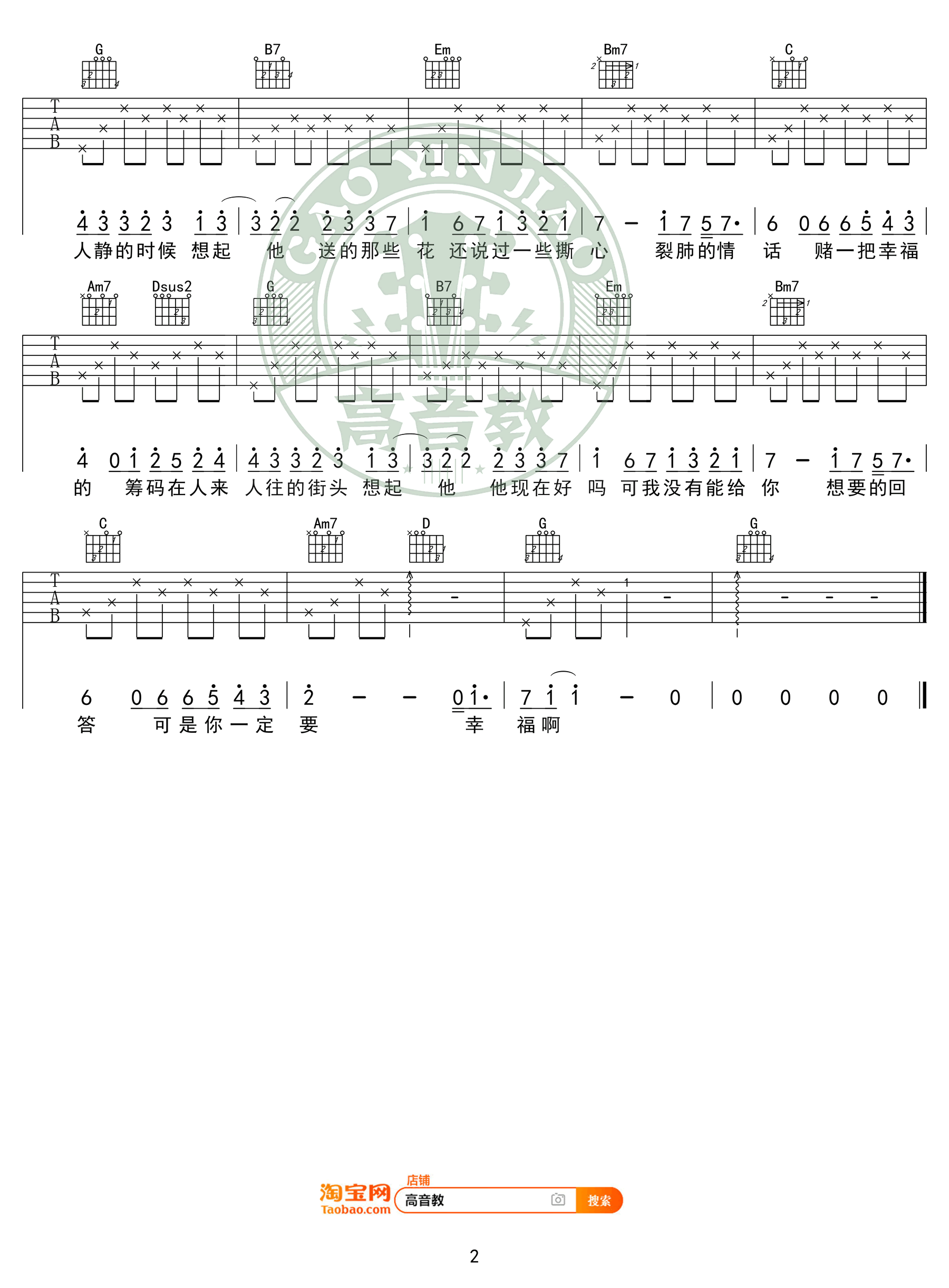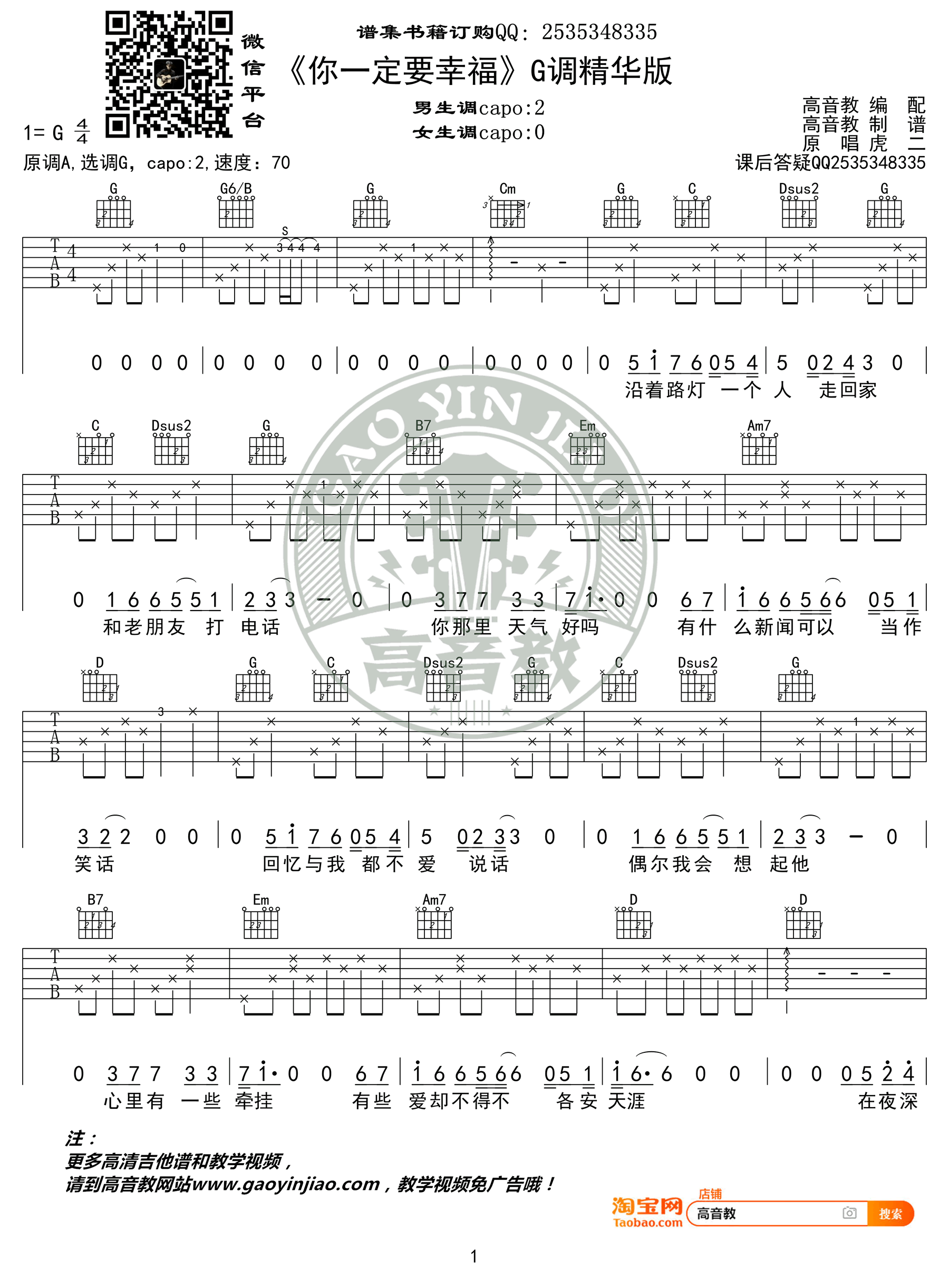 你一定要幸福吉他谱,虎二翻唱版本,原调A,选调G,男生CAPO夹二品。你一定要幸福六线谱,高清弹唱图片谱。感谢高音教编配出品,吉他吧网站上传。 喜欢刷抖音的小伙伴对虎二应该不会陌生,很多歌曲被他翻唱后,会别有一番味道。每个人的心中曾经都会有那么一个特别美好的记忆,也都会有一个觉得让我们内疚的人。我们不想表达,不愿被提起,但挥之不去。 一句“你一定要幸福”,便是最好的祝福。