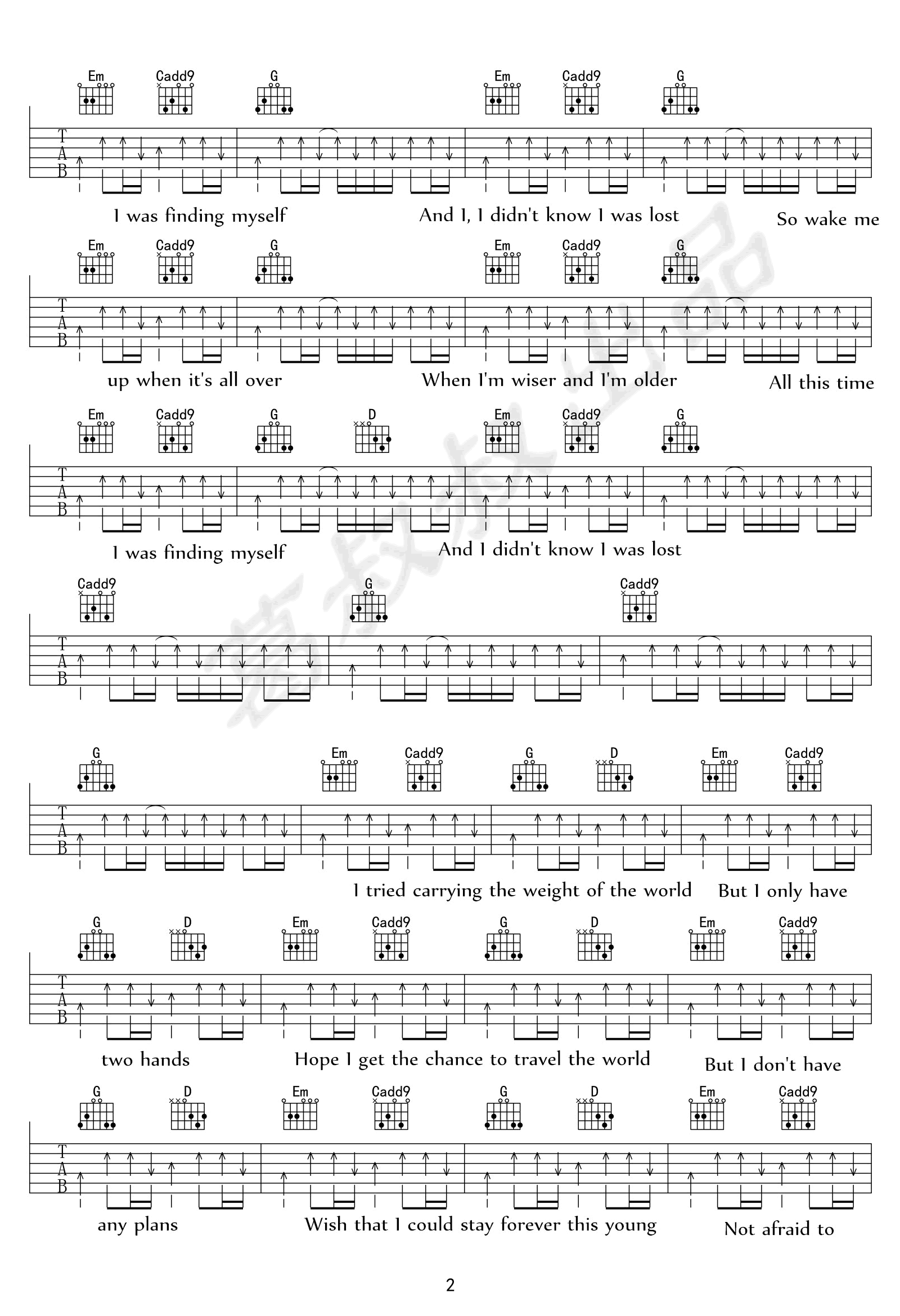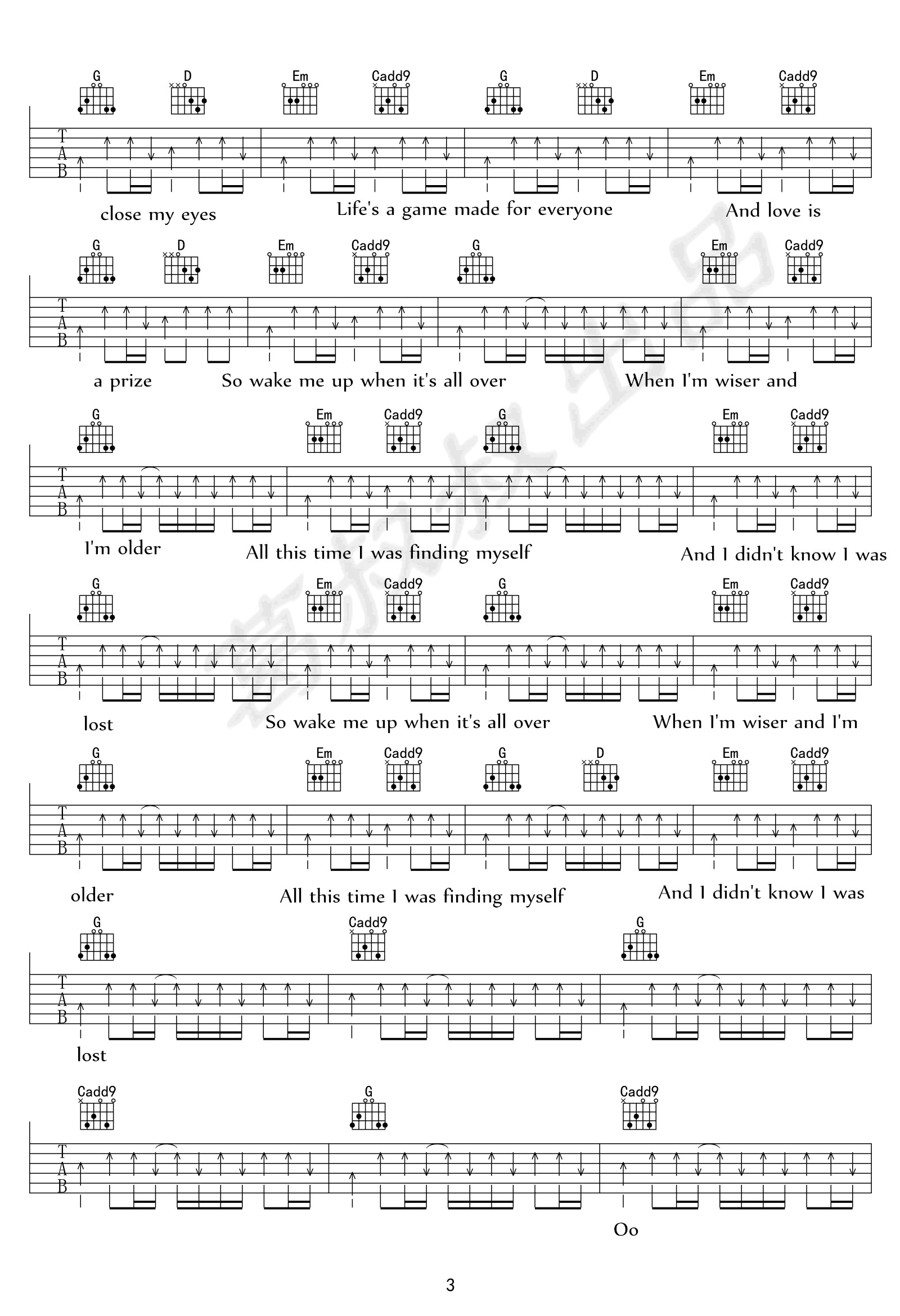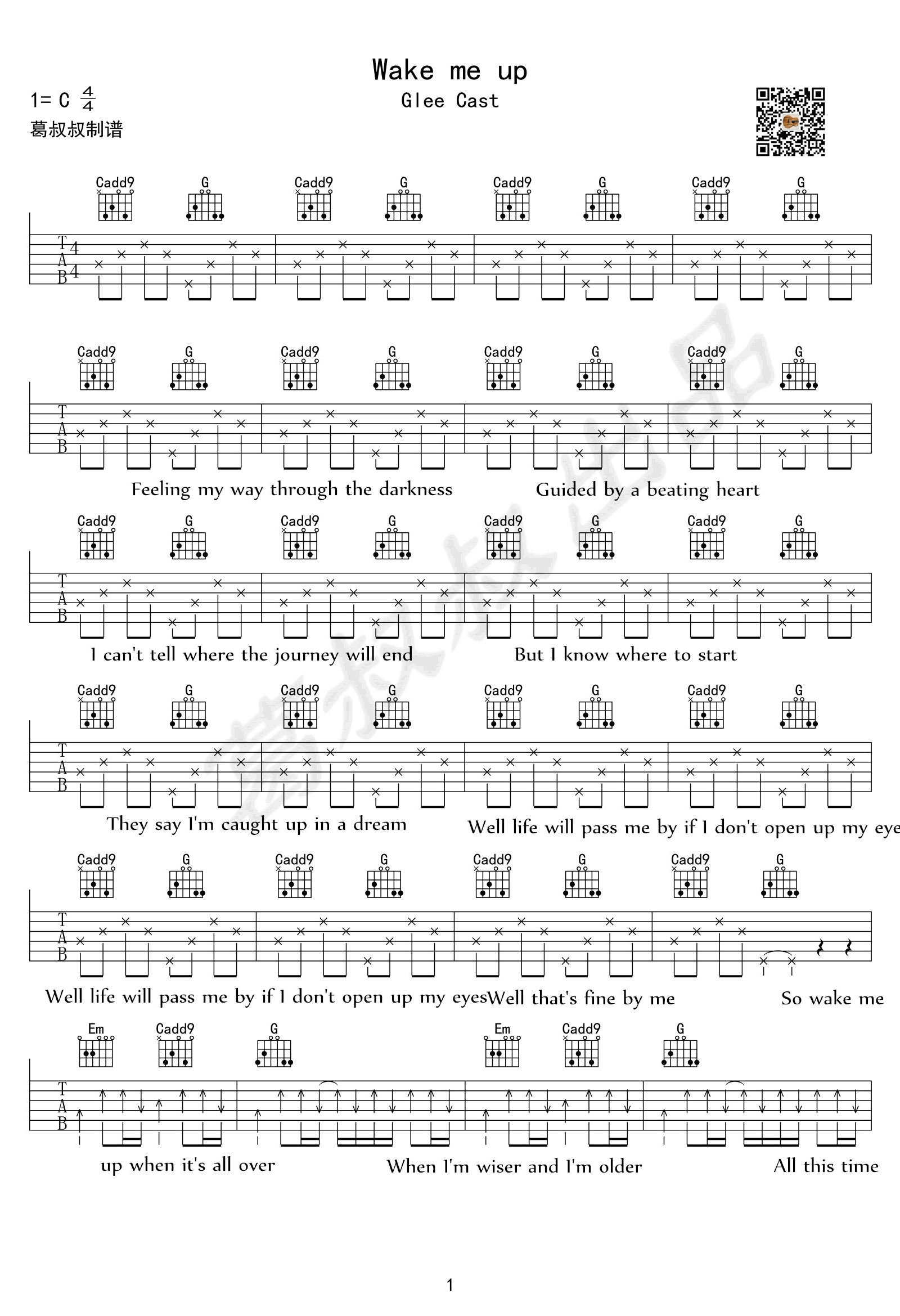 Wake me up吉他谱,Glee Cast翻唱版本,一首经典英文歌曲。Wake me up六线谱,C调弹唱谱,完整版共四张图片谱例。感谢葛叔叔编配制谱,吉他吧上传分享。 这首歌出自欢乐合唱团的专辑 Glee: The Music, the Back Up Plan ,原唱是Avicii,原作是节奏很快的一首歌,这个版本的改编,更励志了,也是很好听的。这个歌前奏很像晴天,后面和平凡之路和弦是一样的。