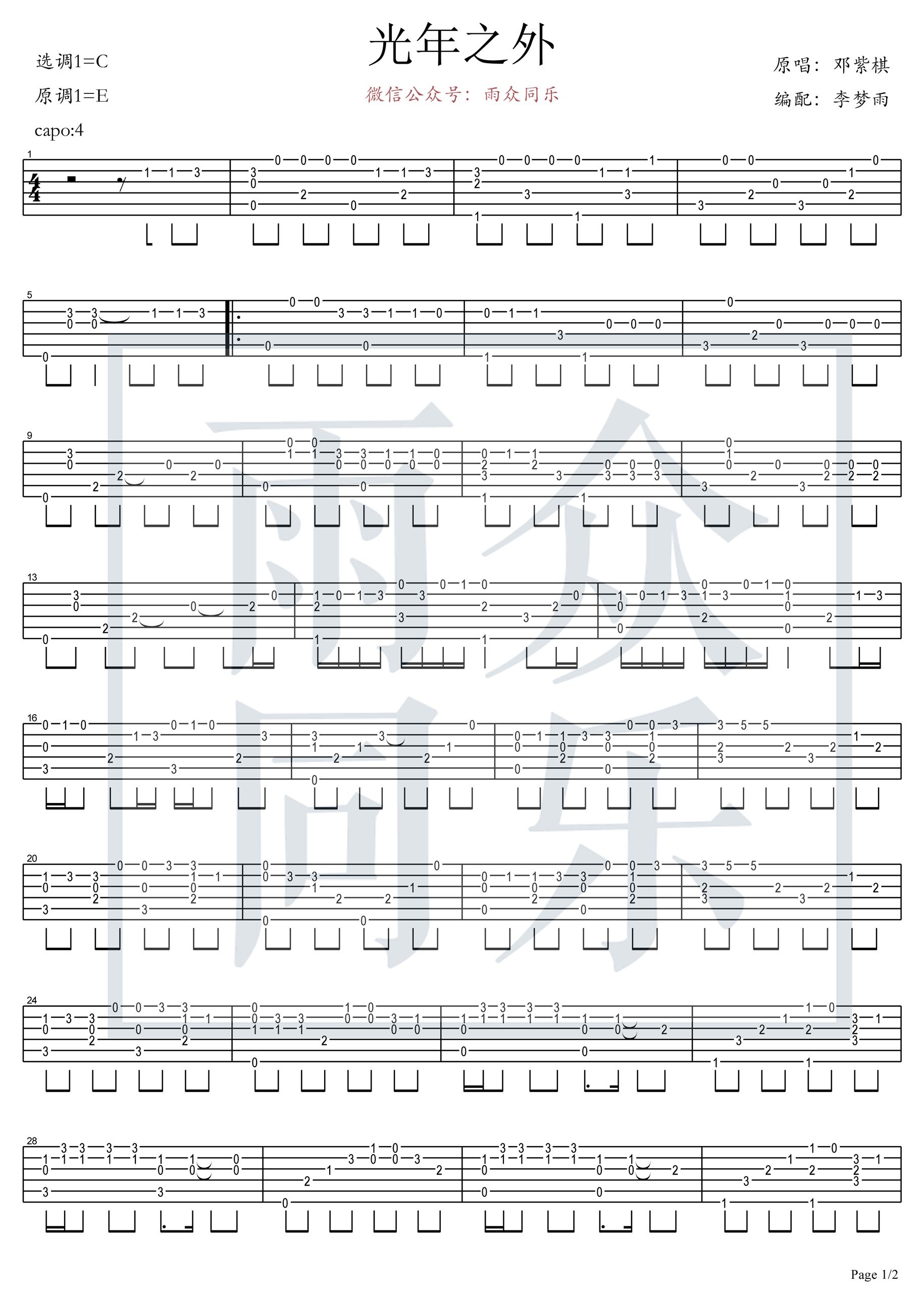 光年之外吉他谱指弹版,邓紫棋为《太空旅客》创作的电影主题曲改编,原调E,选调C,CAPO夹四品,光年之外吉他独奏谱,雨众同乐编配出品,吉他吧网站上传。 饱含深情的旋律优美灵动,诚挚真切的演绎,营造出一种飘渺梦幻的氛围,令听者感动。