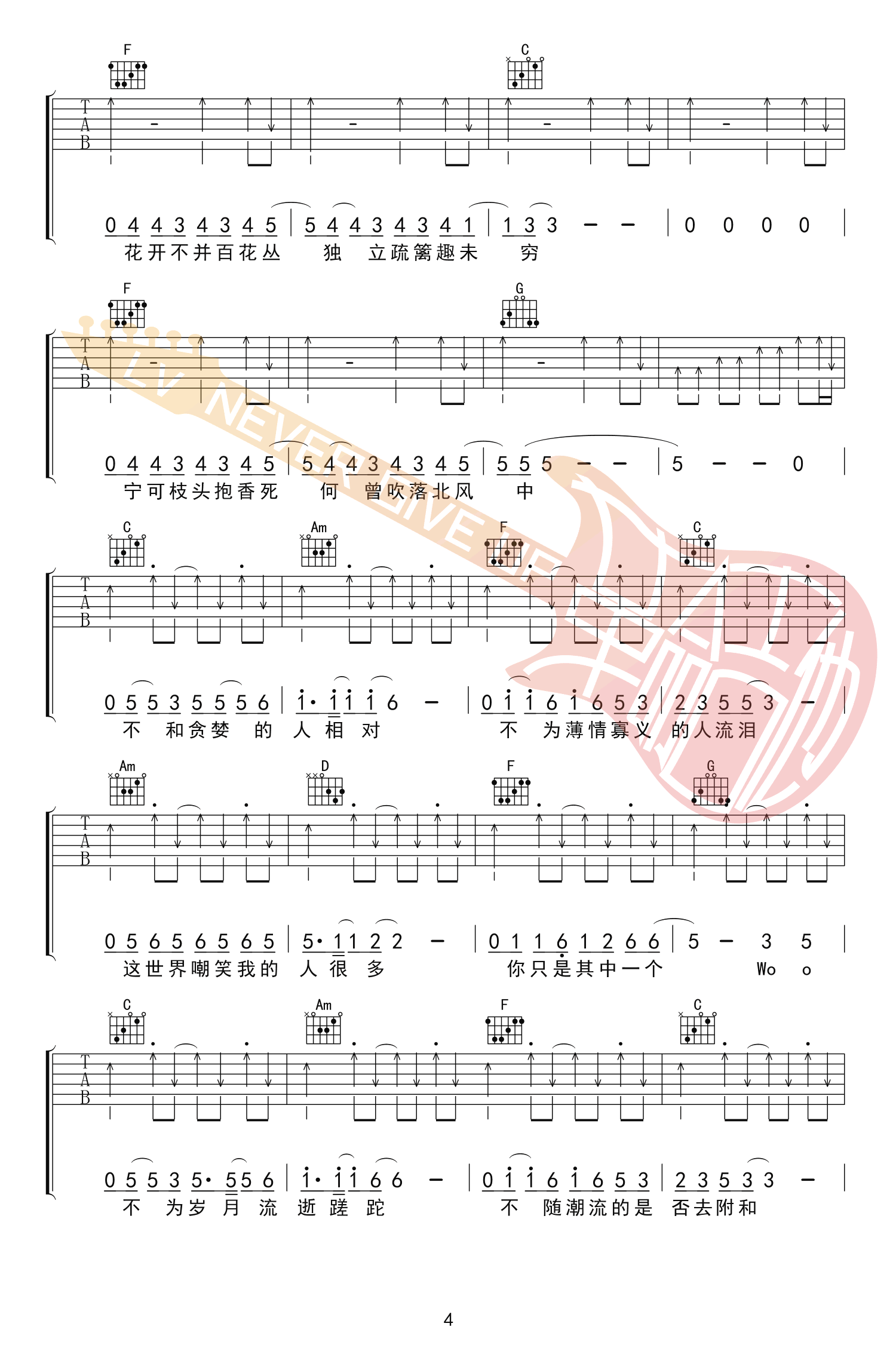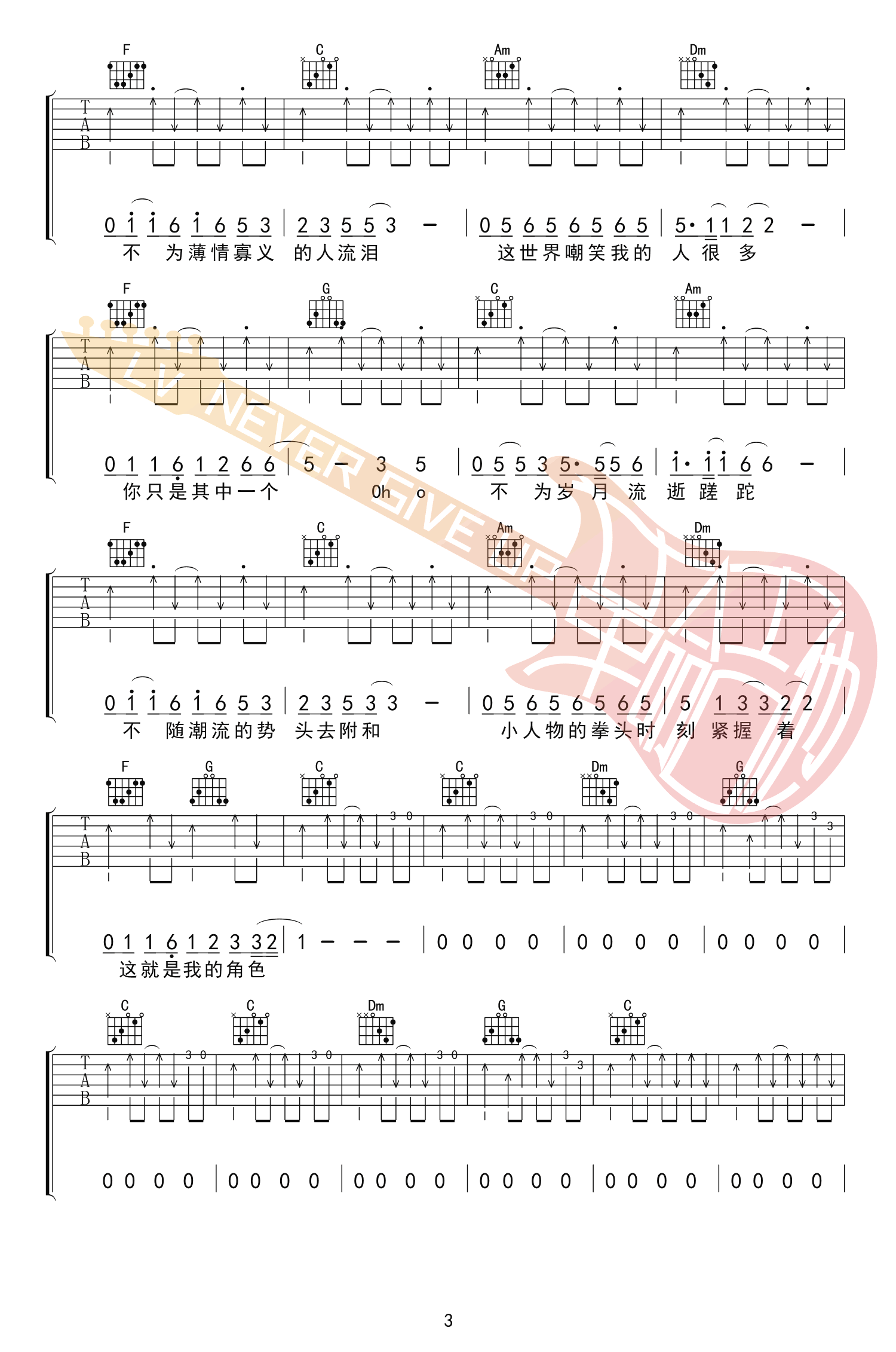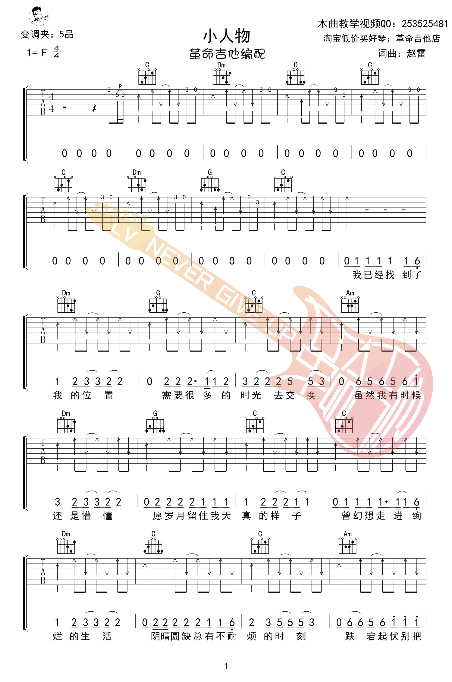 赵雷《小人物》吉他谱,原调F,选用C调指法,变调夹夹五品。赵雷2495巡演新歌完整版,小人物六线谱,高清弹唱谱共五张图片谱例。感谢革命吉他编配出品,吉他吧网站上传。 不和贪婪的人相对,不为薄情寡义的人流泪。也许我们始终都只是一个小人物,但这并不妨碍我们选择用什么样的方式生活。我们并非拒绝平凡,我们拒绝的只是平庸,小人物一样也有大梦想。