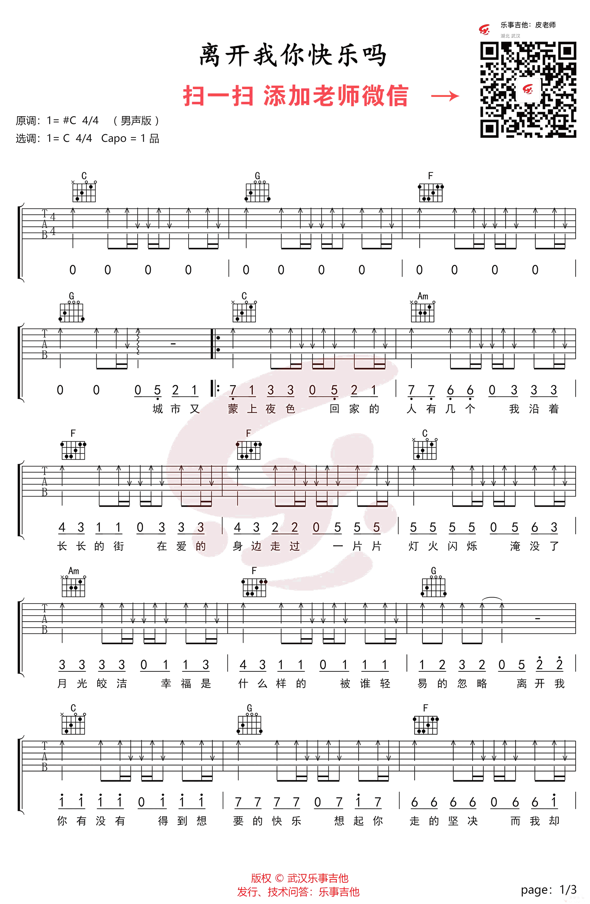 离开我你快乐吗吉他谱,抖音翻唱红人虎二演唱的原创新歌,离开我你快乐吗六线谱,原调#C男生版,选用C调指法,CAPO夹一品,乐事吉他出品,吉他吧上传分享。 离开我,你得到想要的快乐了吗?过着想过的生活了吗?愿你嫁的生活波澜不惊,平安过此生。娶的理想一帆风顺,精彩万分。