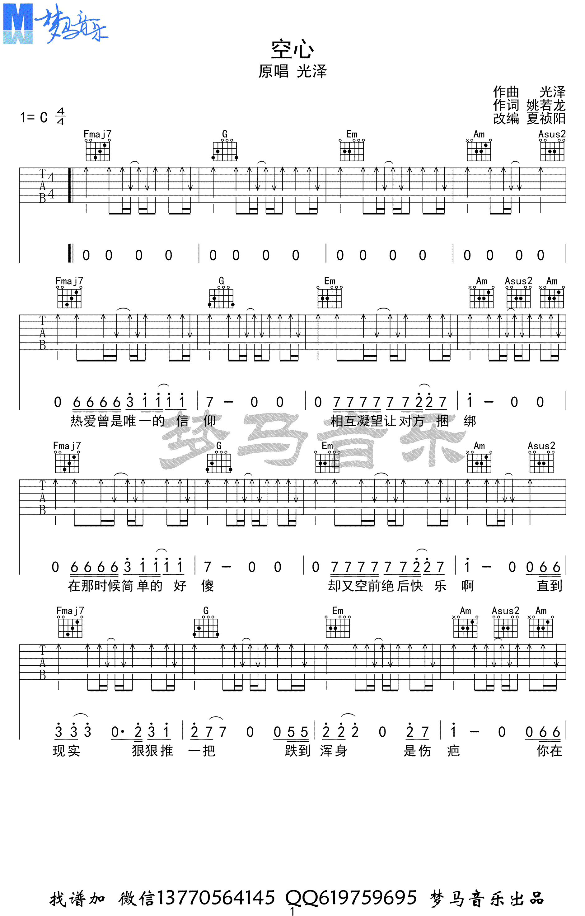 空心吉他谱,光泽的一首歌曲,C调指法,高清弹唱谱,空心六线谱,完整版共五张图片谱例。感谢梦马音乐出品,吉他吧网站更新分享。夏祯阳老师要点讲解:这首歌曲整首歌都是四个和弦在不断的循环重复,很简单。节奏都是差不多的扫弦,略有变化。结尾部分因为我怕太单调,就扒了一下原曲的结尾旋律。开头部分的旋律是我自己加的,也是为了让歌曲更丰富一点。开头和结尾在谱子里没有写出来,就当我的一点保留吧。