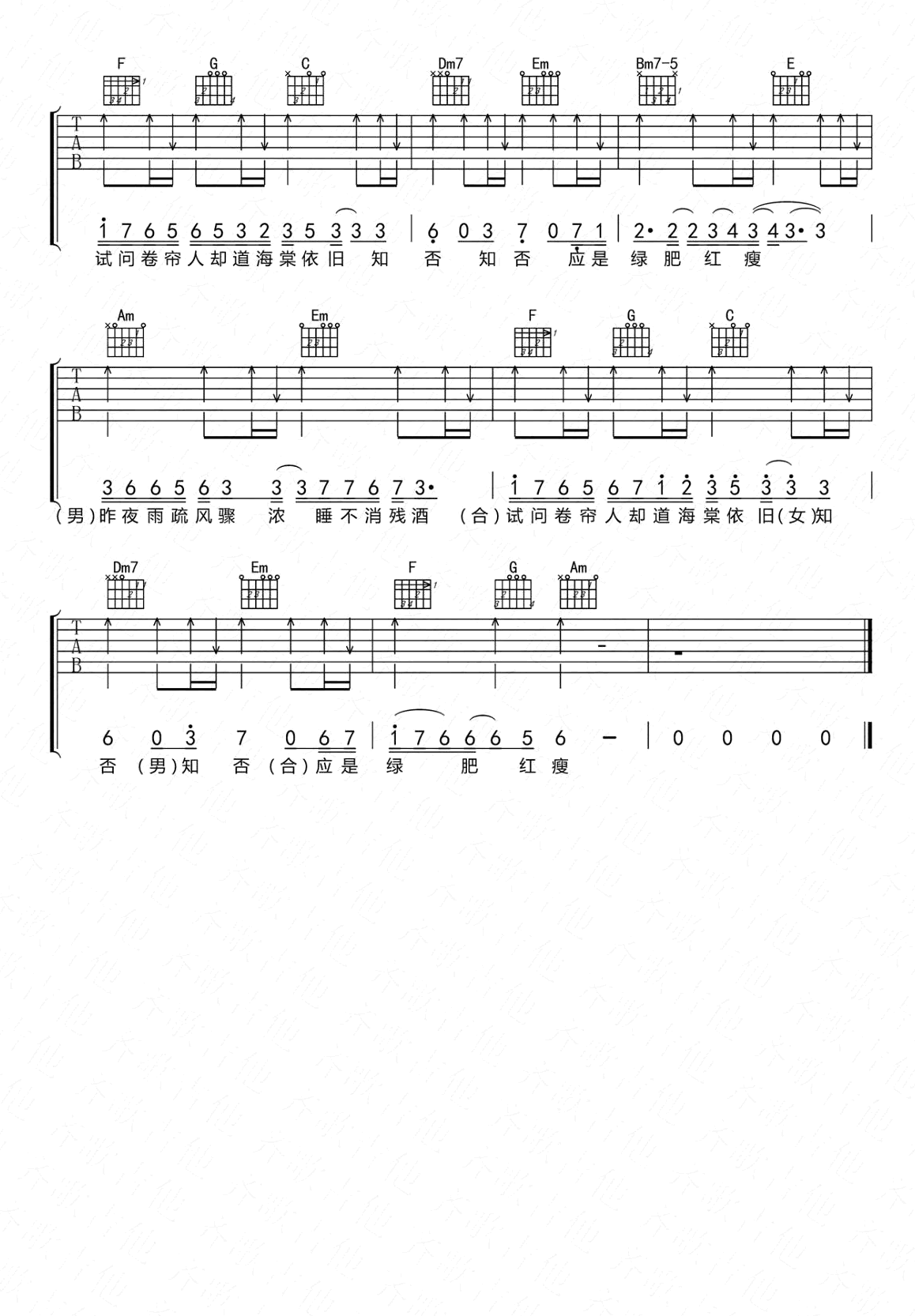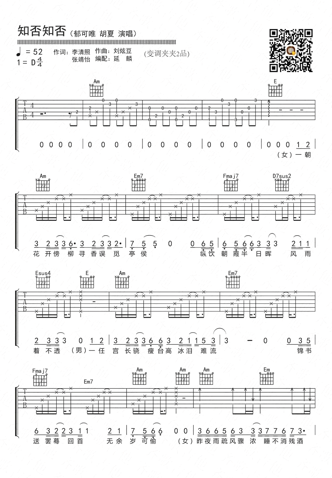知否知否吉他谱,郁可唯和胡夏演唱,原调D调,变调夹夹二品,电视剧《知否知否应是绿肥红瘦》主题曲,知否知否六线谱,简单和弦弹唱谱,感谢延麟编配,吉他吧网站上传分享。 采用李清照《如梦令》诗词创作的古风歌曲,男女唱和的歌声极具温柔,悠长婉转的旋律,几分伤感中又带着一丝丝的不屈。海棠依旧,应是绿肥红瘦。不知景何美,却闻声依旧。