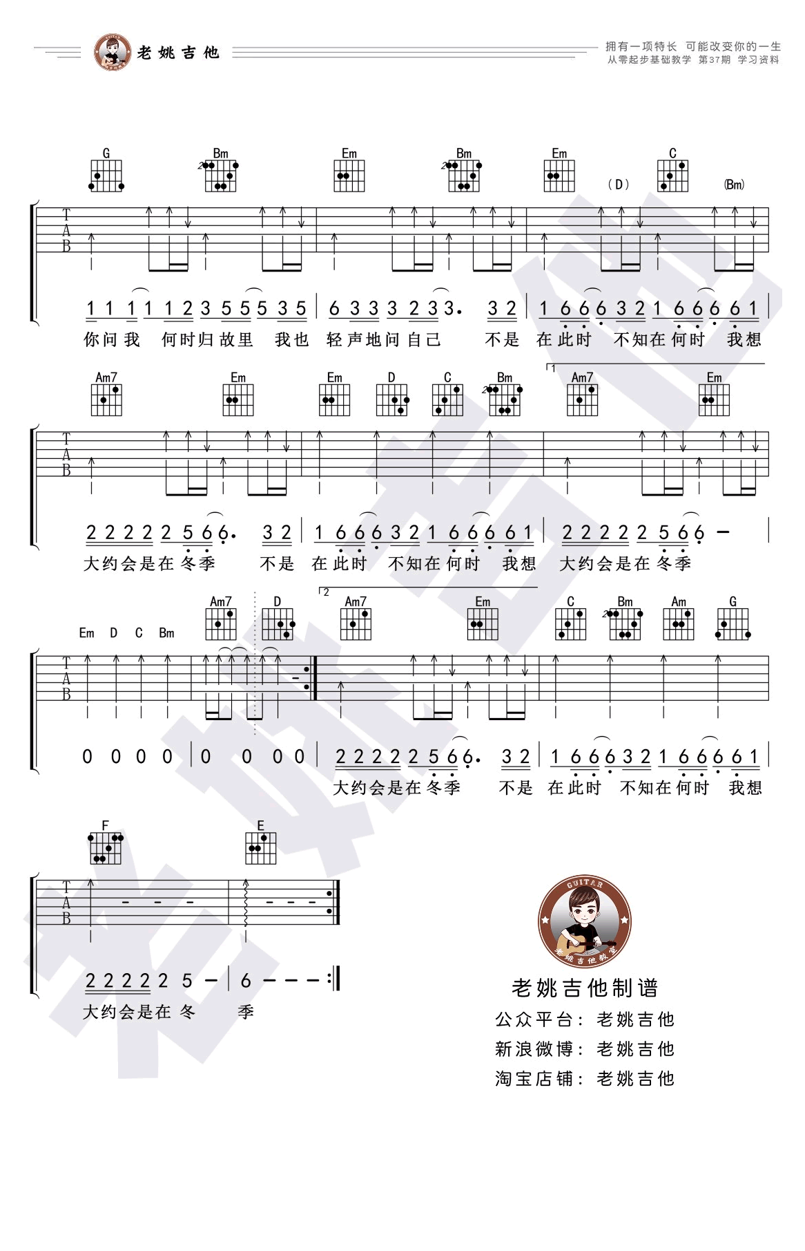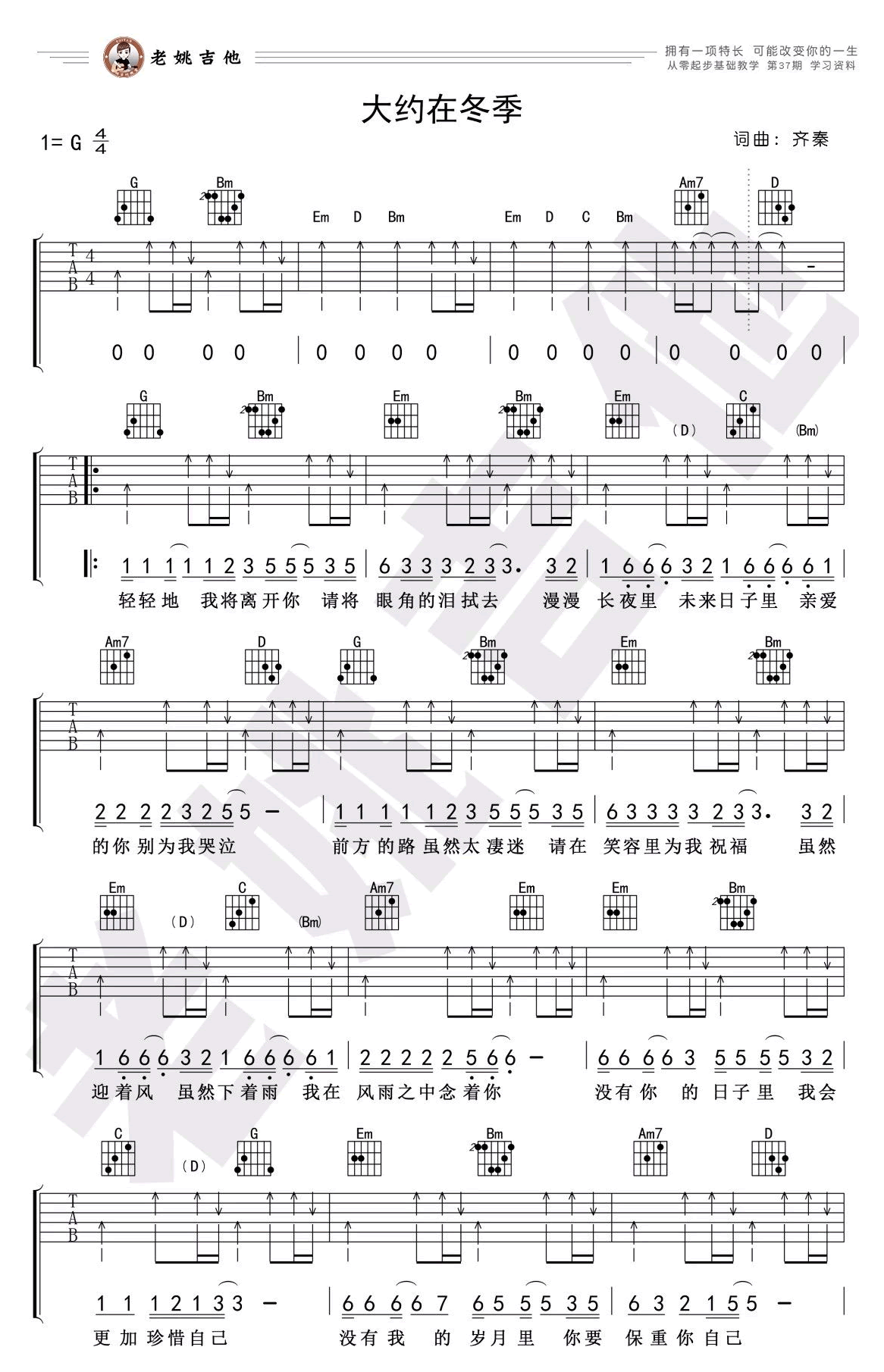 大约在冬季吉他谱,齐秦的一首成名经典老歌,G调弹唱谱,扫弦版编配,大约在冬季六线谱,高清图片谱。老姚吉他出品,吉他吧网站上传分享。随谱附上《大约在冬季》吉他弹唱教学视频,琴友们打开节拍器,把握好切分音节奏,跟随老师的讲解示范练习。