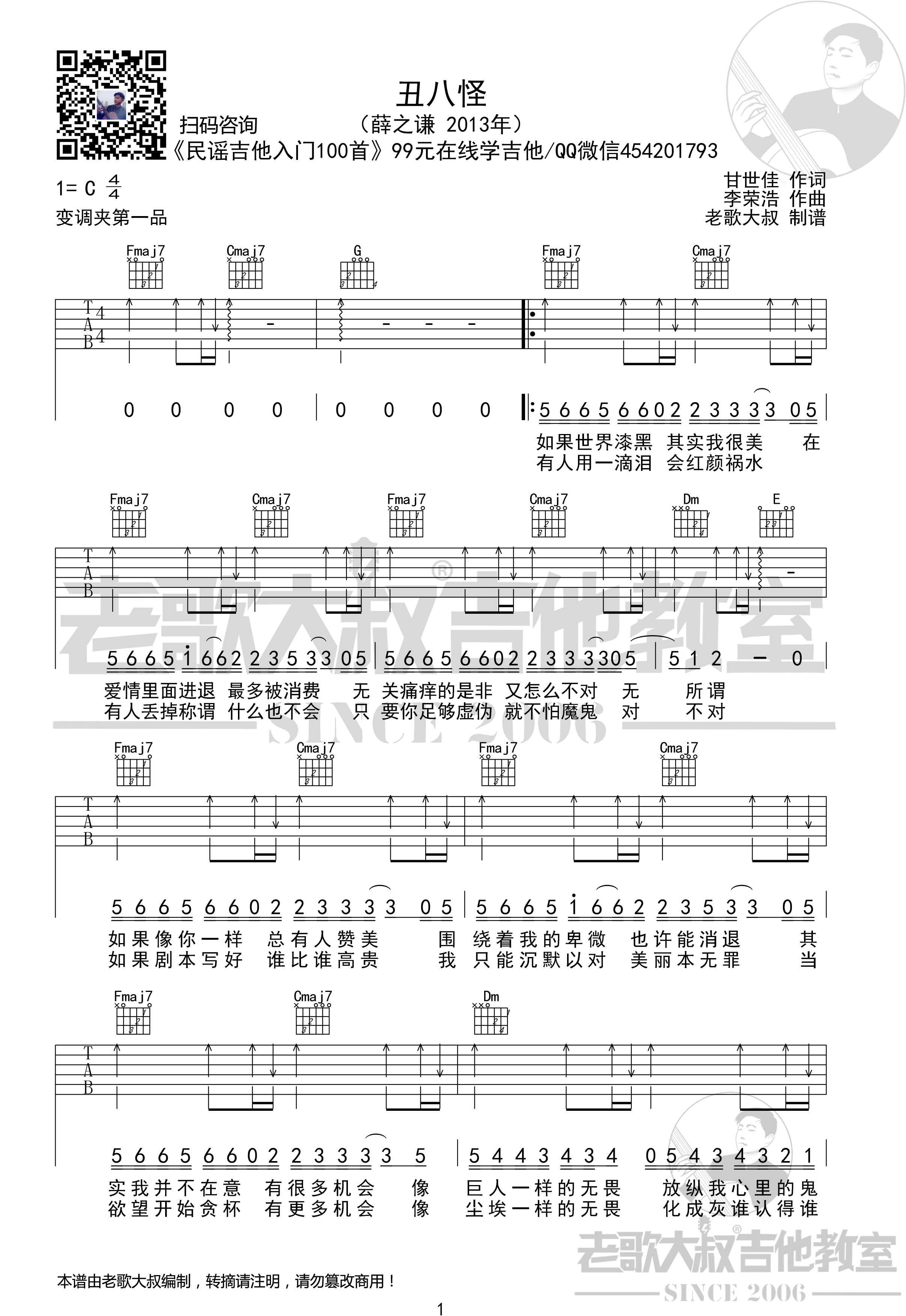 薛之谦《丑八怪》吉他谱_指弹谱_六线谱_C调弹唱谱_扫弦版超清谱