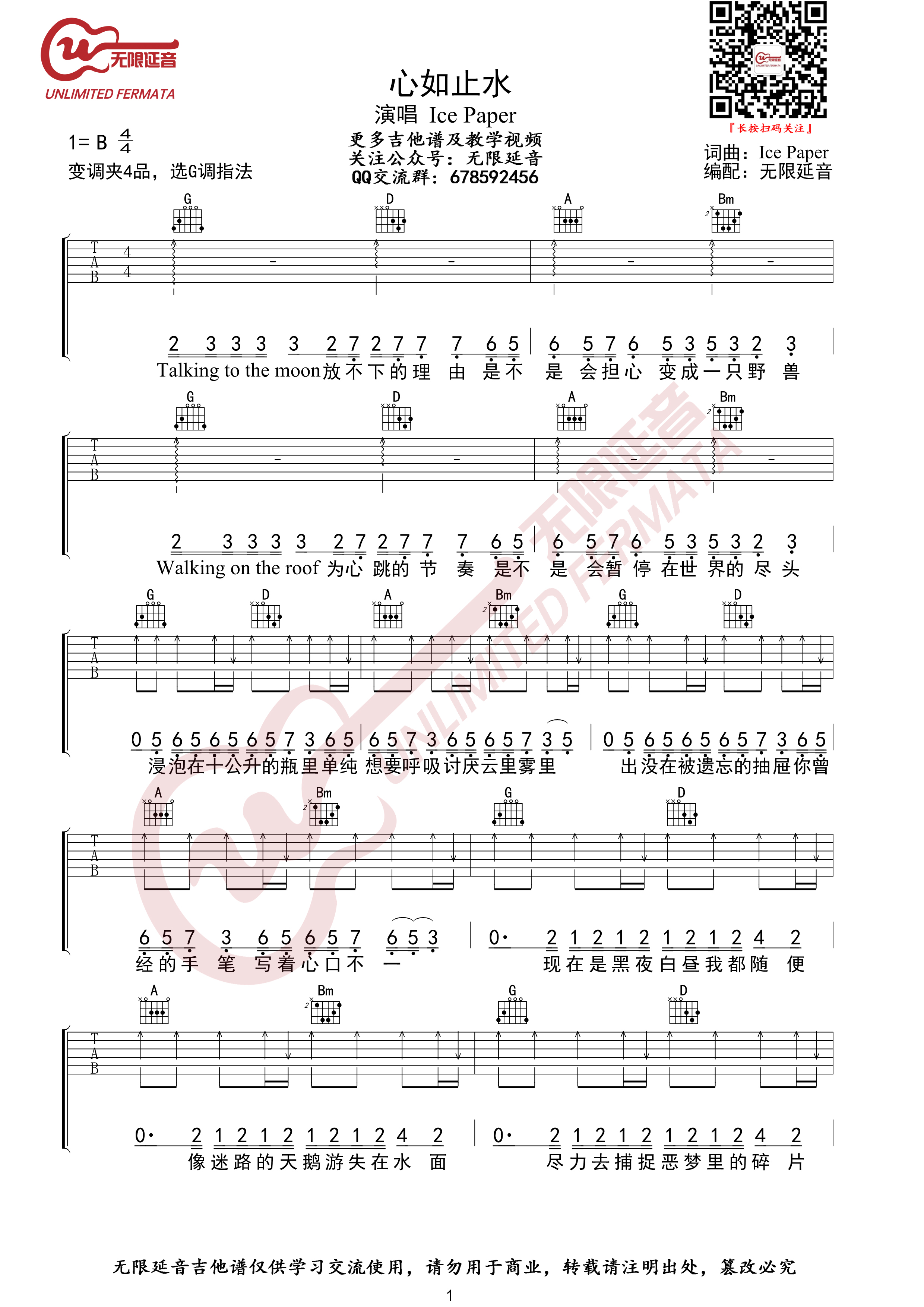这是Ice Paper演唱的歌曲。《心如止水》吉他谱,变调夹4品,选用G调指法,吉他谱六线谱,IcePaper演唱的抖音热曲,心如止水吉他谱由无限延音编配。