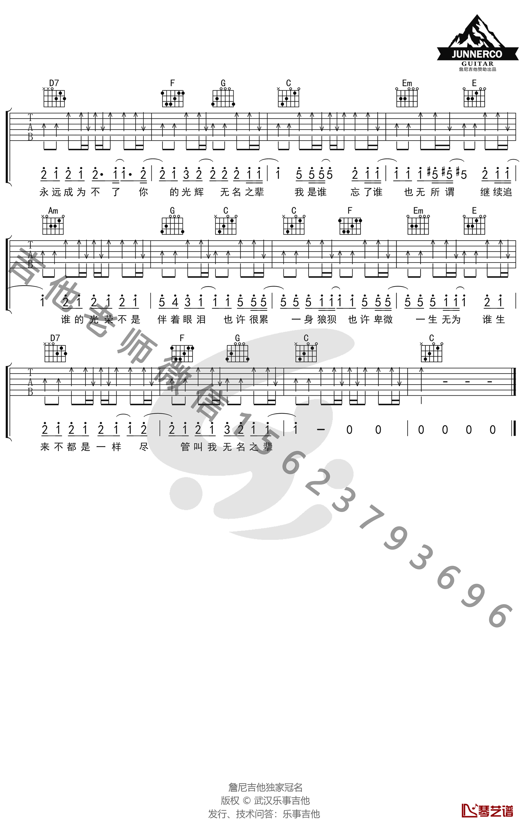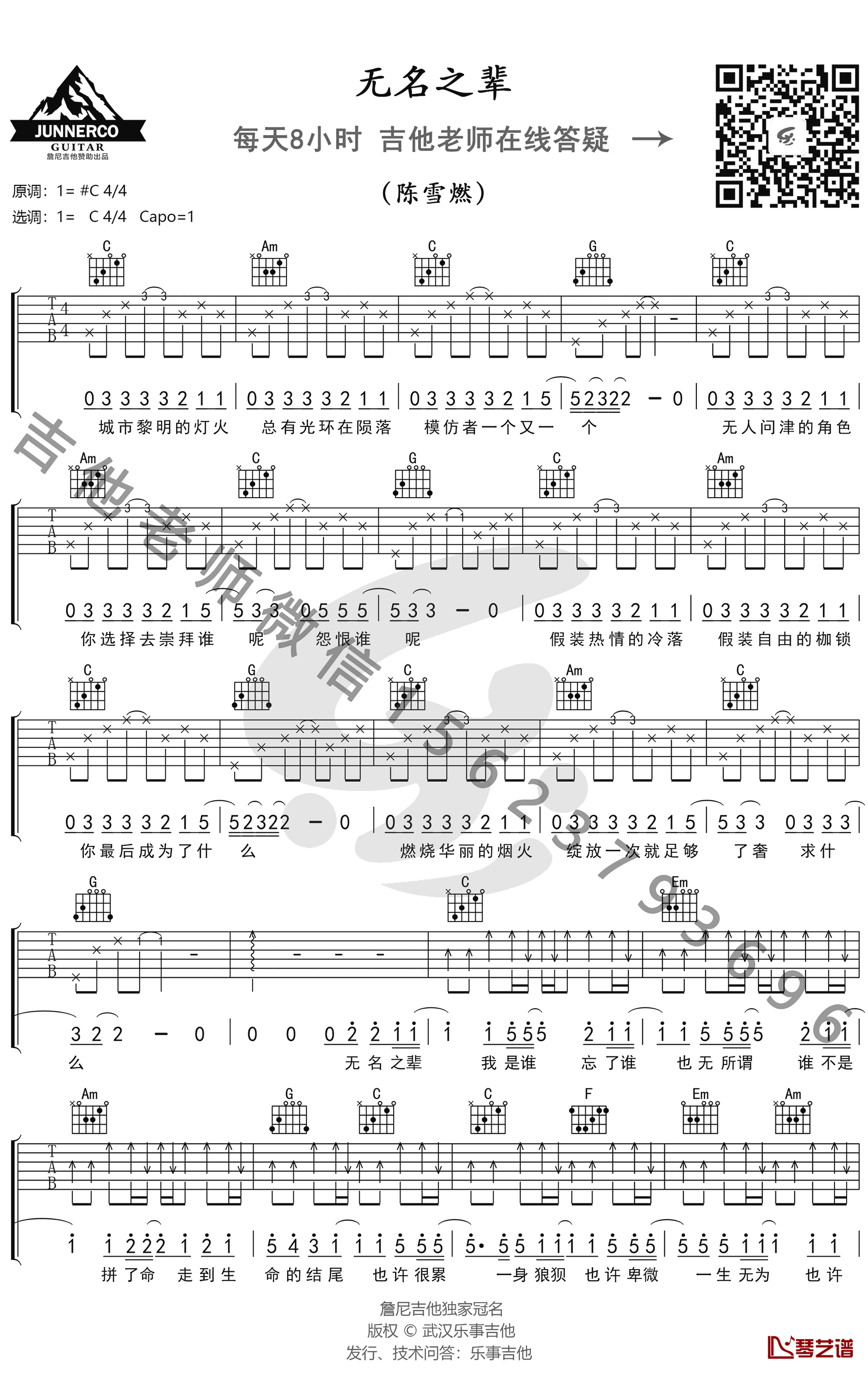 无名之辈吉他谱,C调弹唱谱,变调夹夹一品,电视剧《亲爱的,热爱的》的主题曲,无名之辈六线谱,高清弹唱图片谱,乐事吉他编配出品,陈雪燃演唱,随着电视剧《亲爱的,热爱的》热播,这首主题曲《无名之辈》火遍大江南北,歌曲给人以压抑但又积极向上的感觉,孤单奋斗的人比比皆是,成功亦或者失败,都不能抹消我们的努力,谁还不是无名之辈!