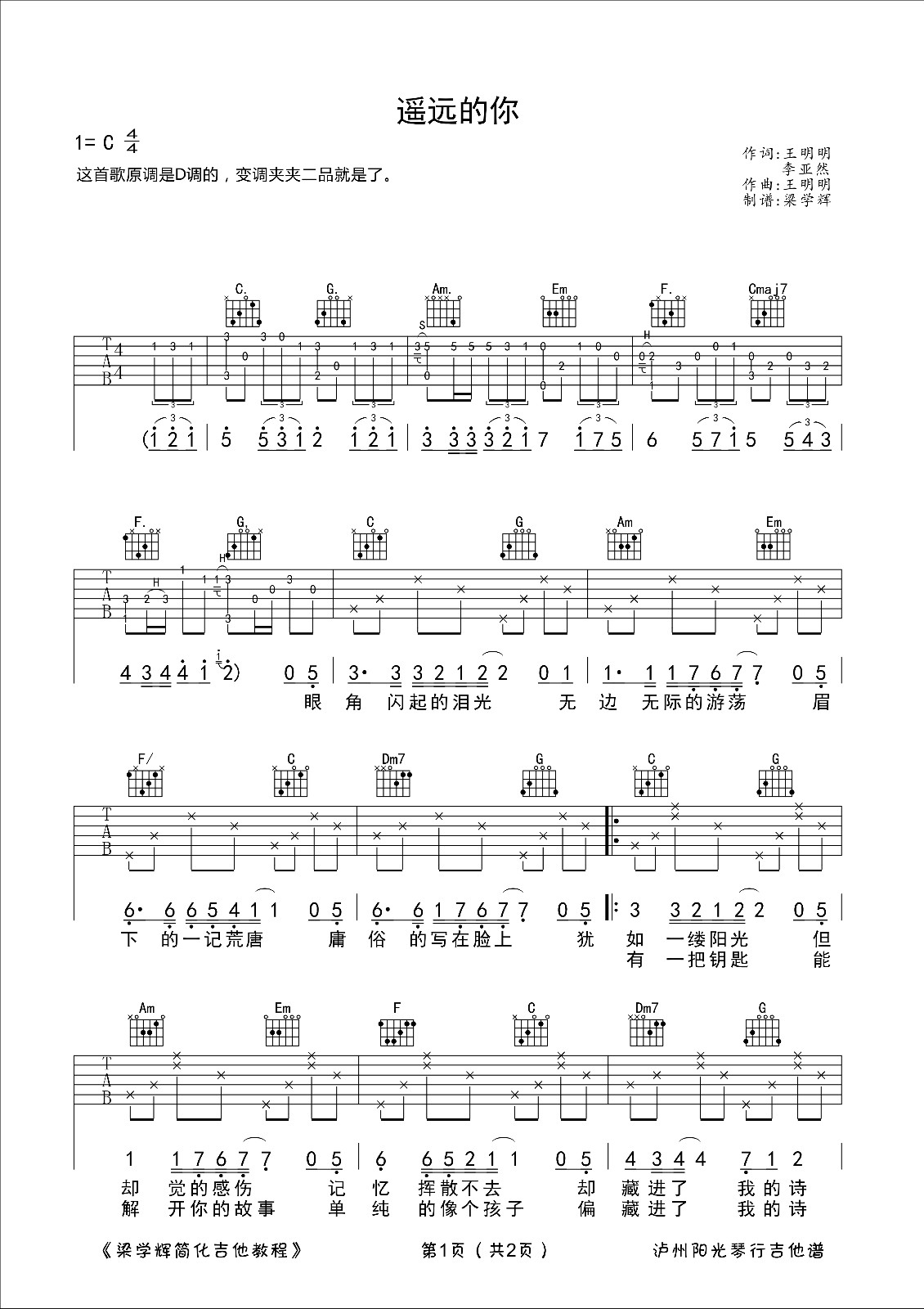 这首陈曦《遥远的你》吉他弹唱谱,谱子是 C 调图片吉他谱,原调为 D 调,吉他谱调为 C 调指法,节拍为 4/4 拍,弹唱的时候可以使用变调夹夹二品。