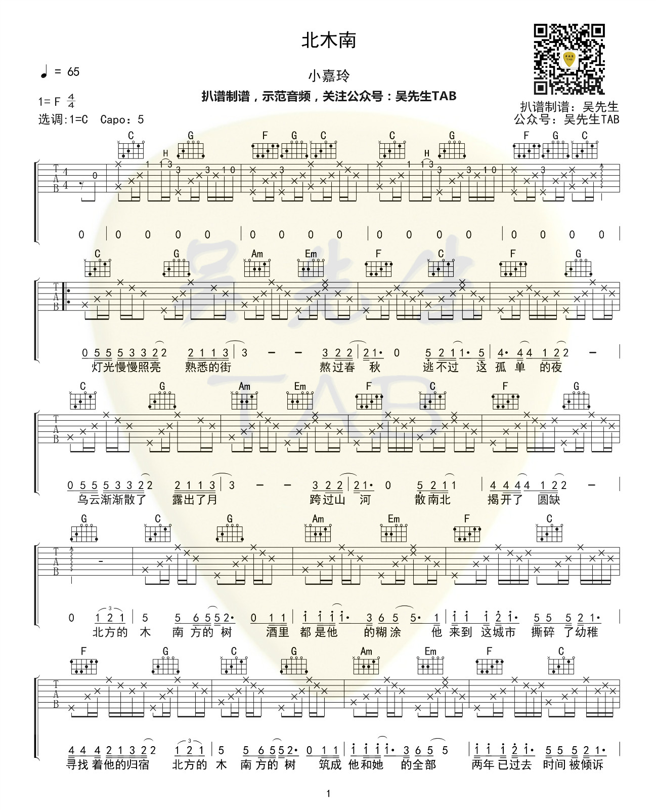 《北木南》吉他谱,小嘉玲原版弹唱谱,罗永川原创的一首民谣歌曲,在抖音平台成为热门曲目。北木南六线谱,原调F,选调C调,变调夹夹五品,两张高清图片谱。吉他专家编配,易唱网整理分享。 北木南树,迟也是你,晚也是你;北木南树,冬雷夏雪,竟是迷途;北方的木,南方的树,最后终是成了陌路人,互不打扰,遗憾千万种,人人各不同。