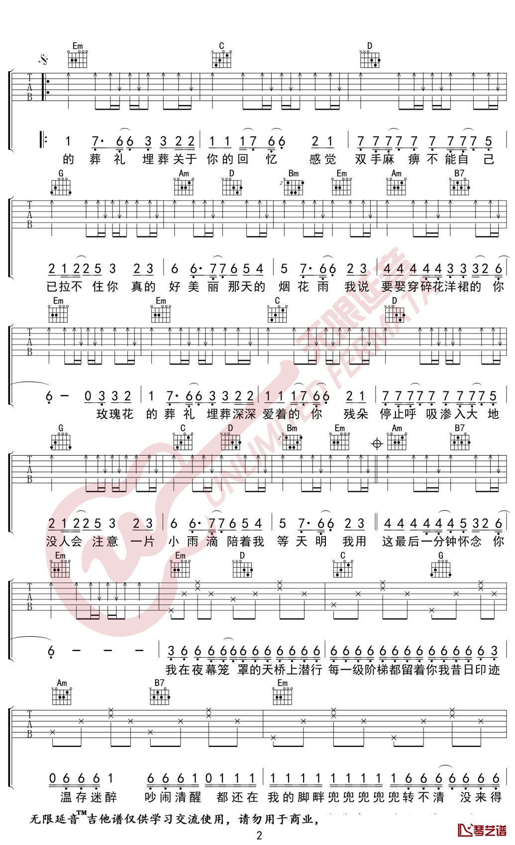 许嵩《玫瑰花的葬礼》吉他谱六线谱G调指法弹唱