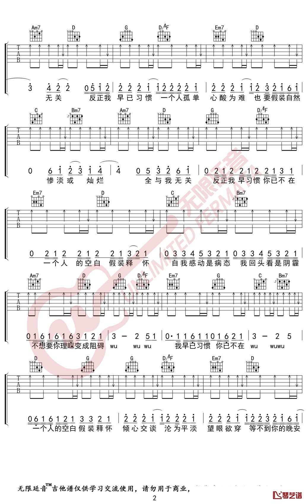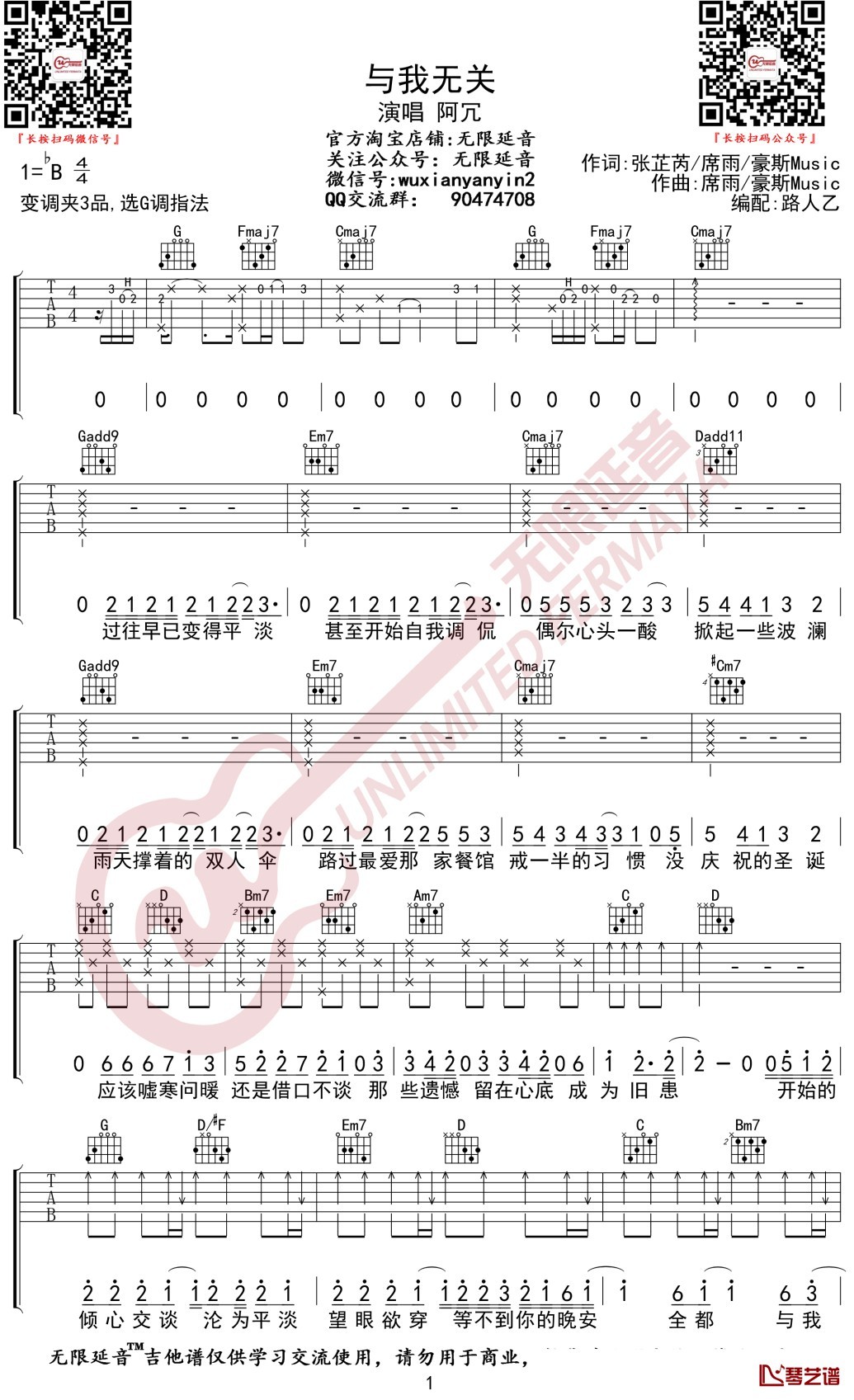 阿冗《与我无关》吉他谱六线谱 G调弹唱谱