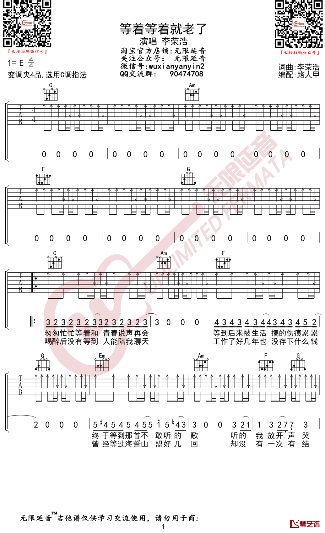 李荣浩《等着等着就老了》吉他谱六线谱E调弹唱谱