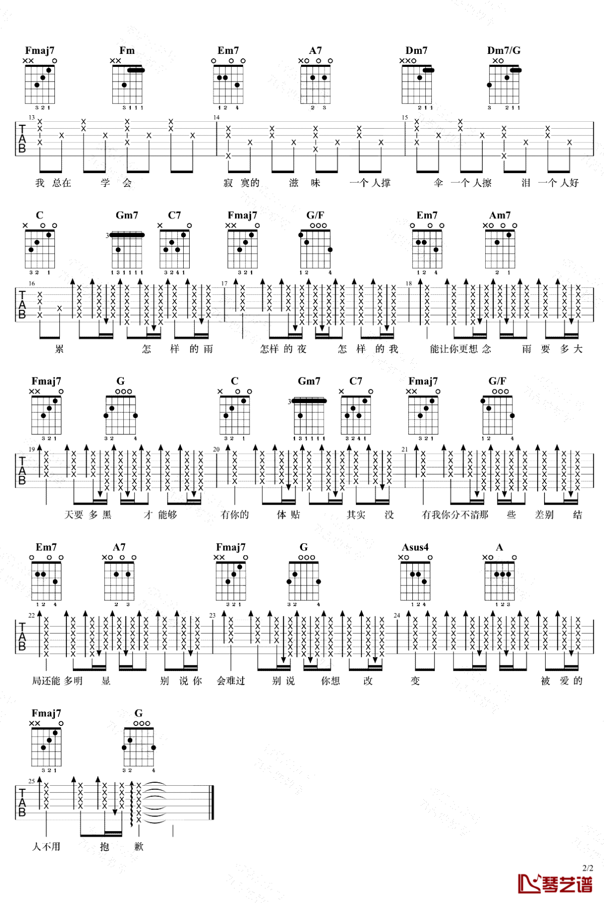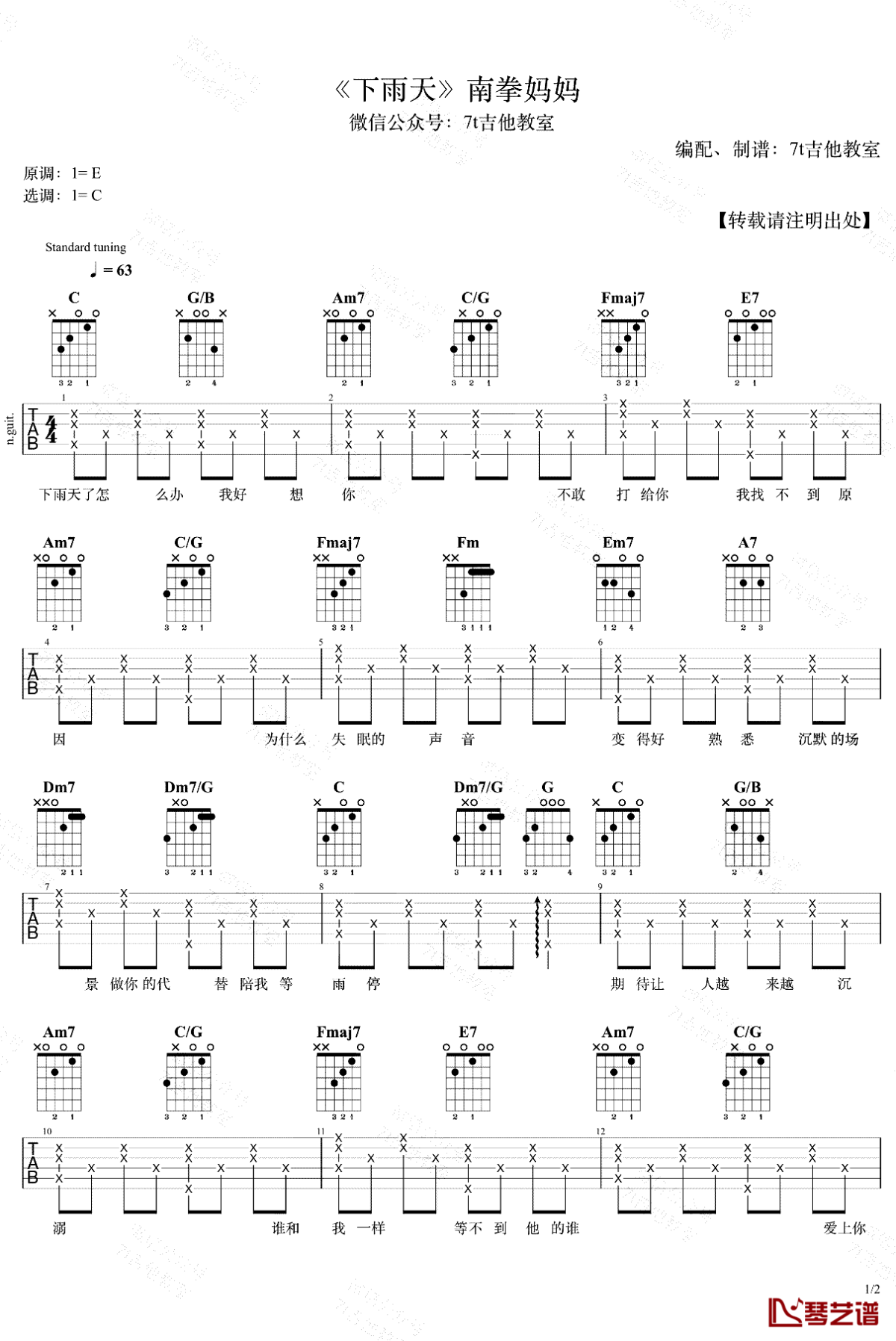 南拳妈妈《下雨天》吉他谱C调简单版附弹唱视频