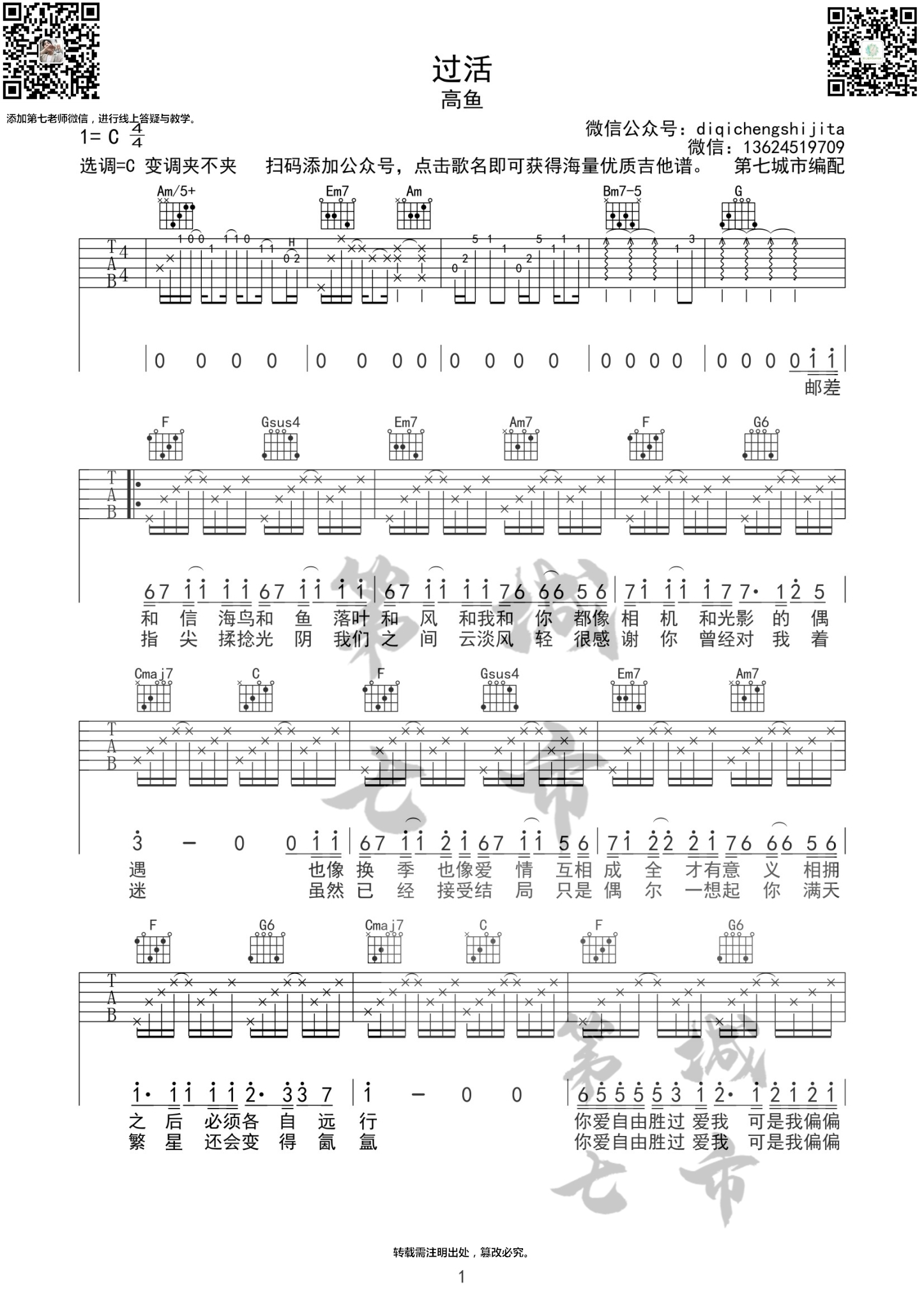 高鱼《过活》吉他谱C调弹唱谱