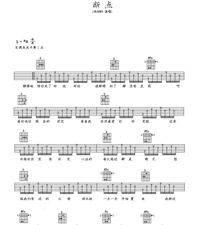 张敬轩《断点》吉他谱六线谱原调降B