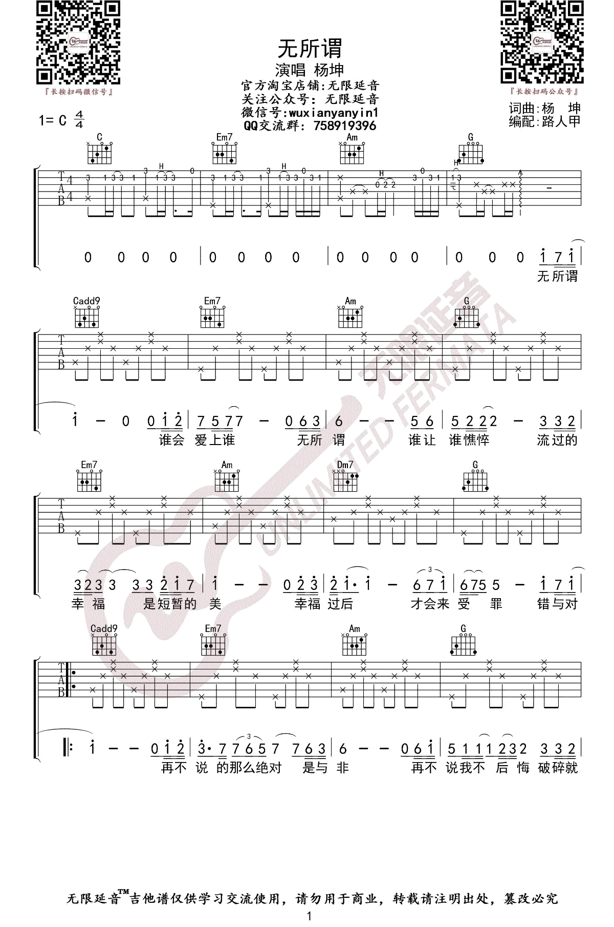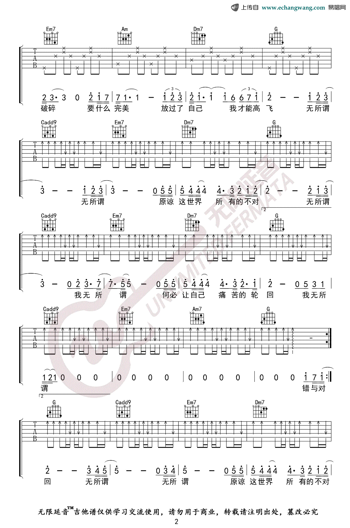 杨坤《无所谓》吉他谱六线谱