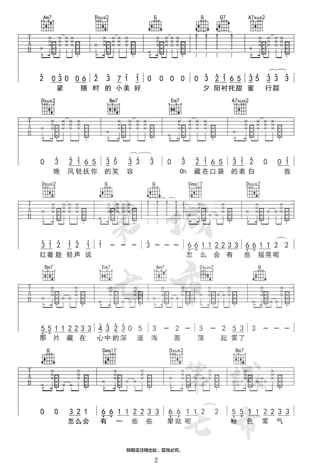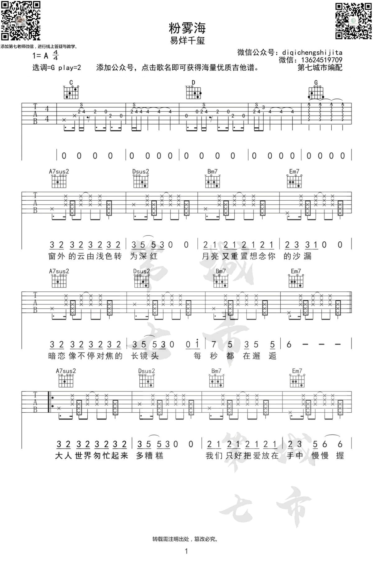 易烊千玺《粉雾海》吉他谱选调G调六线