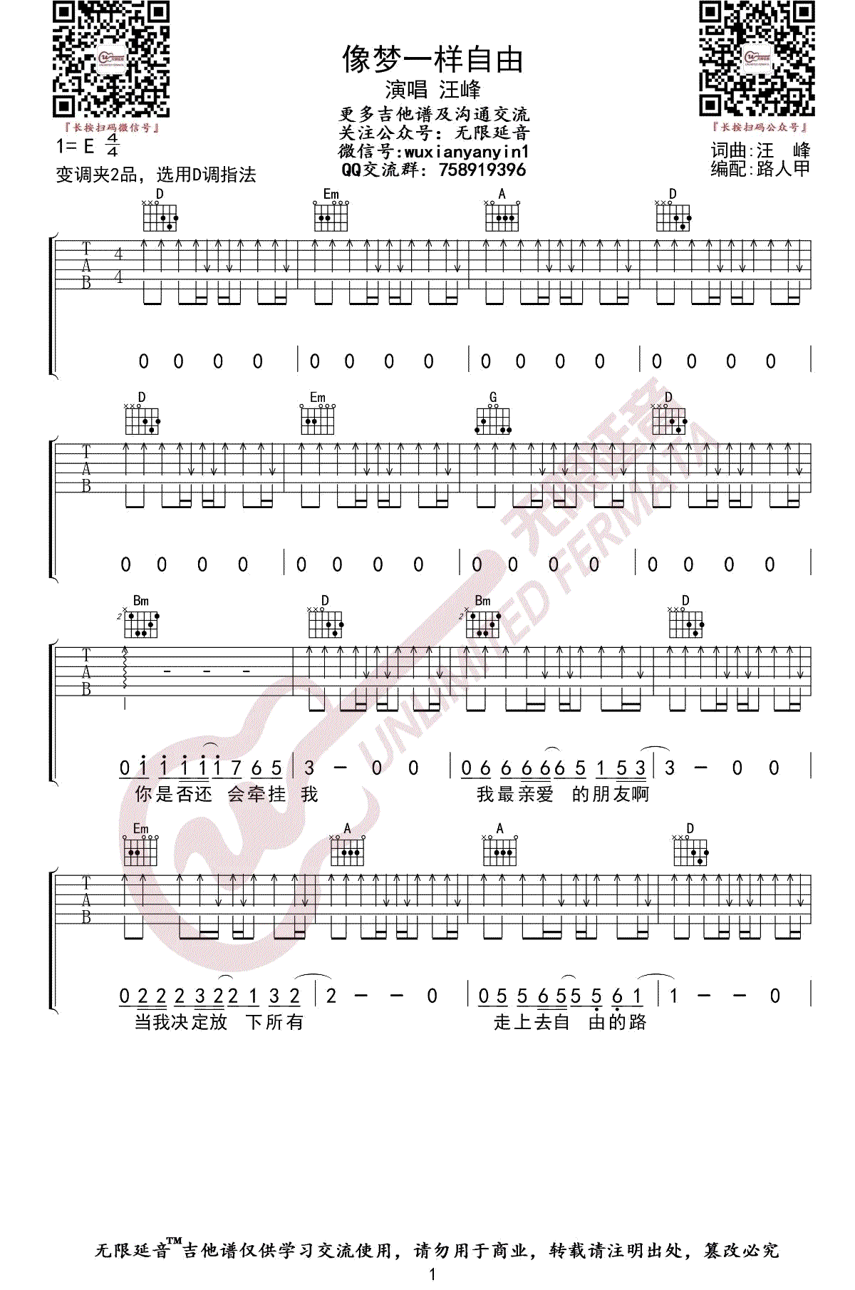 汪峰《像梦一样自由》吉他谱E调六线谱