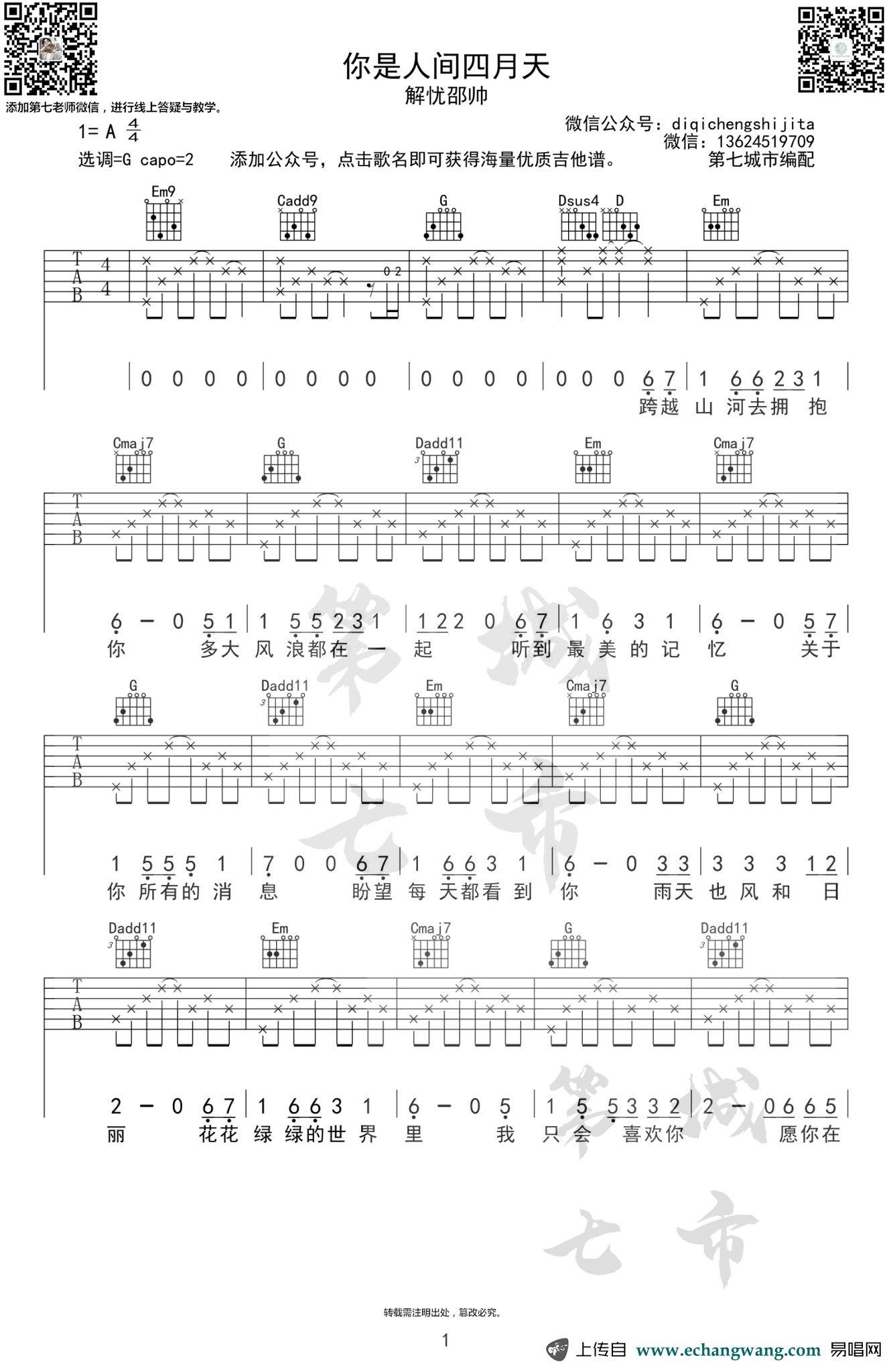 解忧邵帅《你是人间四月天》吉他谱六线谱