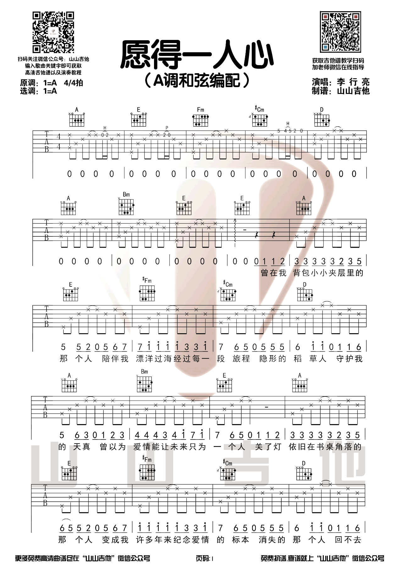 李行亮《愿得一人心》吉他谱原调A六线谱