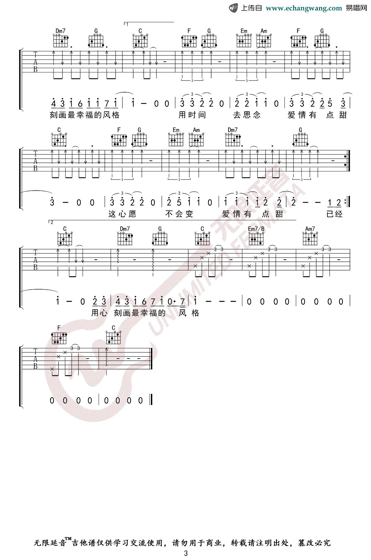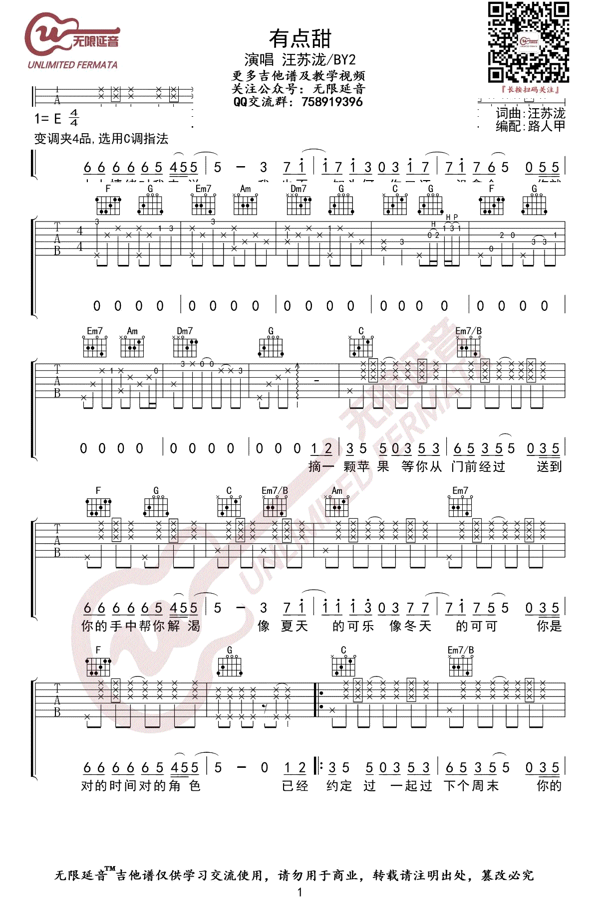 汪苏泷《有点甜》吉他谱选调C六线谱
