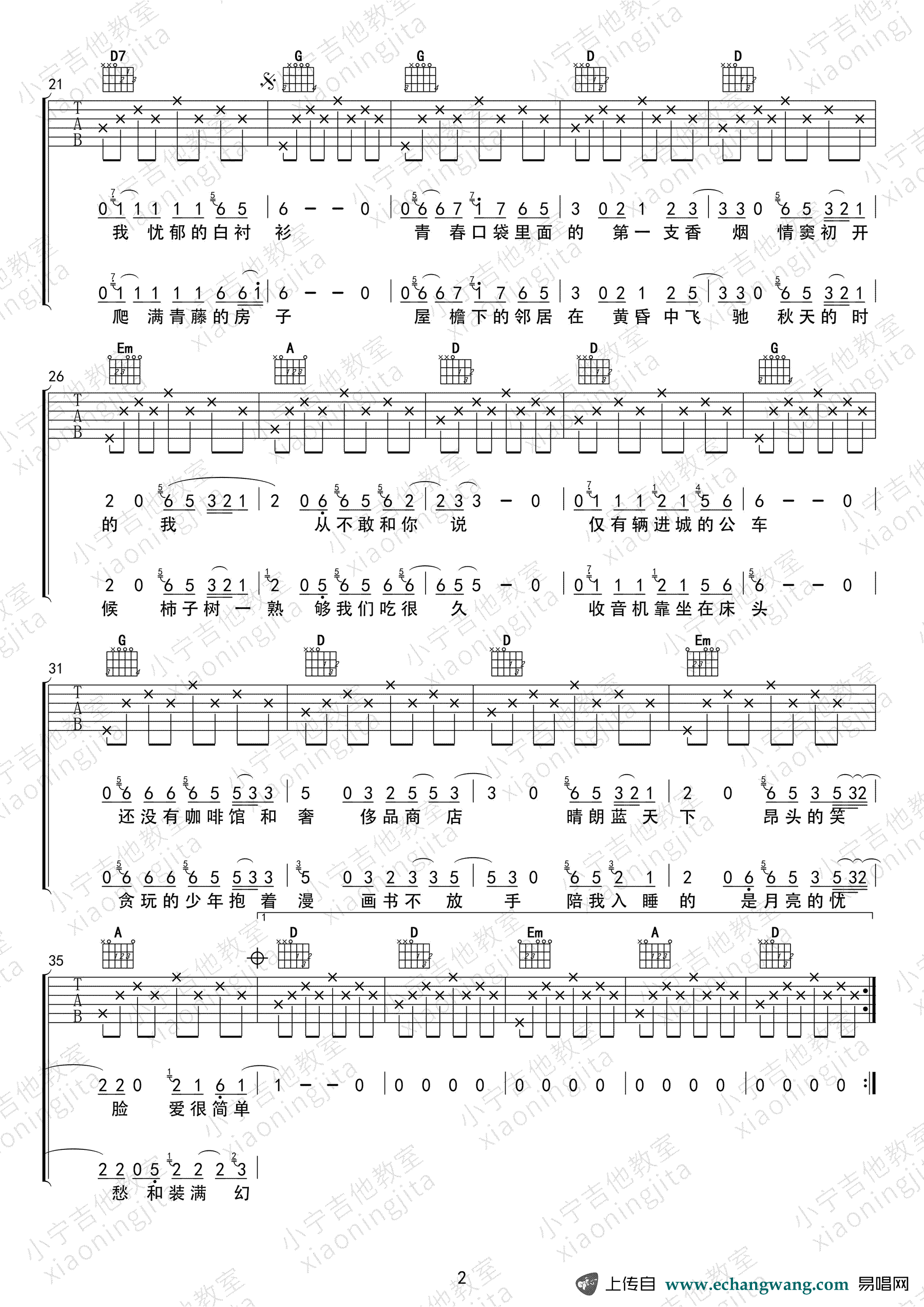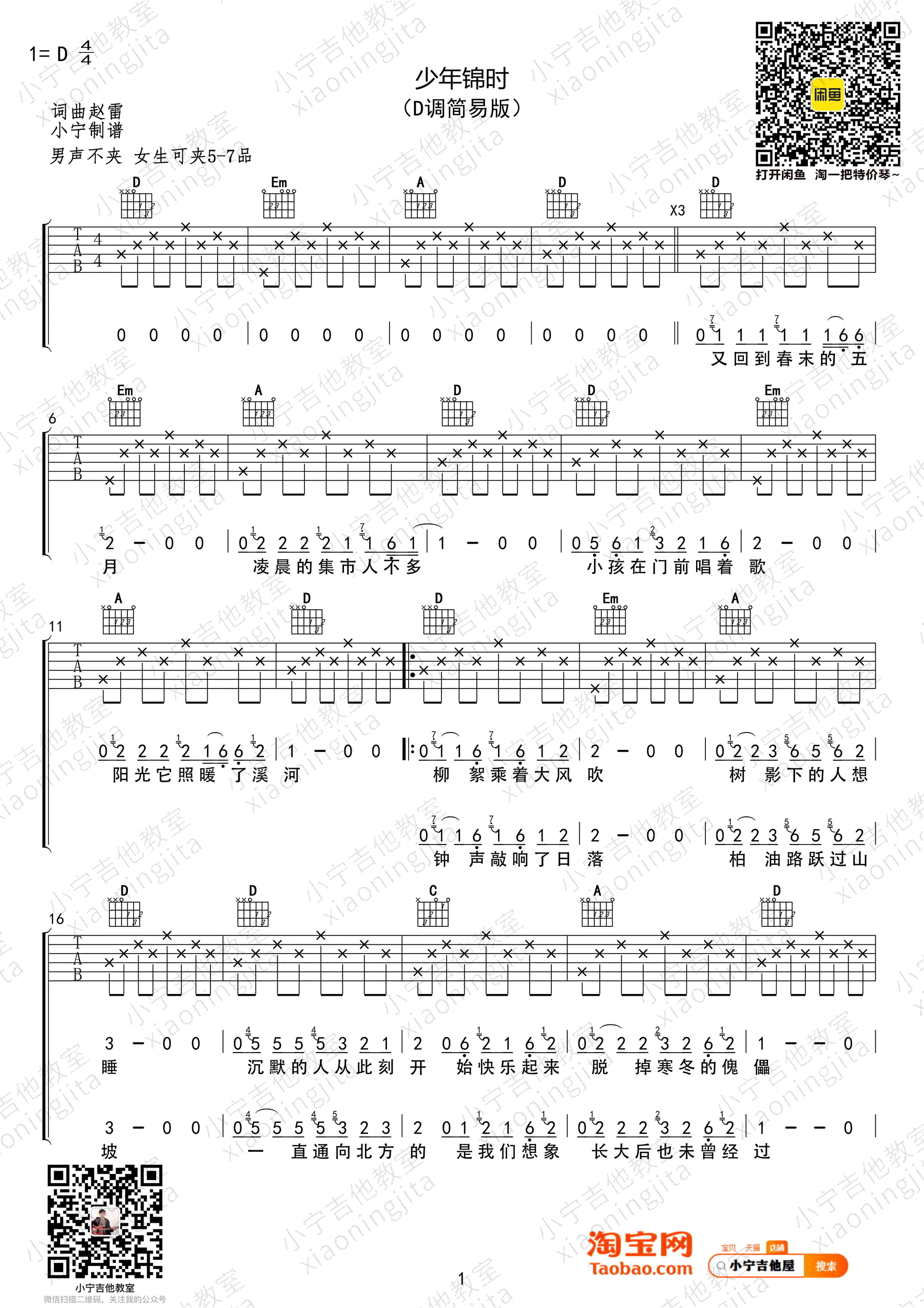 赵雷《少年锦时》吉他谱D调六线谱