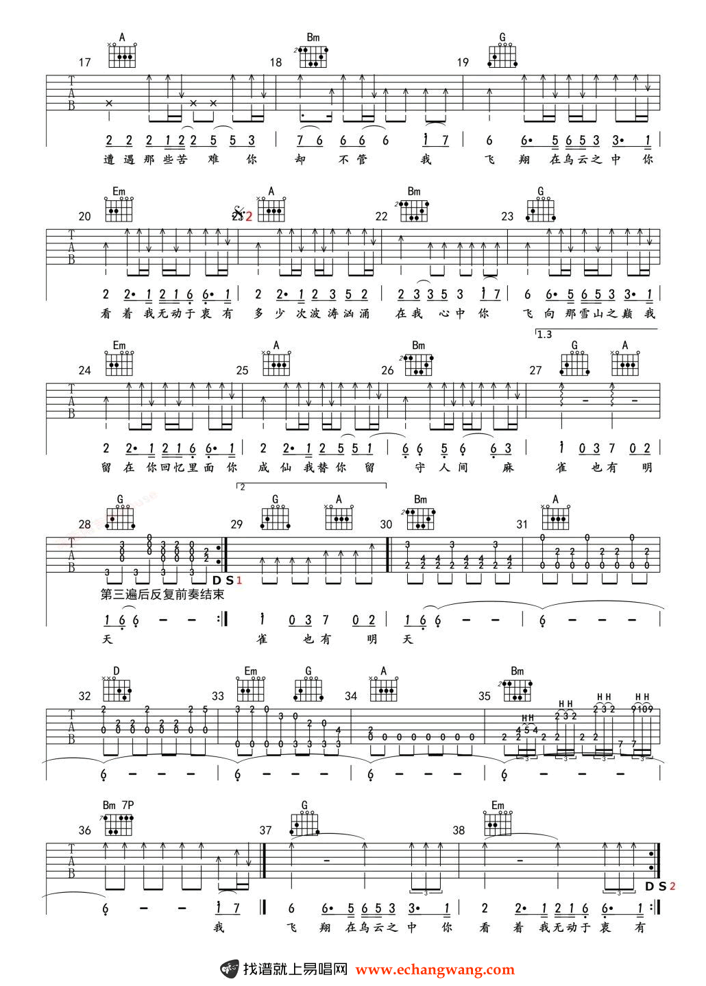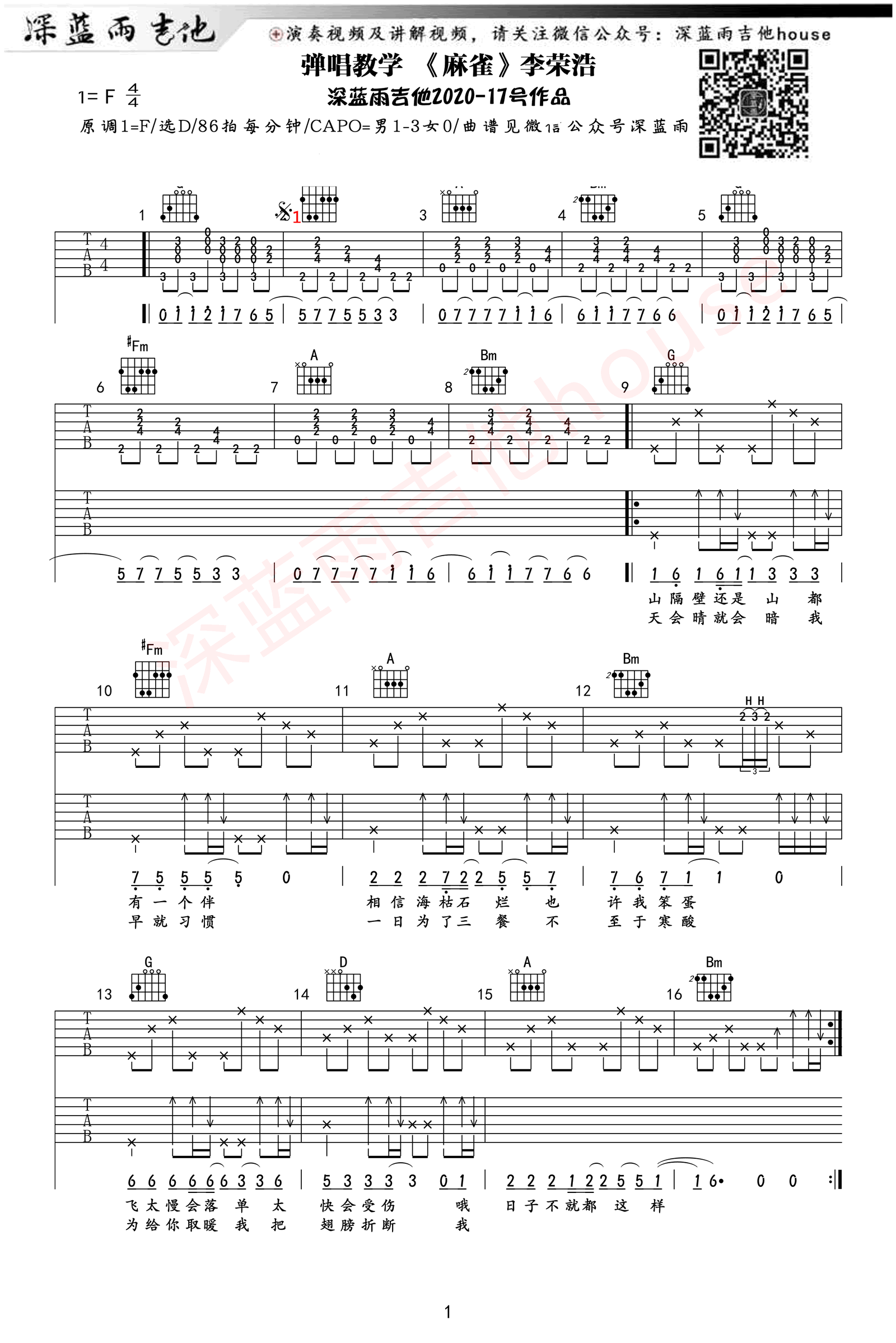 李荣浩《麻雀》吉他谱选调D六线谱